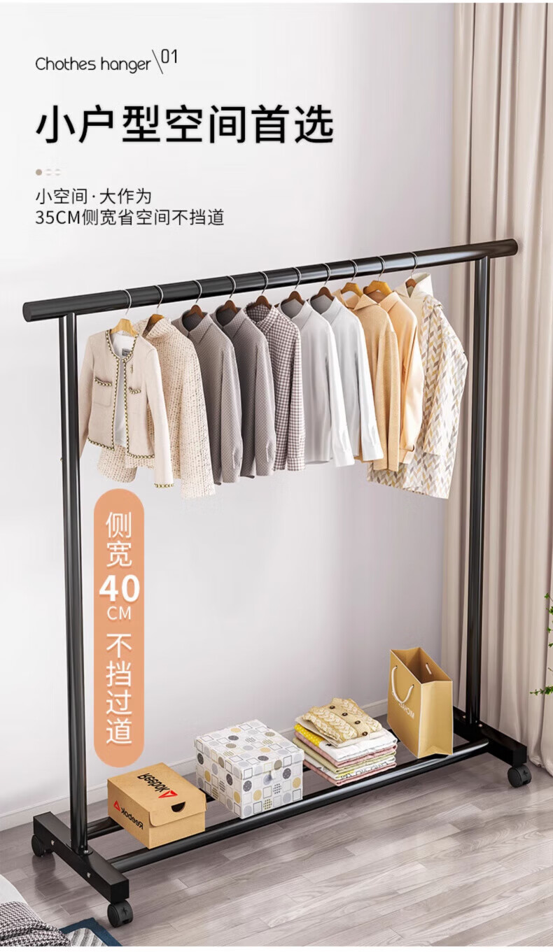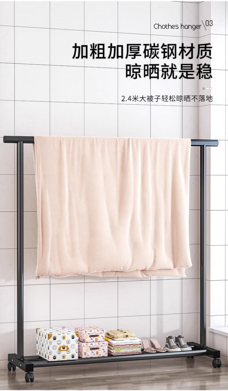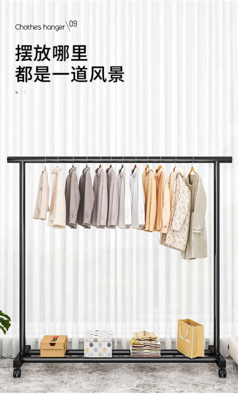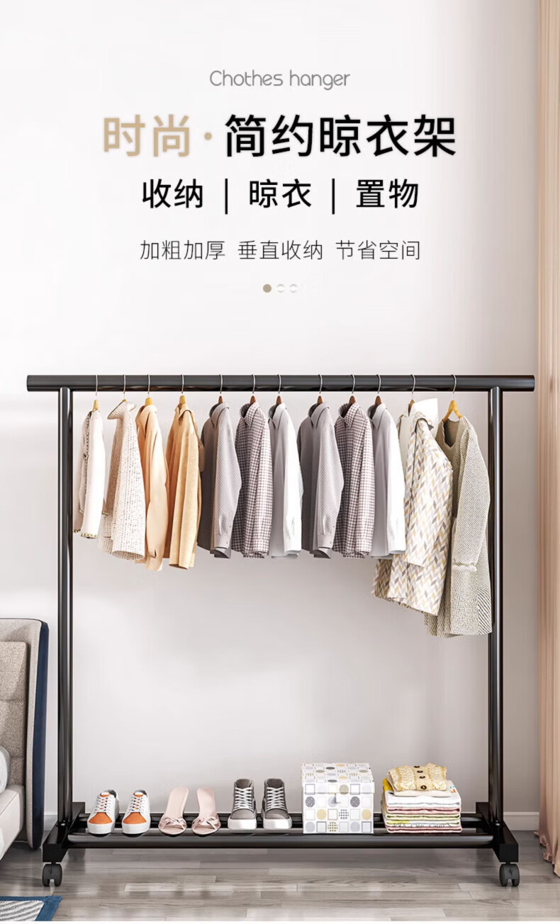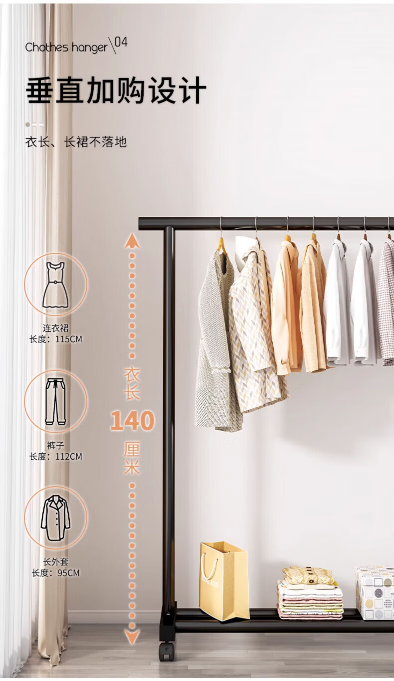 WCZ德国晾衣架落地室内家用挂衣架客厅卧室单杆加厚可移动阳台简易衣 【120cm奶油白】22加粗管+万向轮 强力承重 稳固不晃 不易生锈