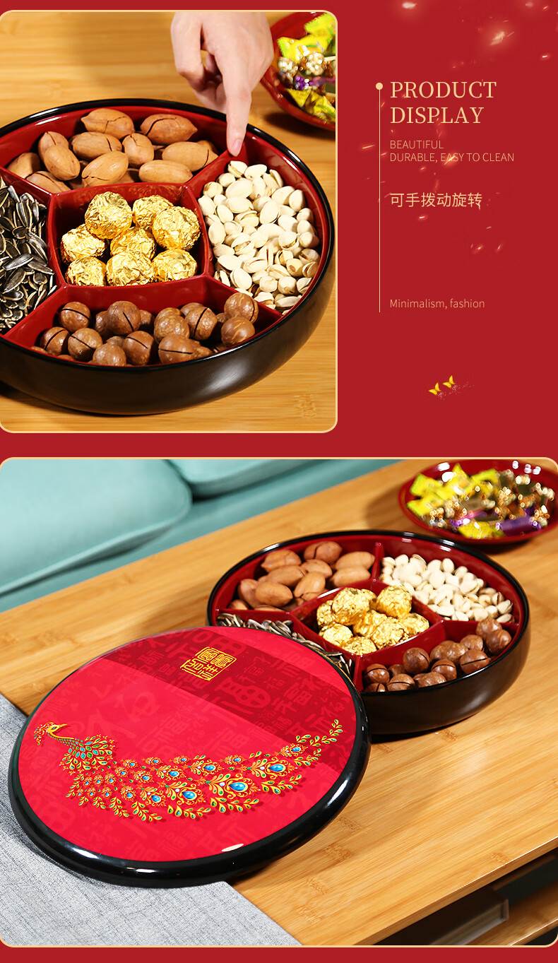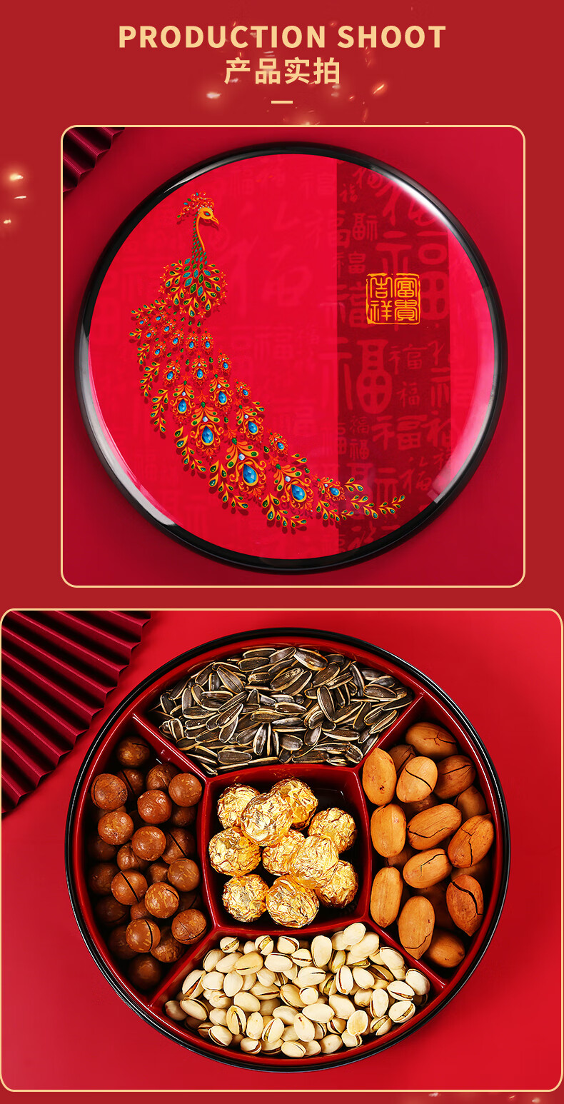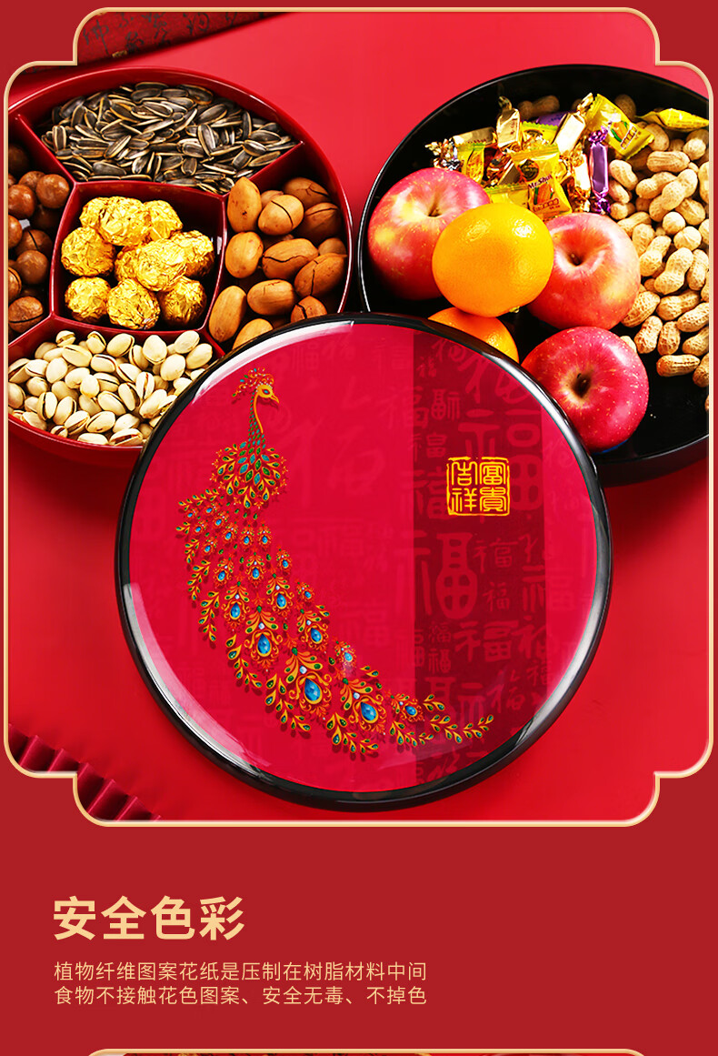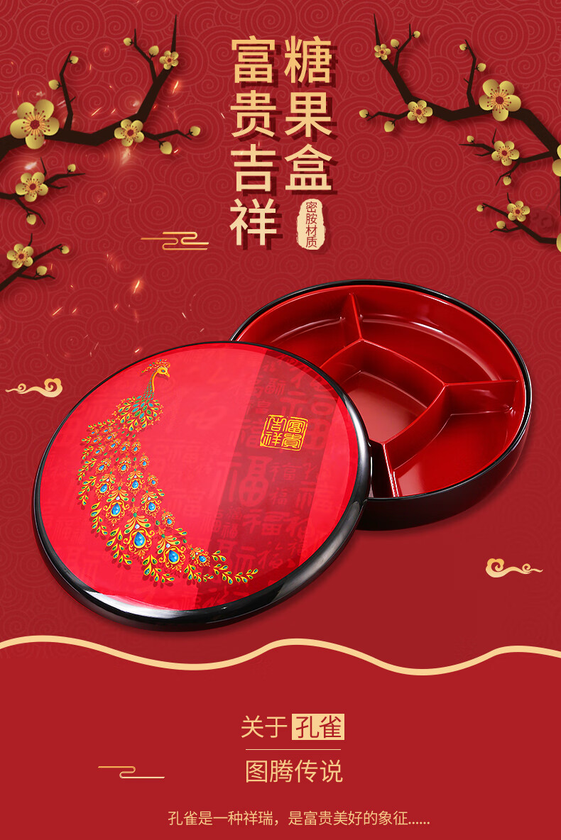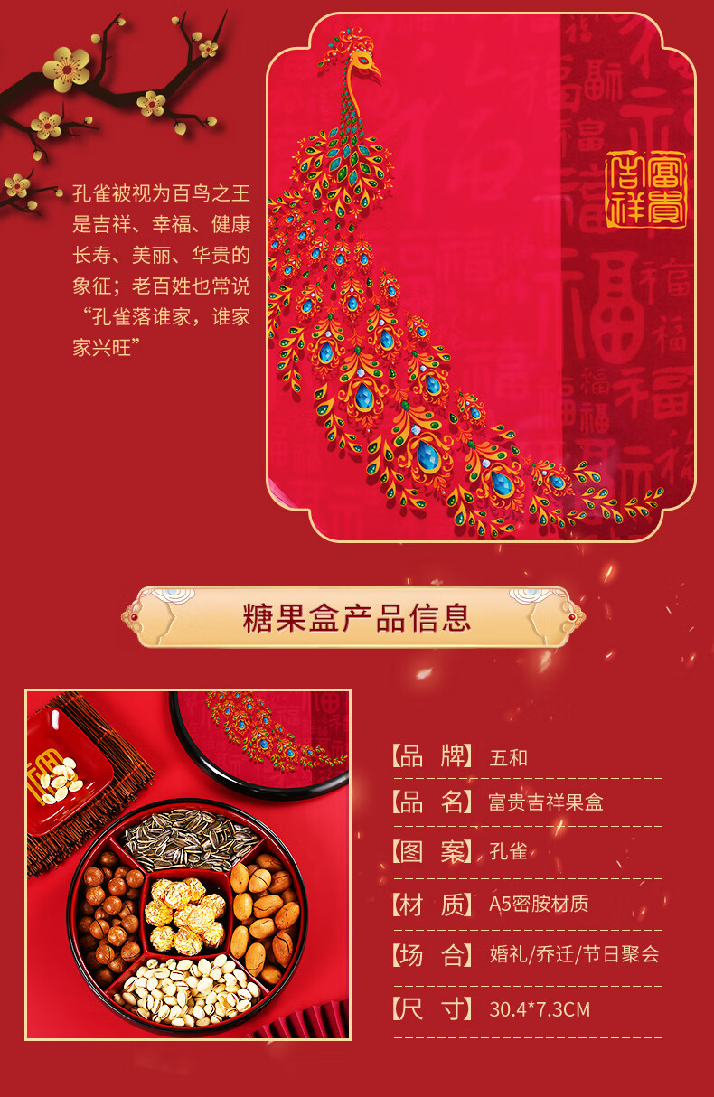 五和(WUHE)孔雀新年干果盒家用客厅茶几乔迁糖果盒坚果零食收纳盒结婚果盘 富贵吉祥-孔雀果盒 1层