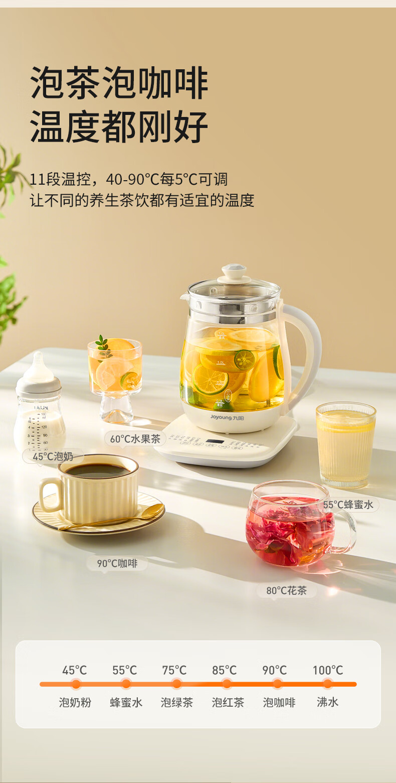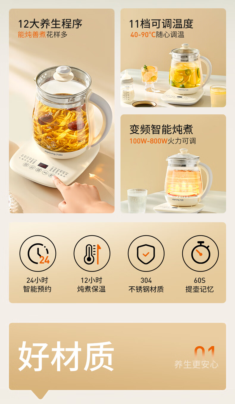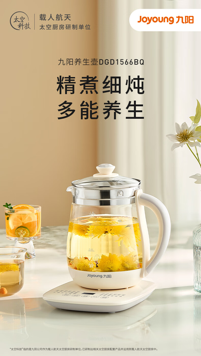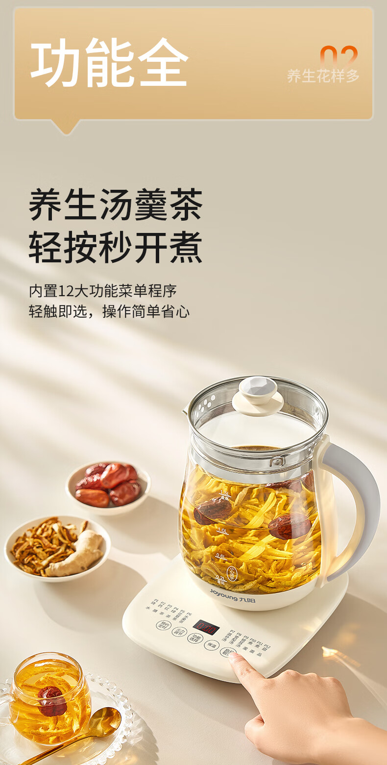 九阳(Joyoung)养生壶迷你玻璃花茶壶煮茶器 12大功能11档温度 0胶水恒温电热烧水壶1.5L 1566BQ