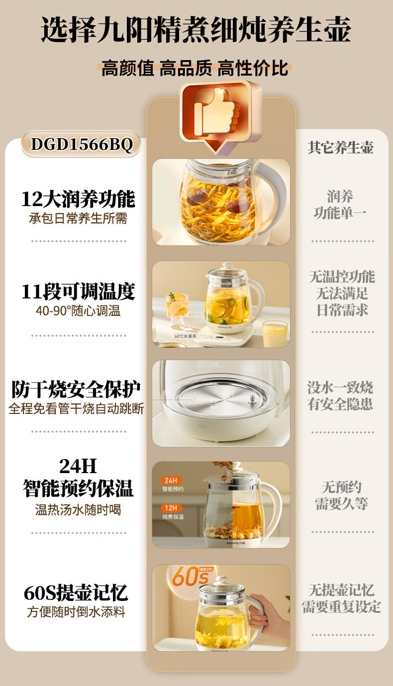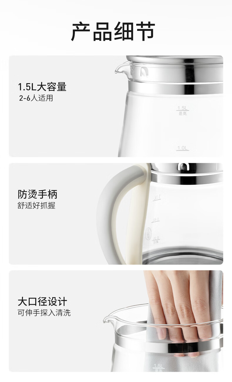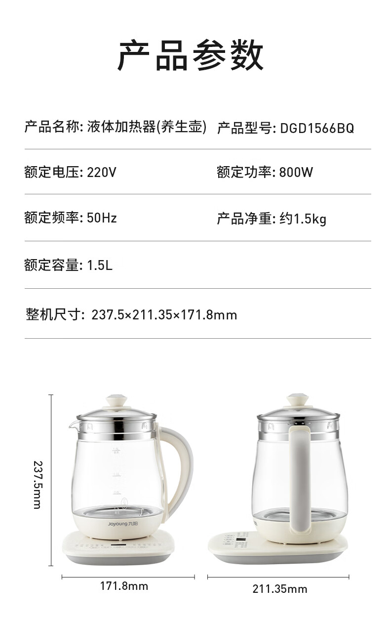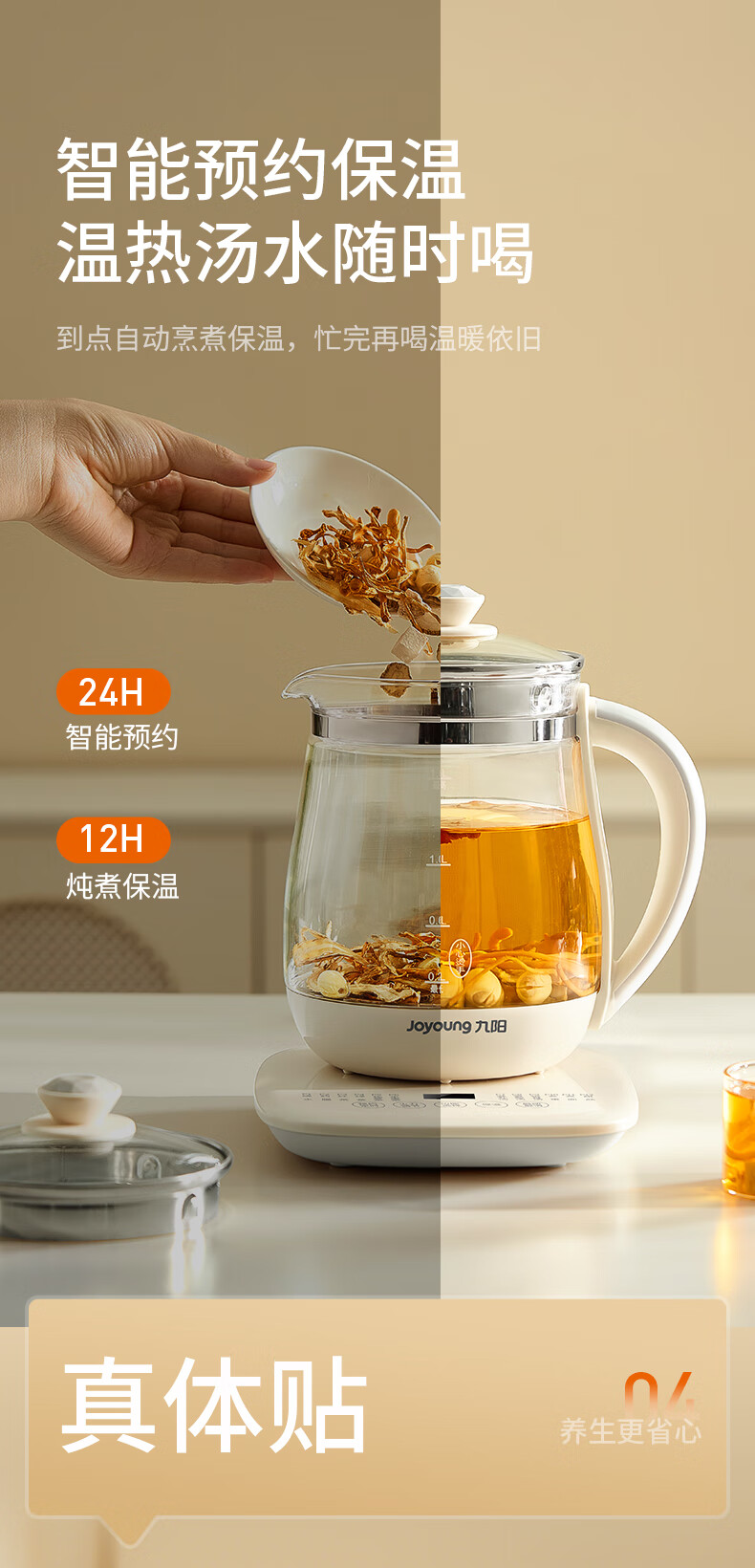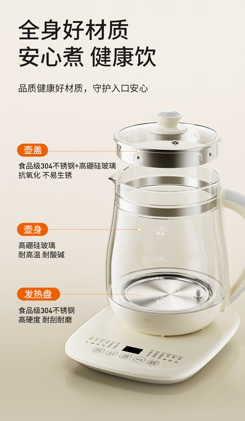 九阳(Joyoung)养生壶迷你玻璃花茶壶煮茶器 12大功能11档温度 0胶水恒温电热烧水壶1.5L 1566BQ