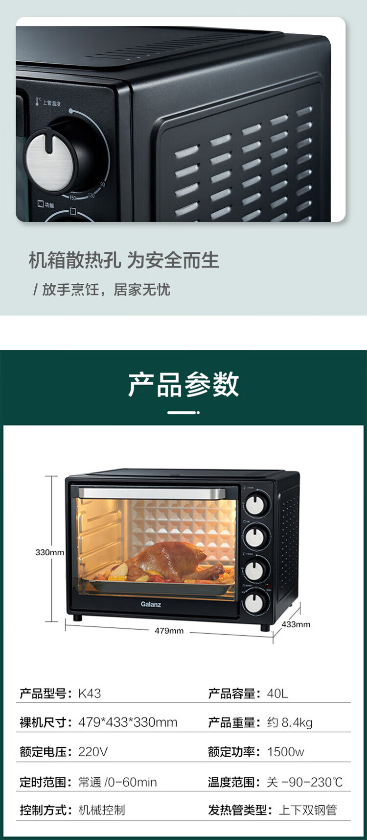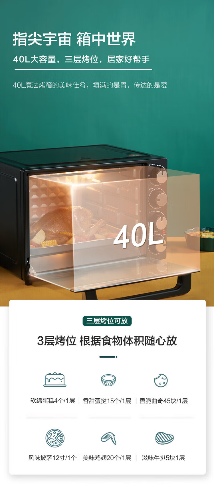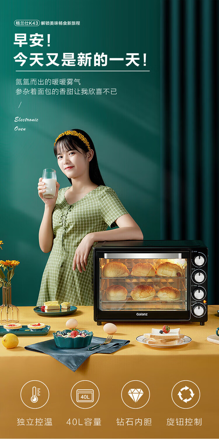 格兰仕电烤箱 烤箱家用 烘焙烤箱40L超大容量内置可视炉灯上下独立控温多层多功能 黑色 40L