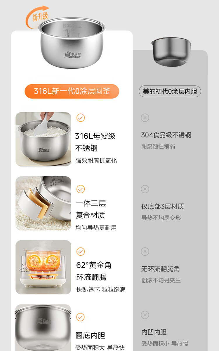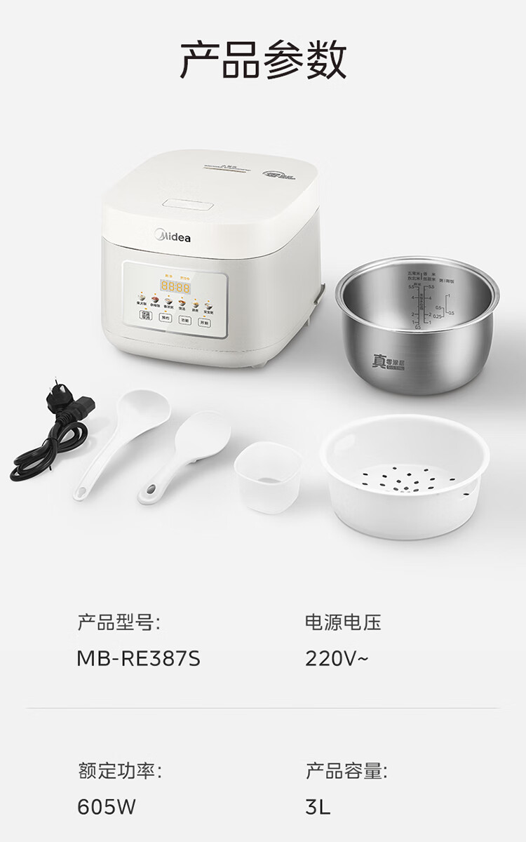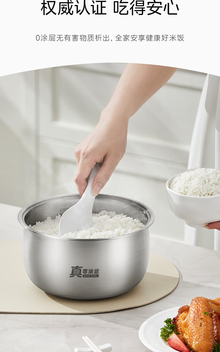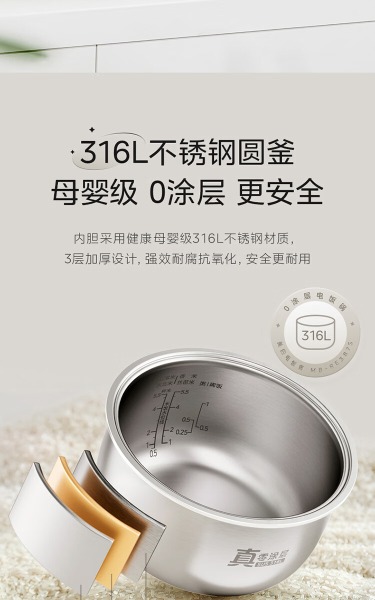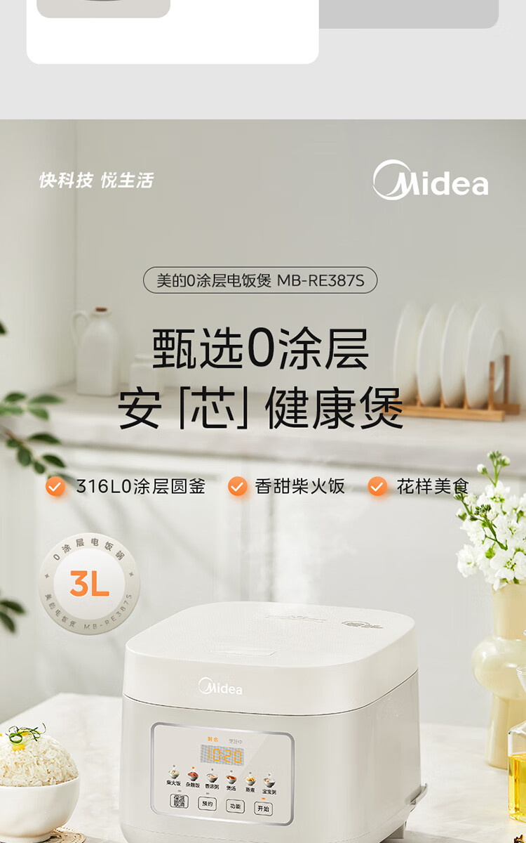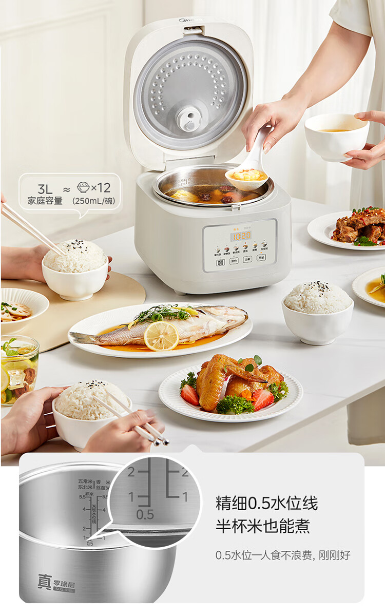 美的(Midea)电饭煲 3L家用电饭锅 316L不锈钢内胆无涂层煮饭锅 2-3人多功能0涂层煲汤煮粥锅米饭锅MB-RE387S