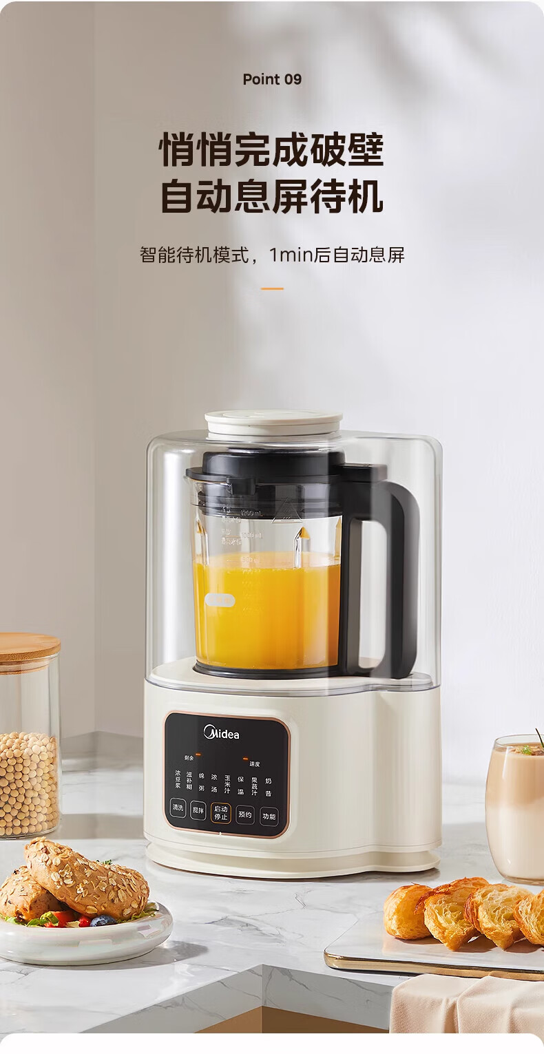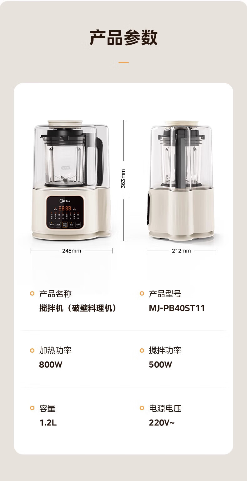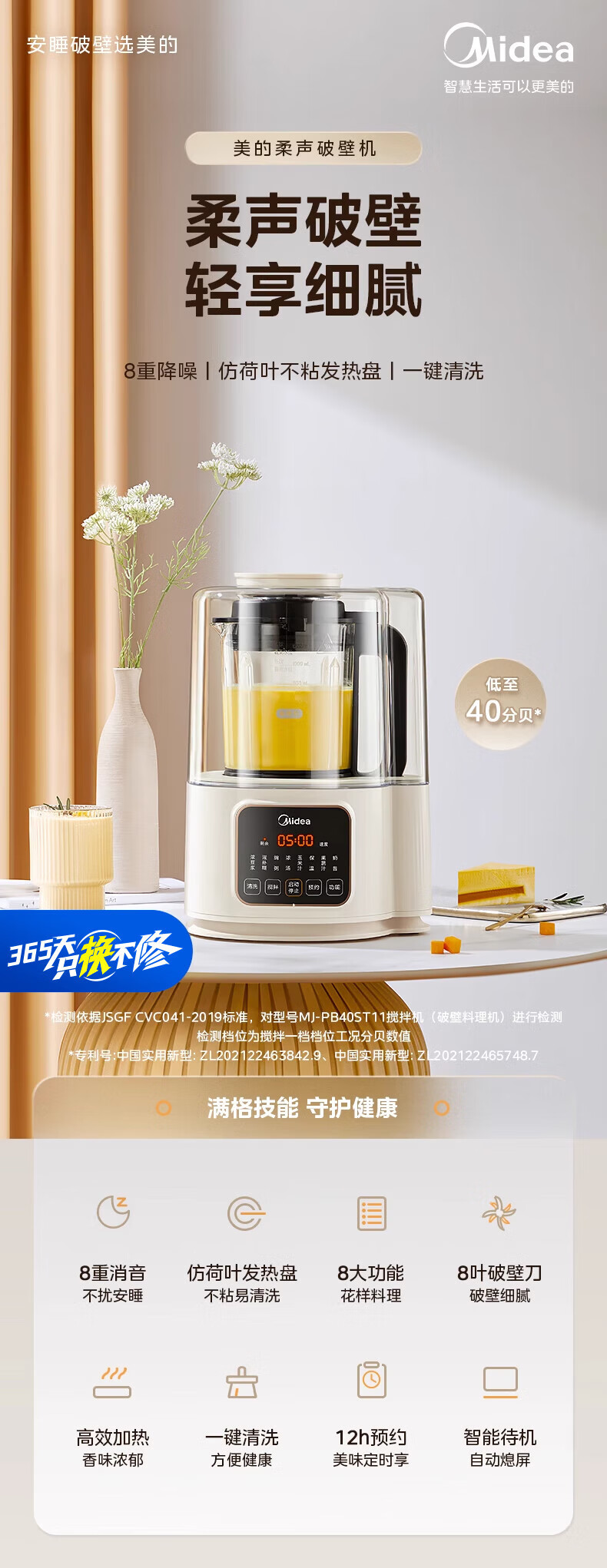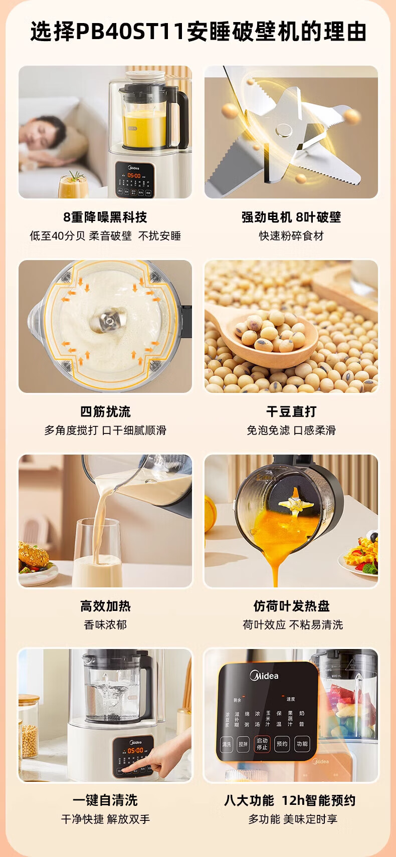 美的(Midea)破壁机家用豆浆机全自动清洗1.2L小型轻音降噪榨汁料理机2-3人用五谷杂粮辅食机3-4人 PB40ST11