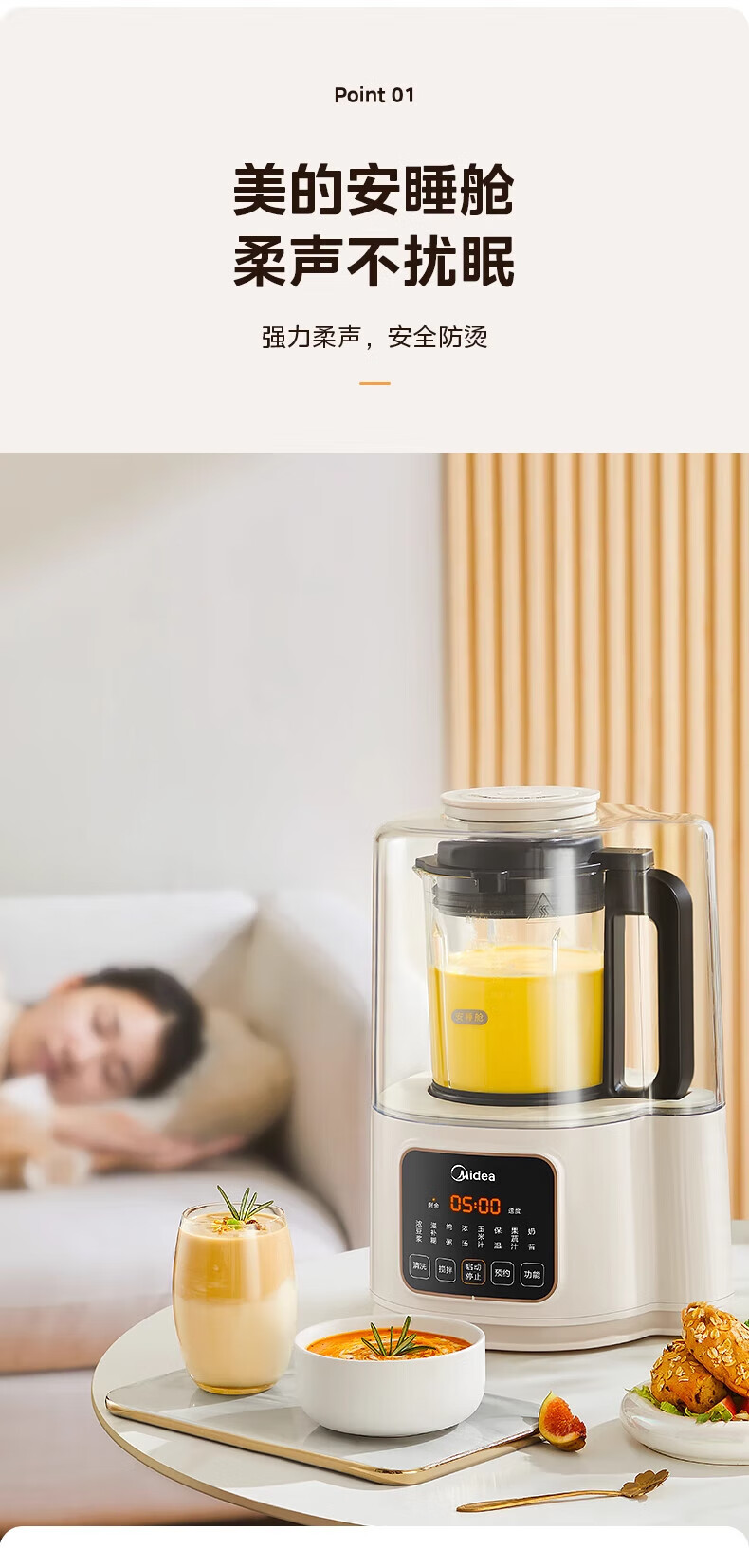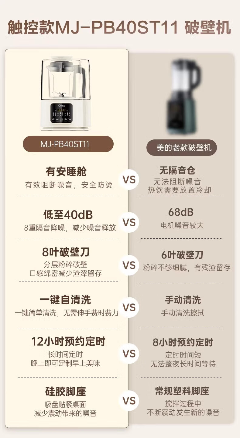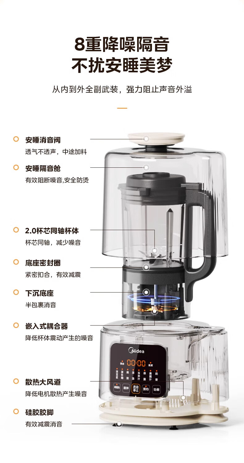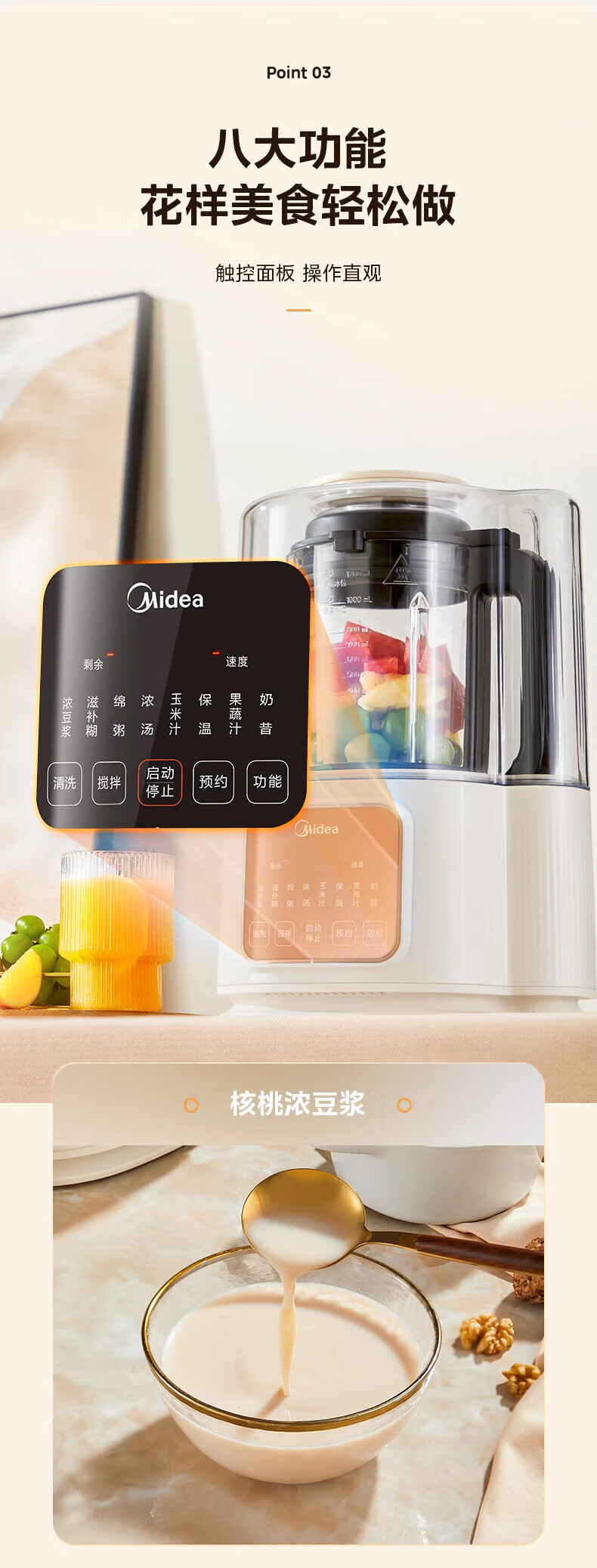 美的(Midea)破壁机家用豆浆机全自动清洗1.2L小型轻音降噪榨汁料理机2-3人用五谷杂粮辅食机3-4人 PB40ST11