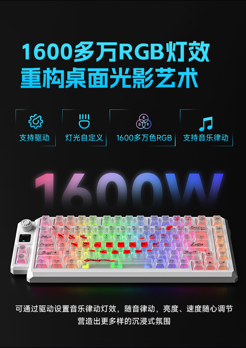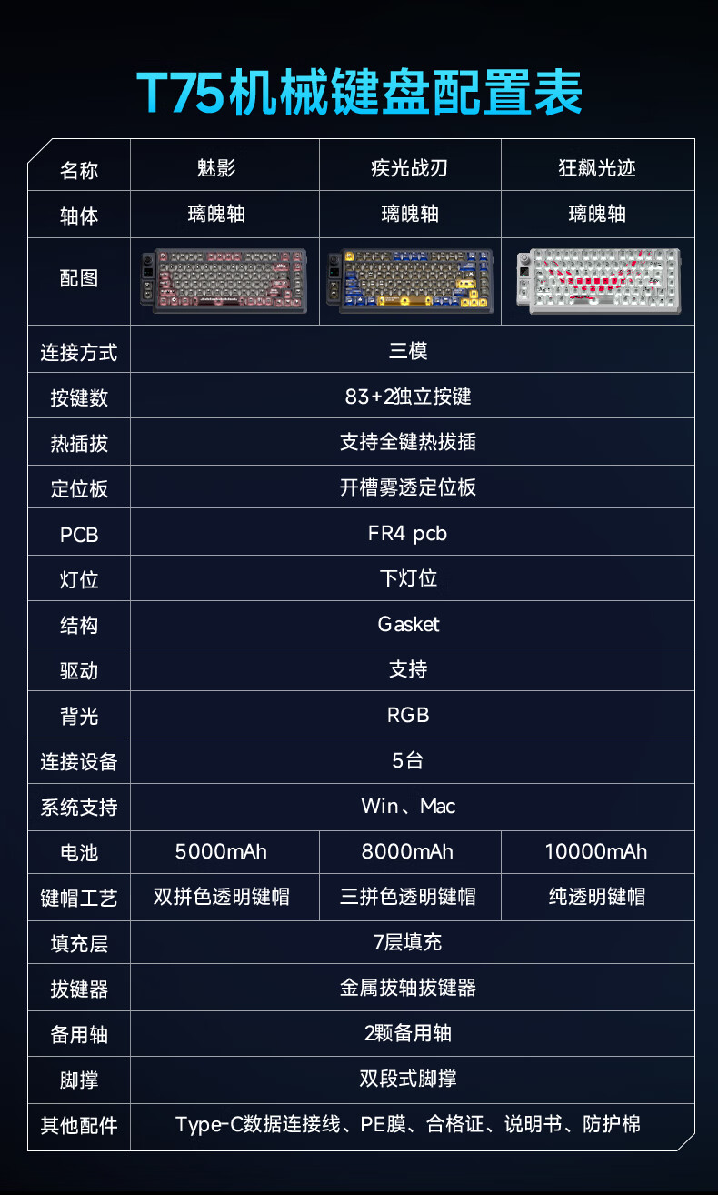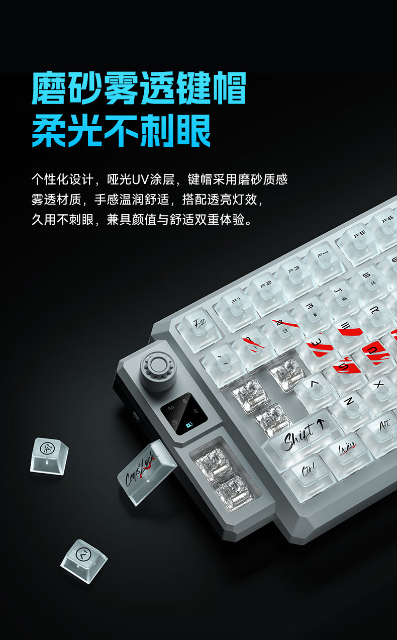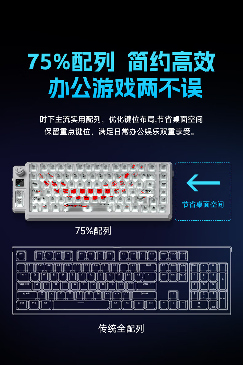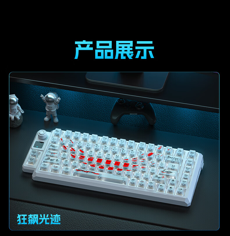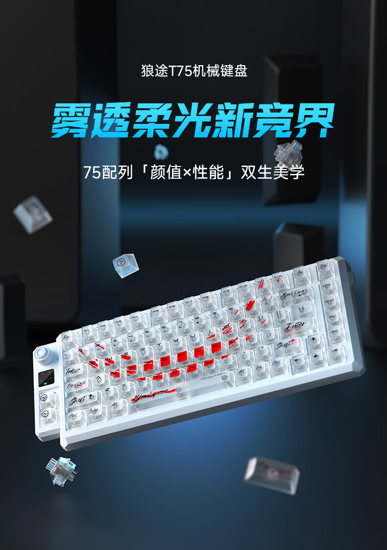 狼途T75三模透明键盘高颜值机械键盘雾透键帽无线蓝牙有线客制化电竞游戏键盘 狂飙光迹-璃魄轴-三模10000mAh