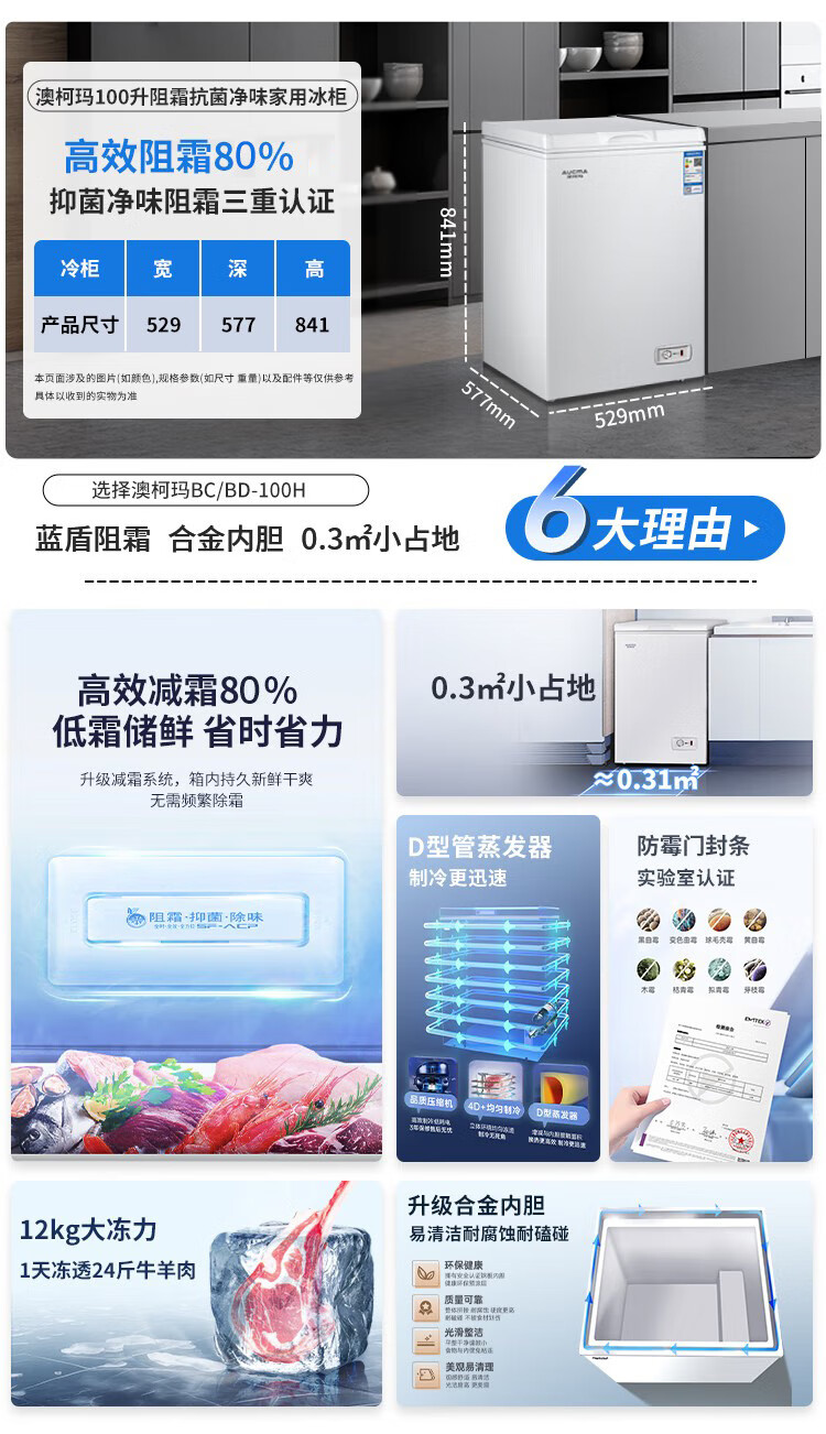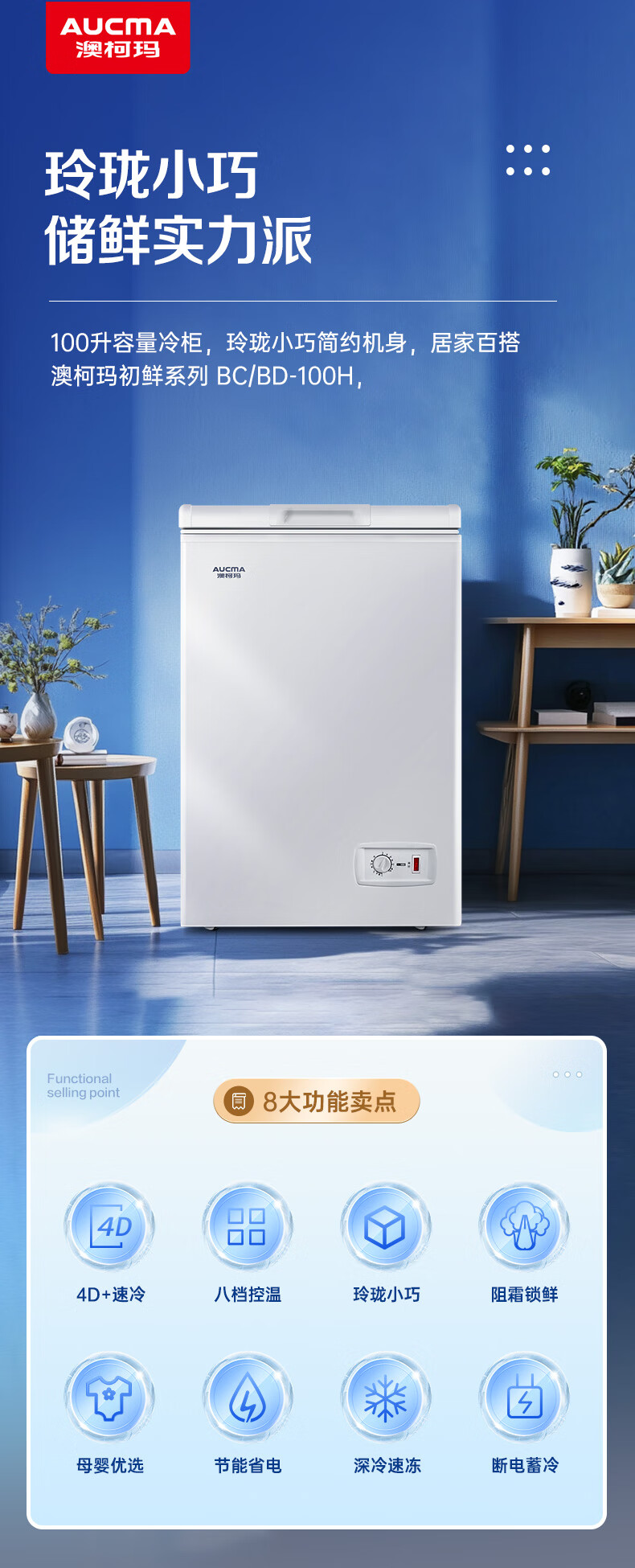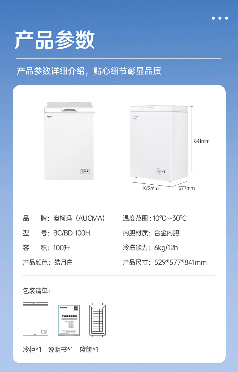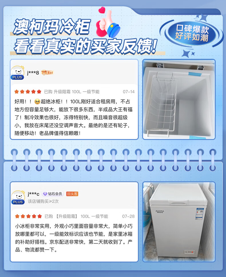 澳柯玛(AUCMA)100升单温冷柜家用减霜小冰柜冷藏柜冷冻柜小型冷柜卧式顶开门冰箱一级能效 BC/BD-100H 以旧换新