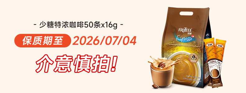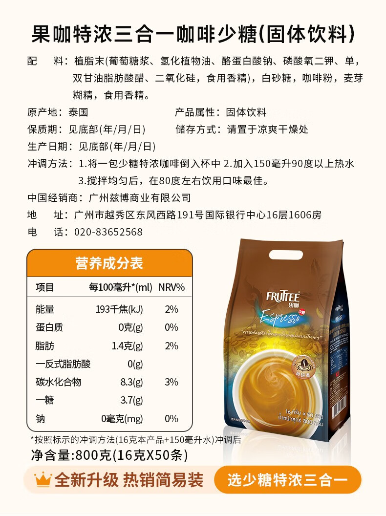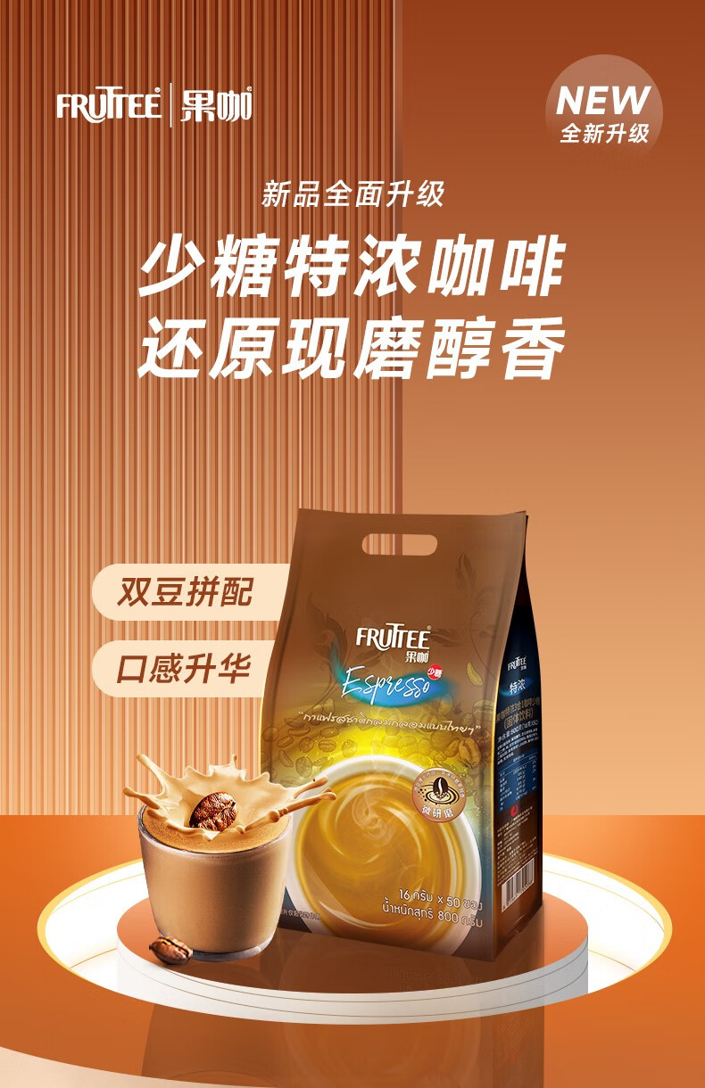 果咖(FRUTTEE)泰国原装进口速溶三合一健康少糖学生醇厚现磨口感特浓咖啡 果咖少糖特浓咖啡(16g*50条)