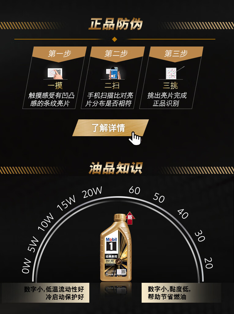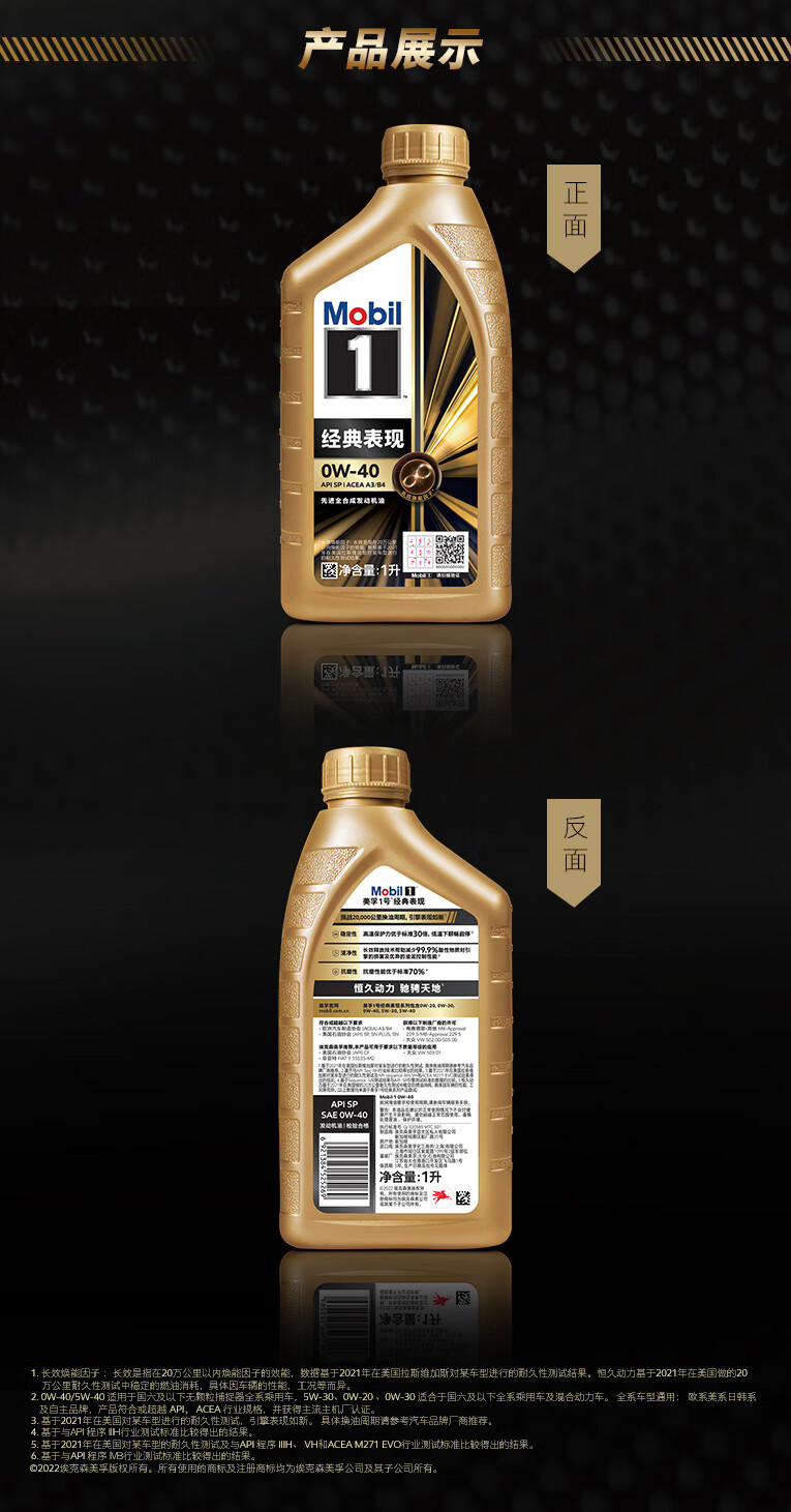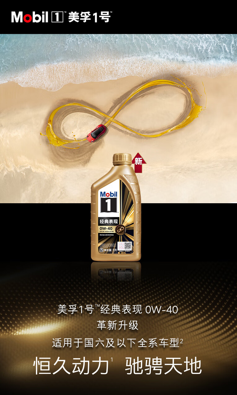 美孚(Mobil)金美孚 先进全合成小金美汽机油经典表现 0W-40 SP 1L*6 汽车保养