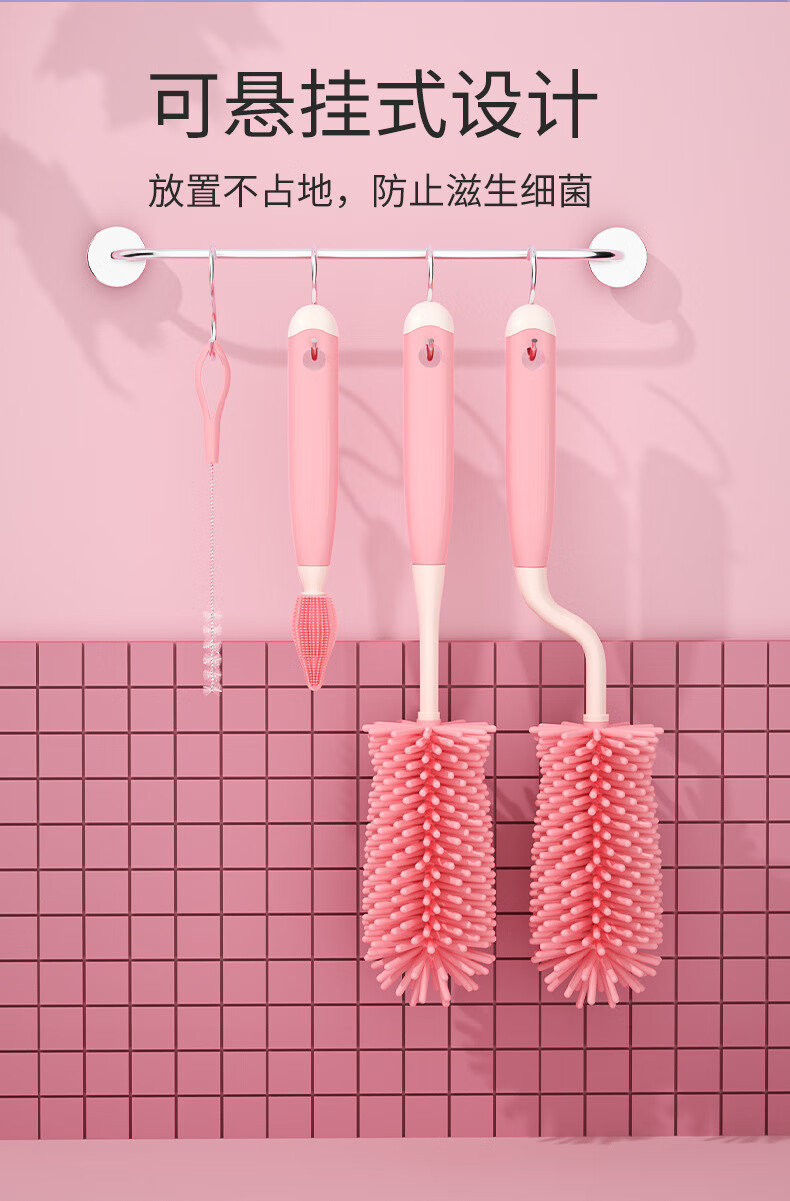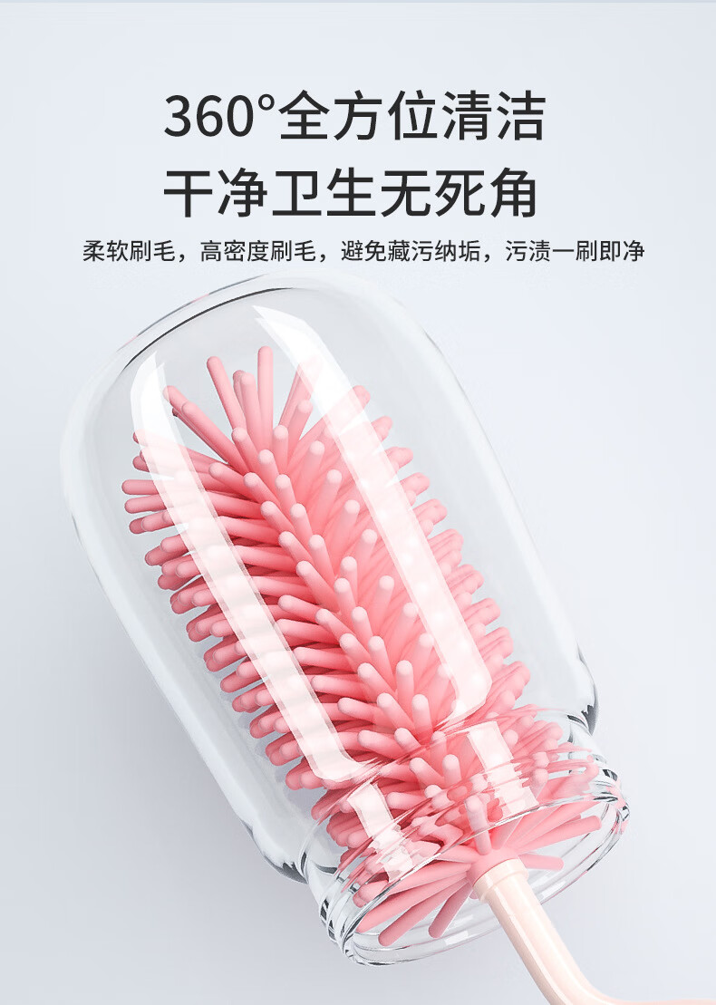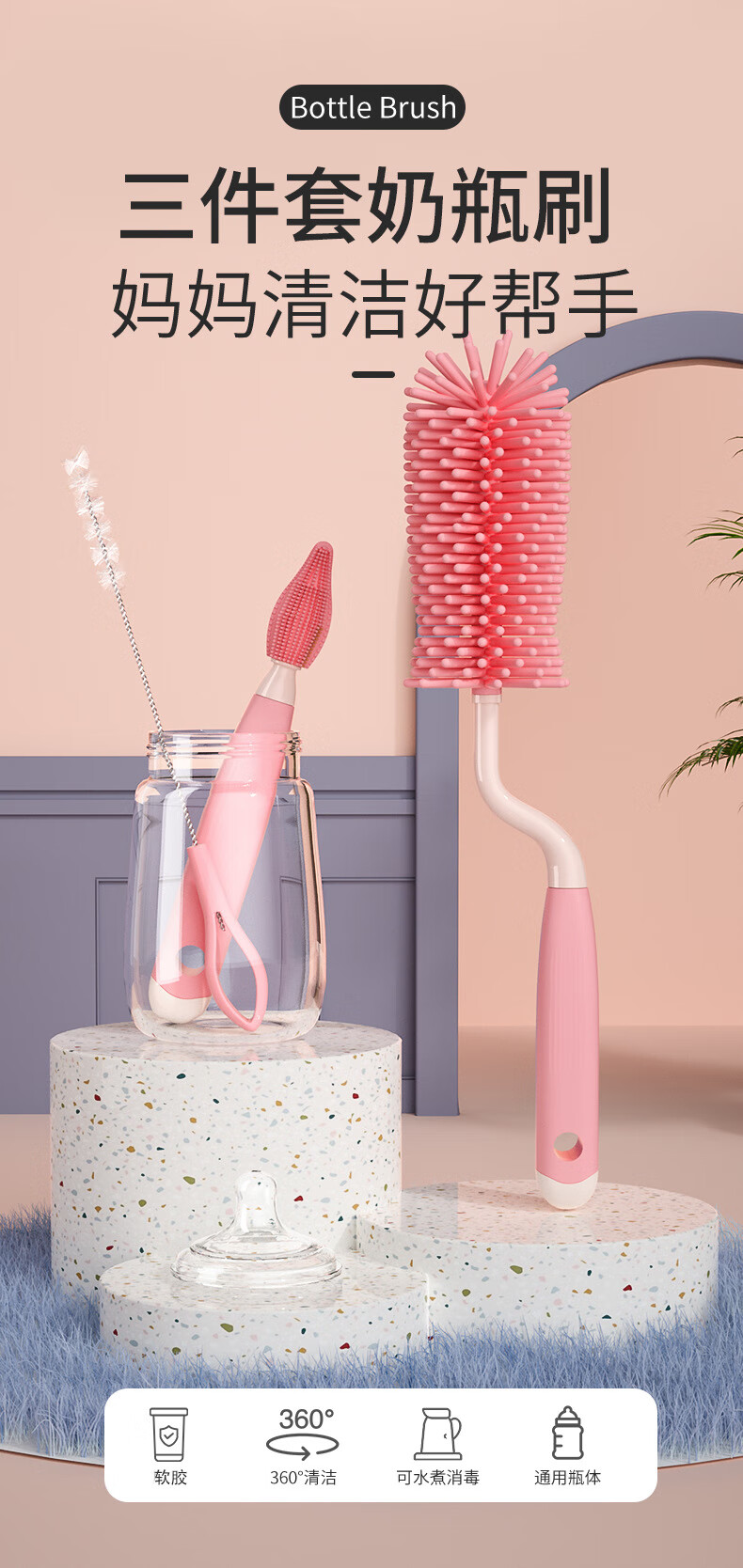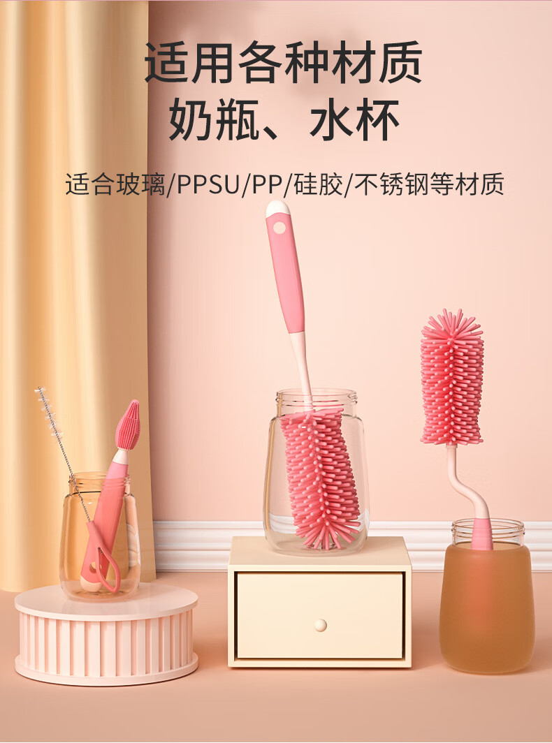 【严选百货】宝宝奶瓶刷清洗刷新生奶嘴刷吸管刷套装旋转洗奶瓶清 粉色直柄刷3件套(opp袋