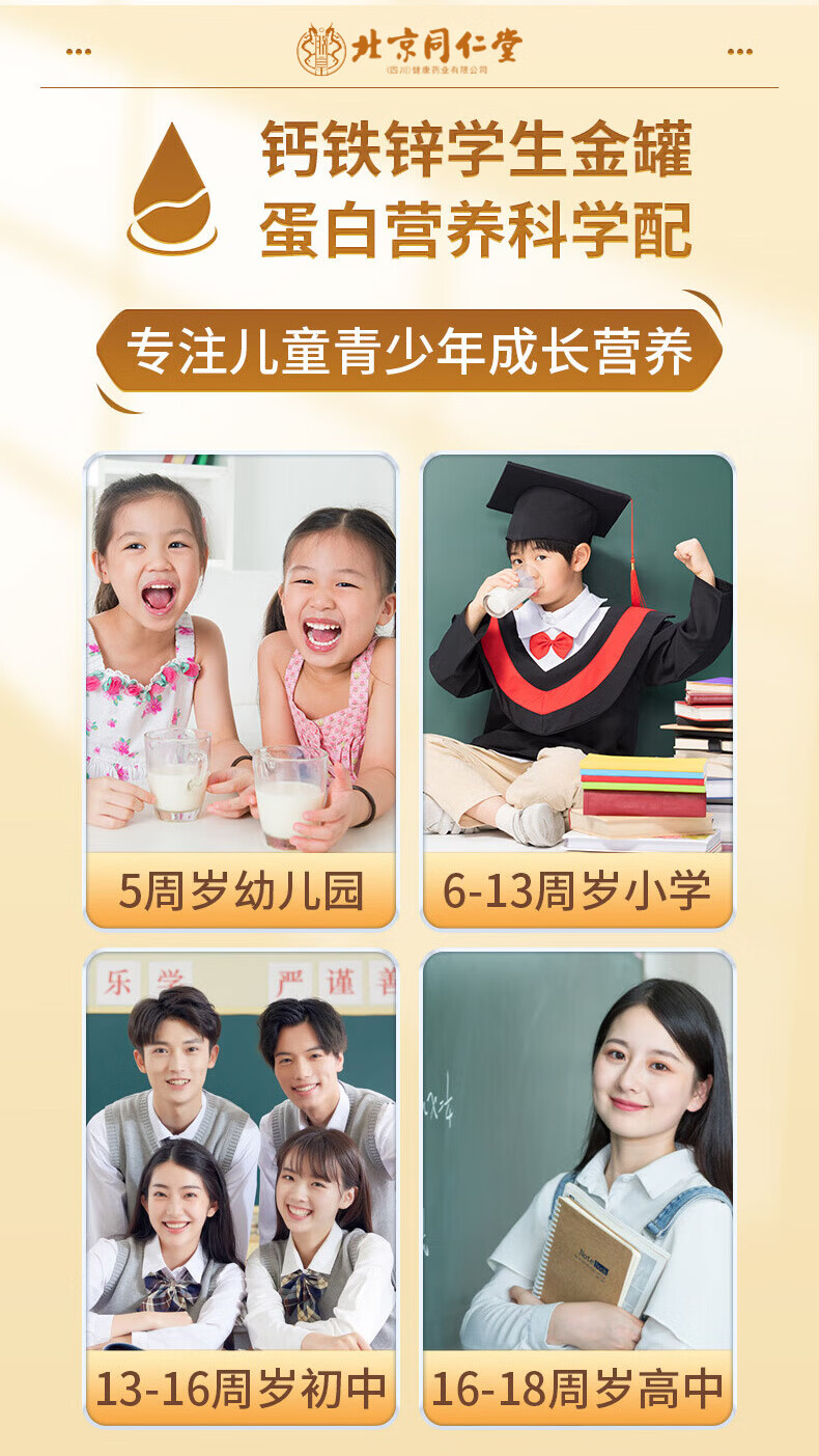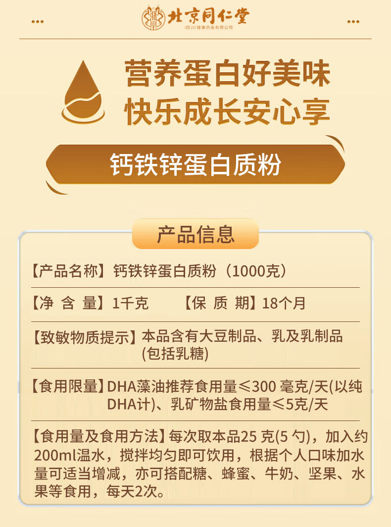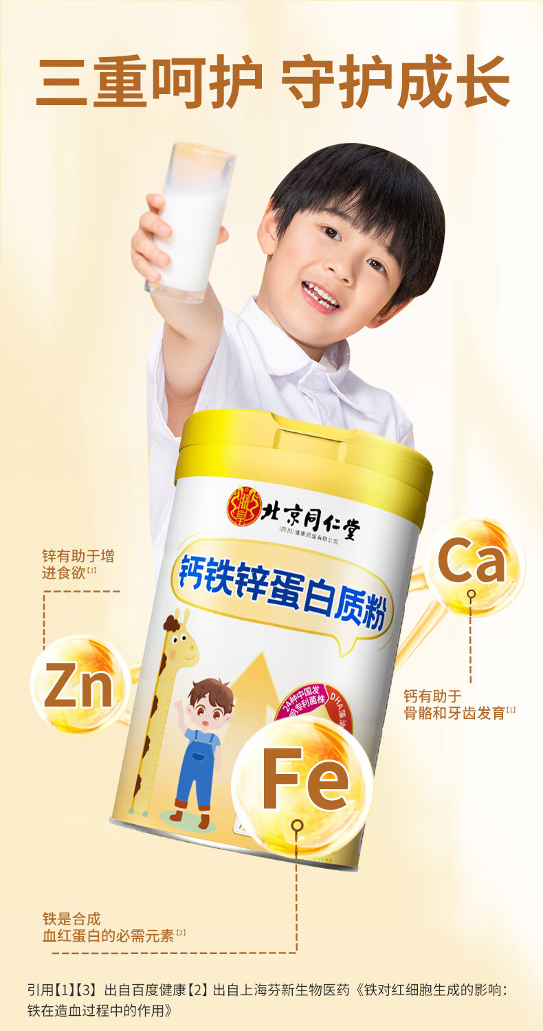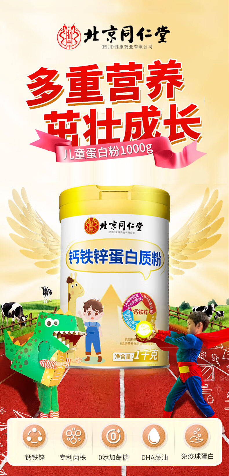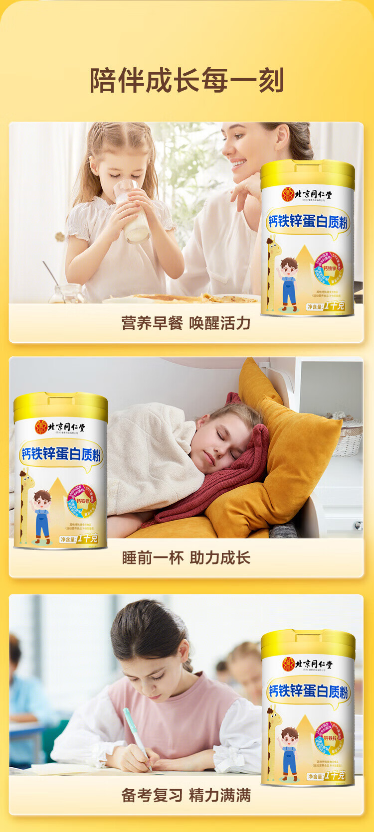 同仁堂钙铁锌蛋白质粉 儿童蛋白粉3一7一15岁儿童营养 青少年免疫球蛋白 1000g*2罐