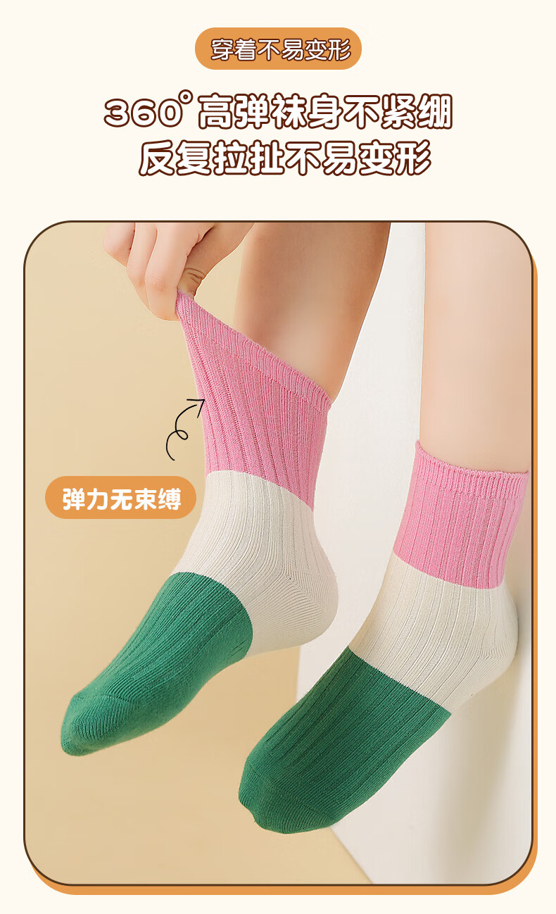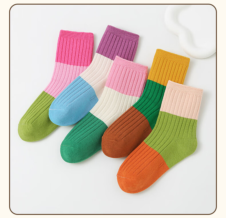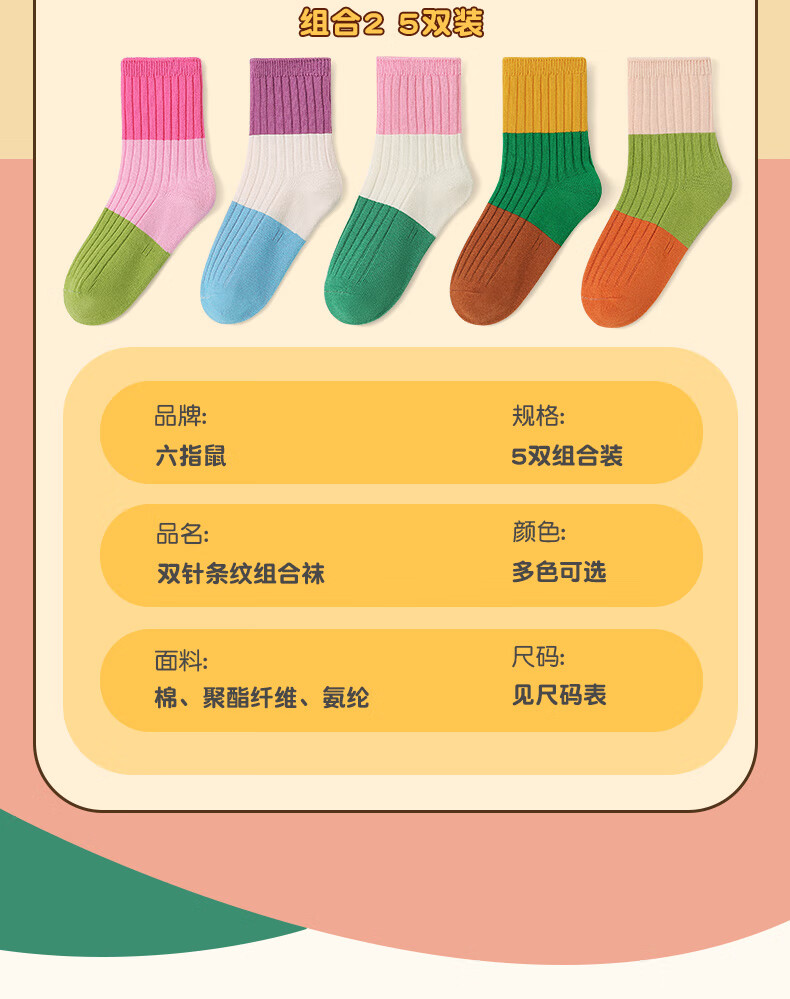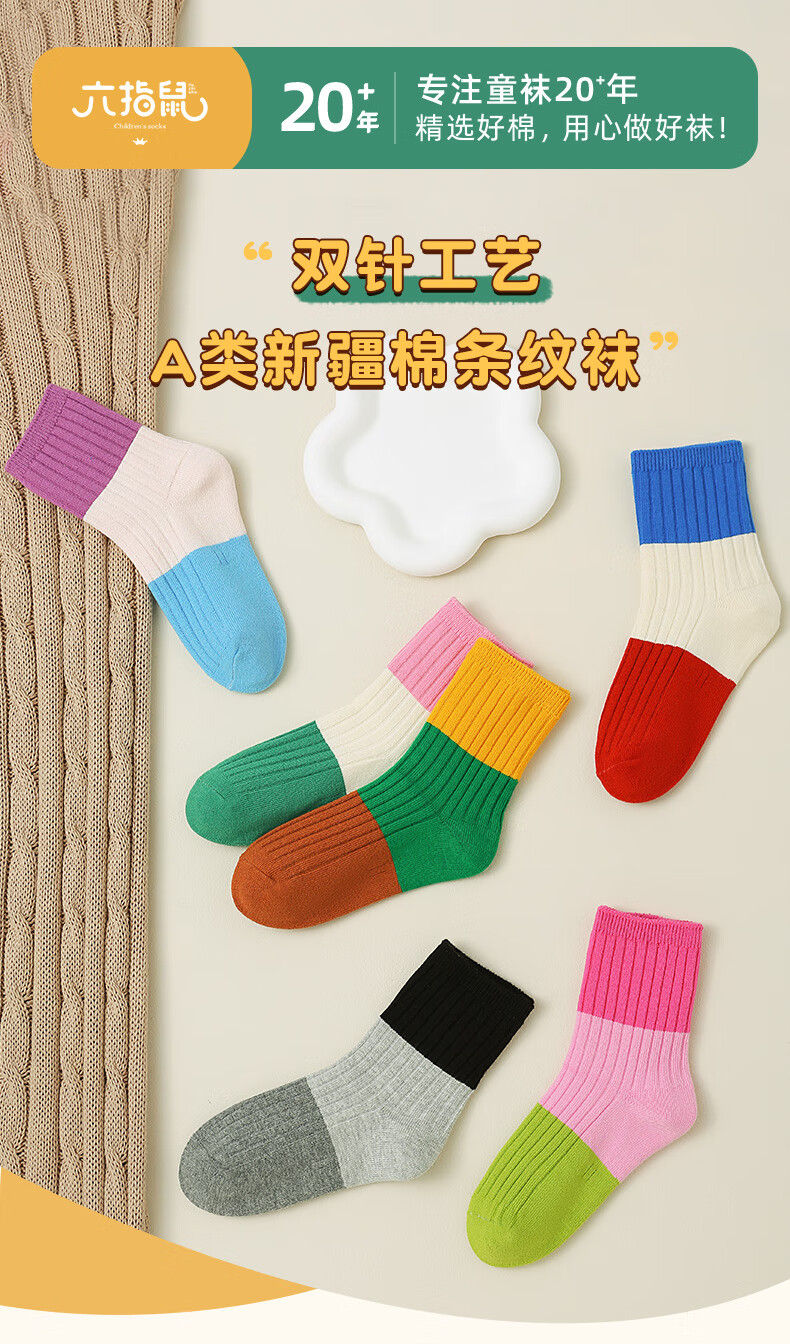 六指鼠双针儿童袜子春秋冬季男童女童宝宝精梳棉小孩中大童时尚条纹中筒 92A(双针三原色)男 5双 均码 建议4-6周岁(袜标6-9岁)