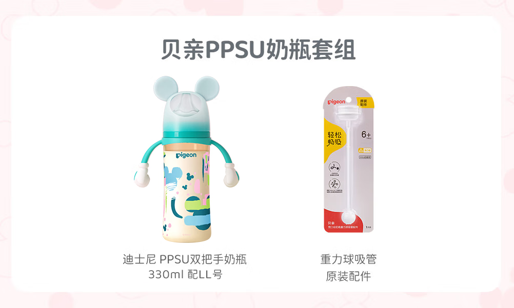 贝亲(Pigeon)PPSU双把手奶瓶套组 (330ml奶瓶 LL号奶嘴 重力球吸管配件) 9月+