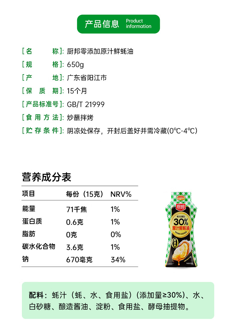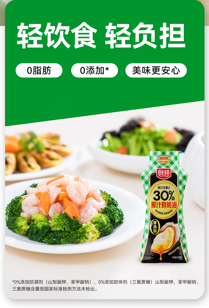 厨邦原汁鲜蚝油 650g 【30%蚝汁0添加0脂肪】挤挤装 调味提鲜调料自营