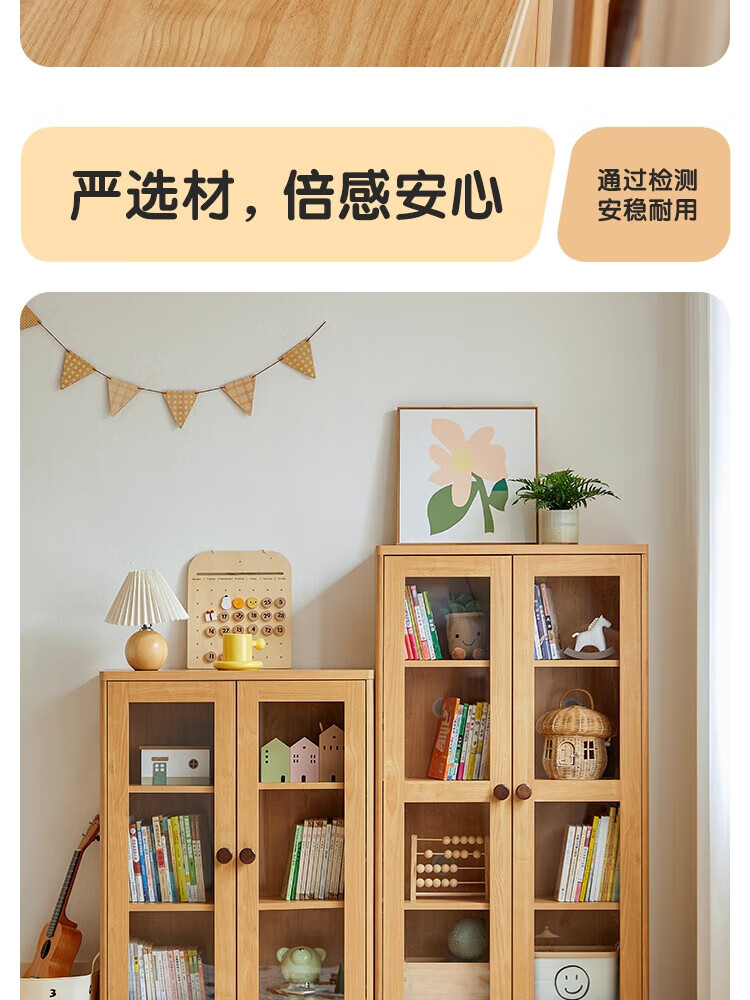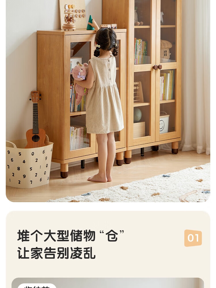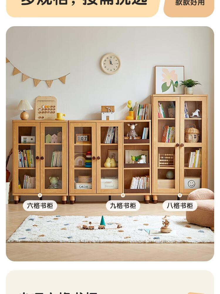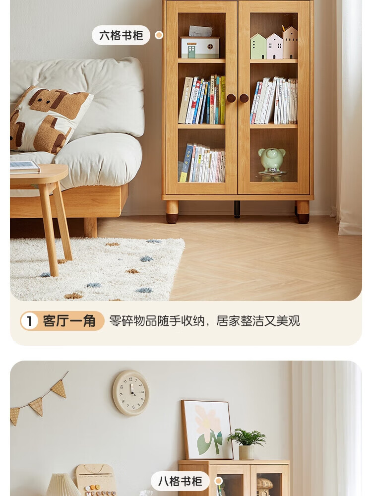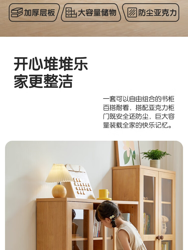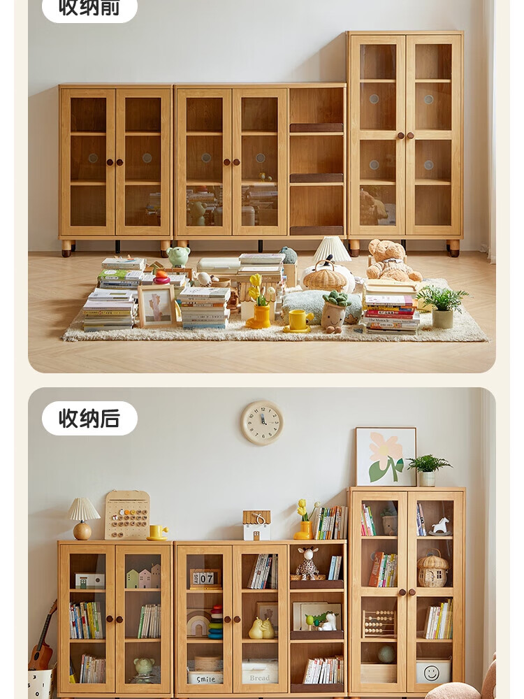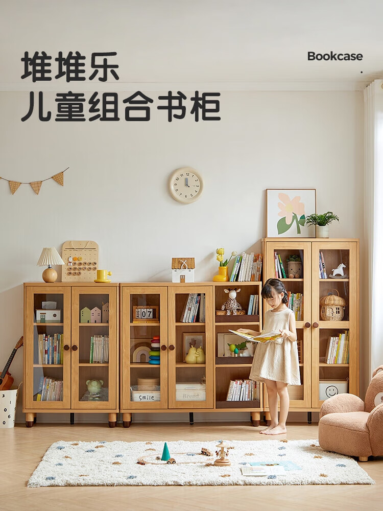 林氏家居儿童书柜实木脚书架客厅落地家用带门书橱立柜收纳储物柜LH277X1 【原木色】6格书柜*1