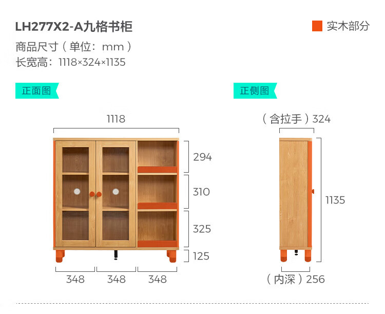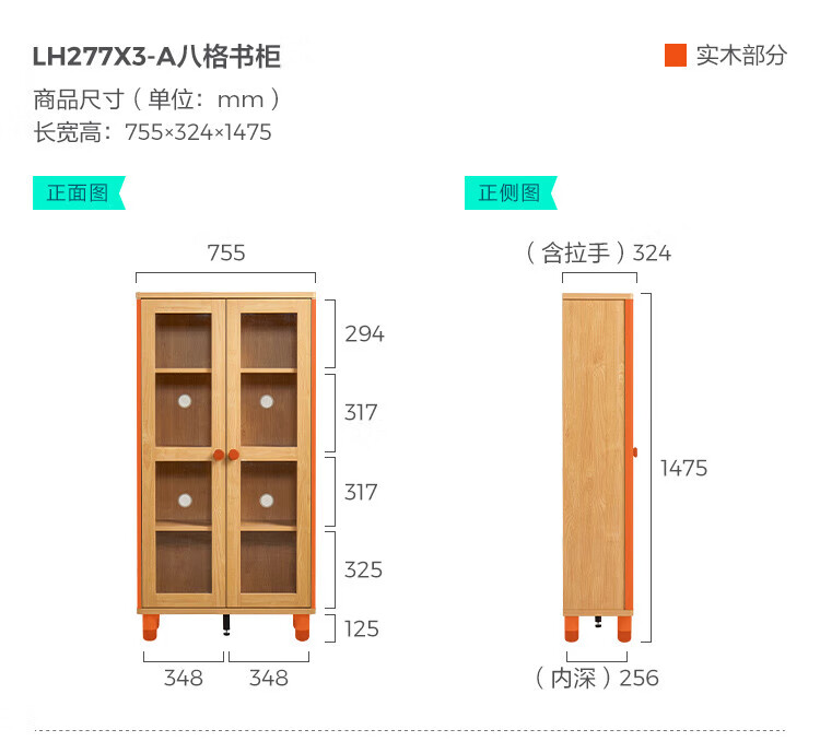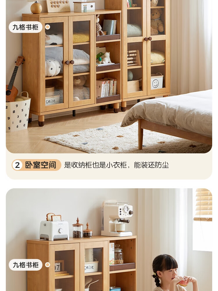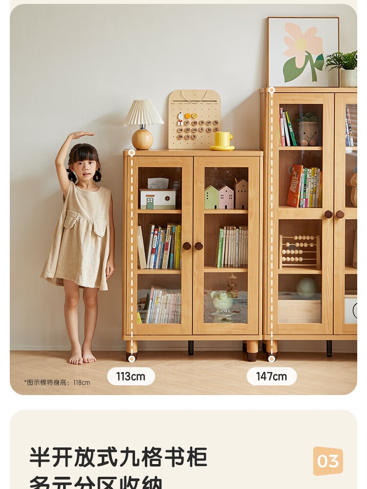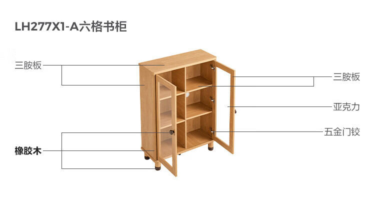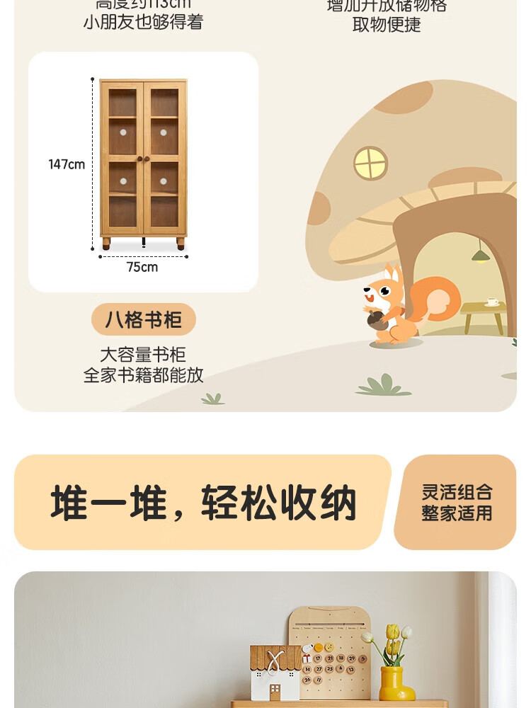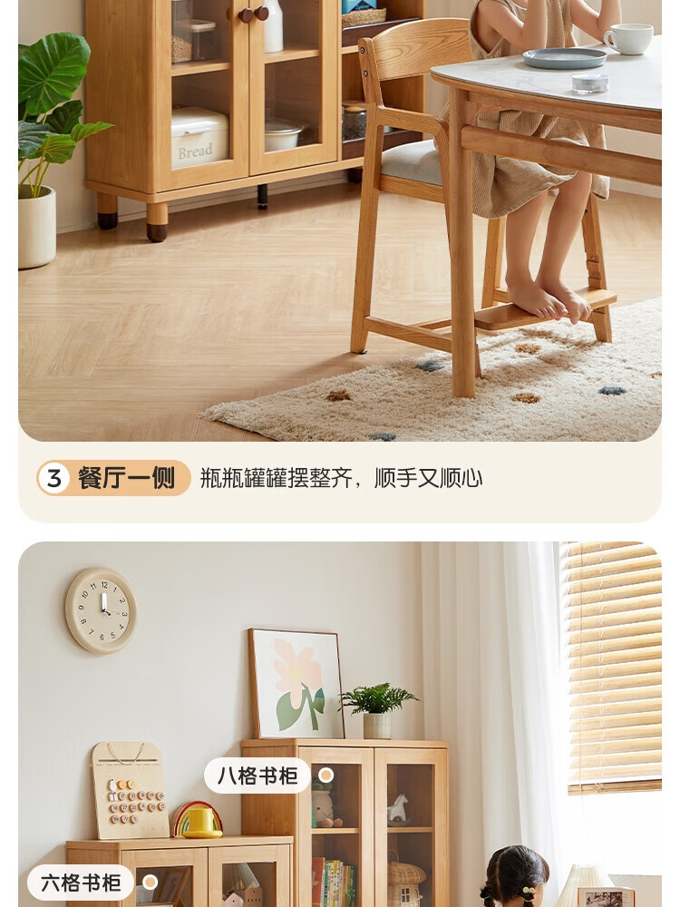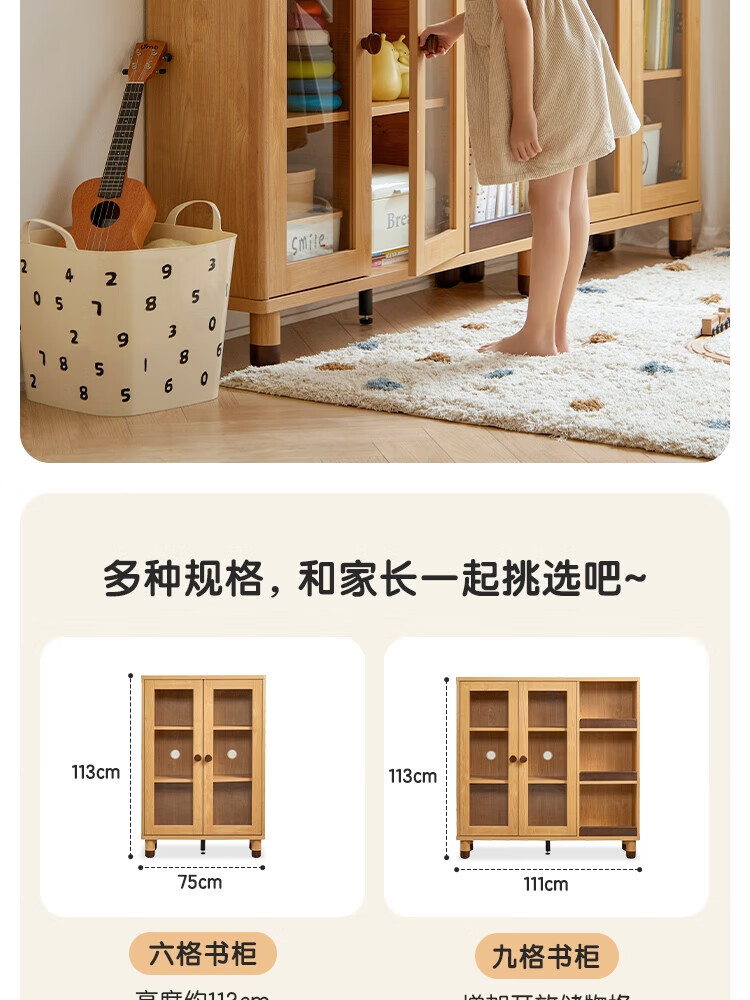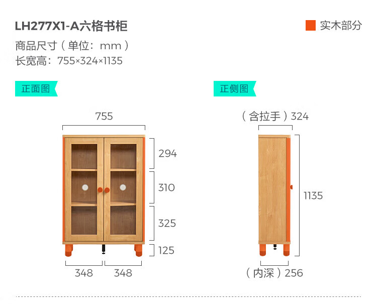 林氏家居儿童书柜实木脚书架客厅落地家用带门书橱立柜收纳储物柜LH277X1 【原木色】6格书柜*1