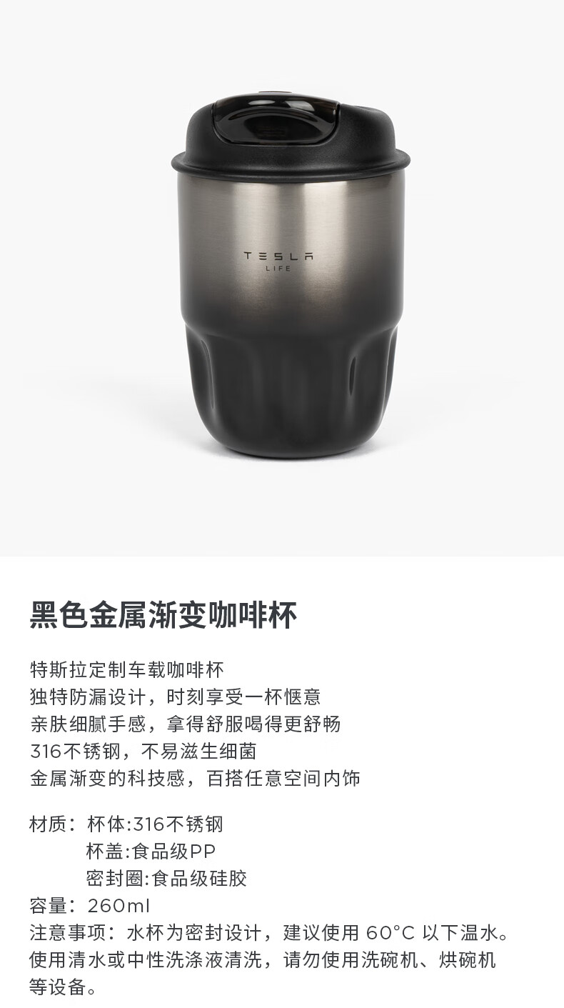 特斯拉(Tesla)官方 黑色金属渐变咖啡杯渐变杯身外观时尚便捷保温保冷