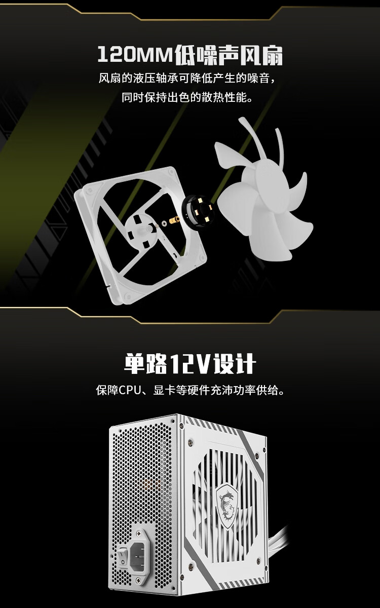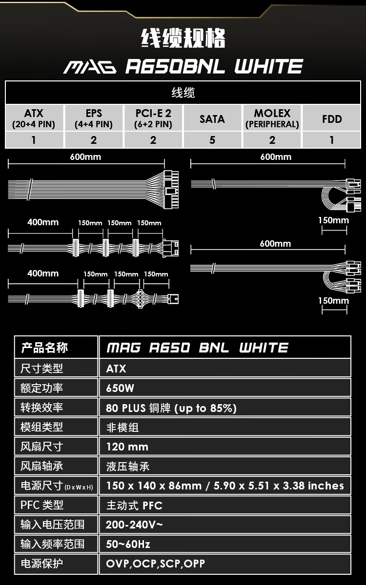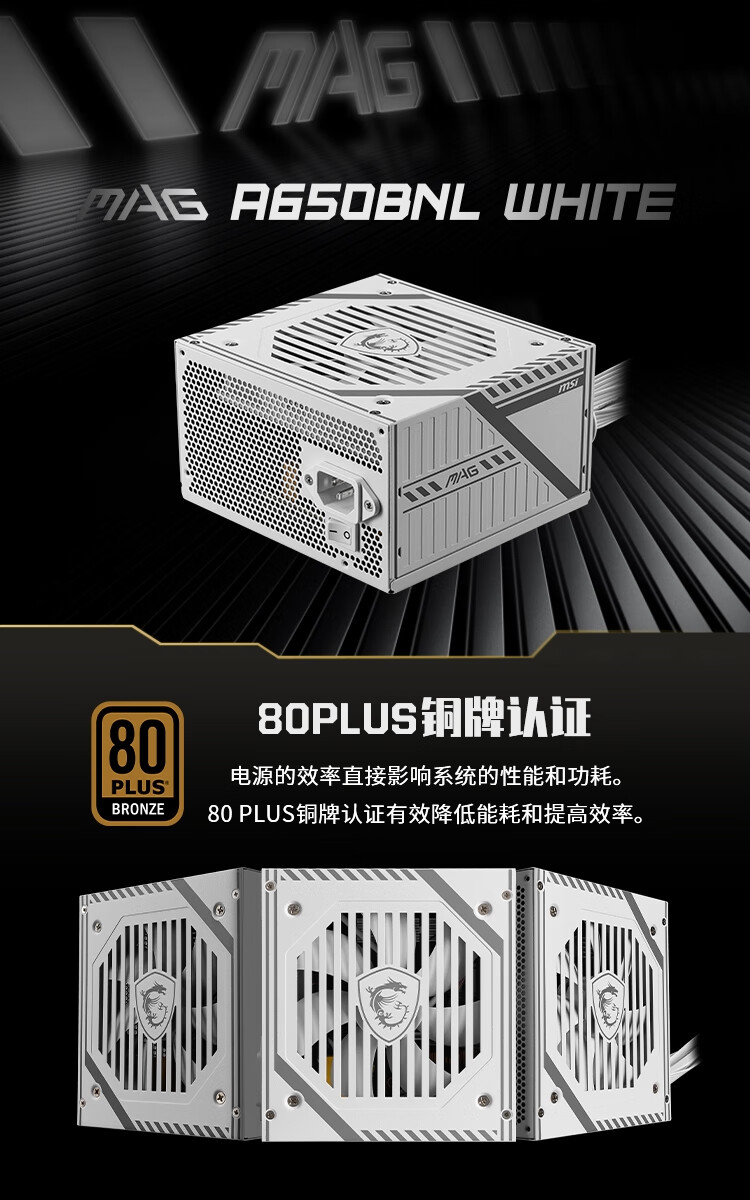 微星微星MAG A650BNL WHITE额定650W铜牌电源(液压轴承风扇/主动式PFC/多重电路保护)