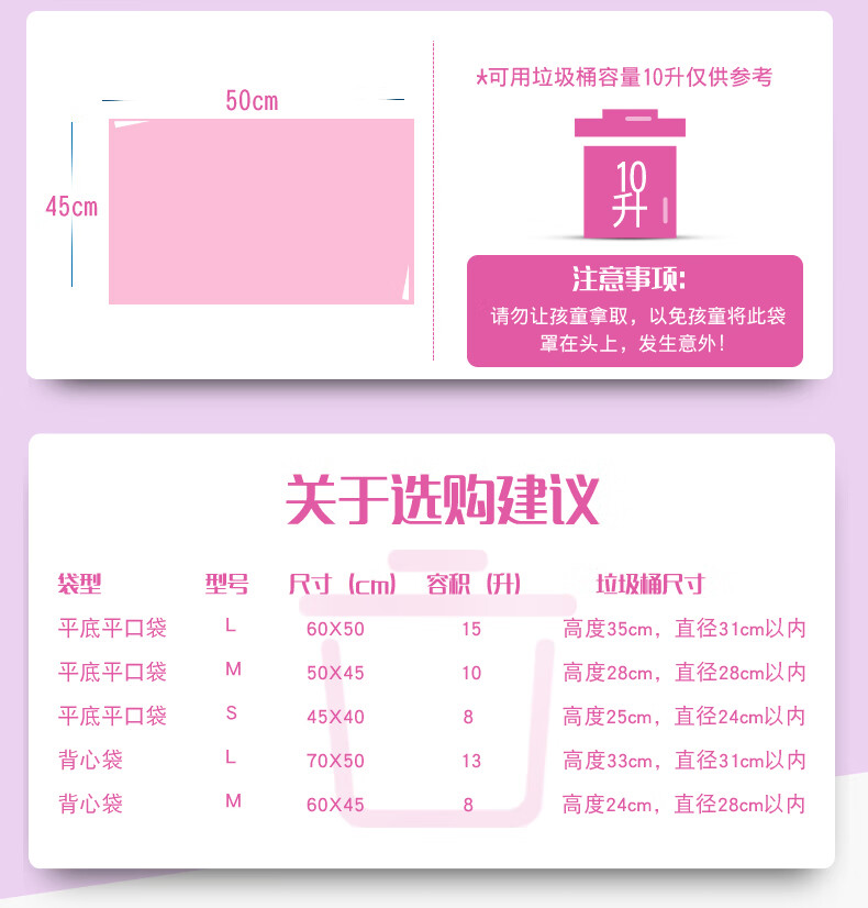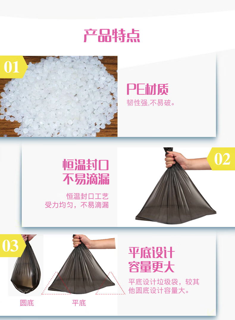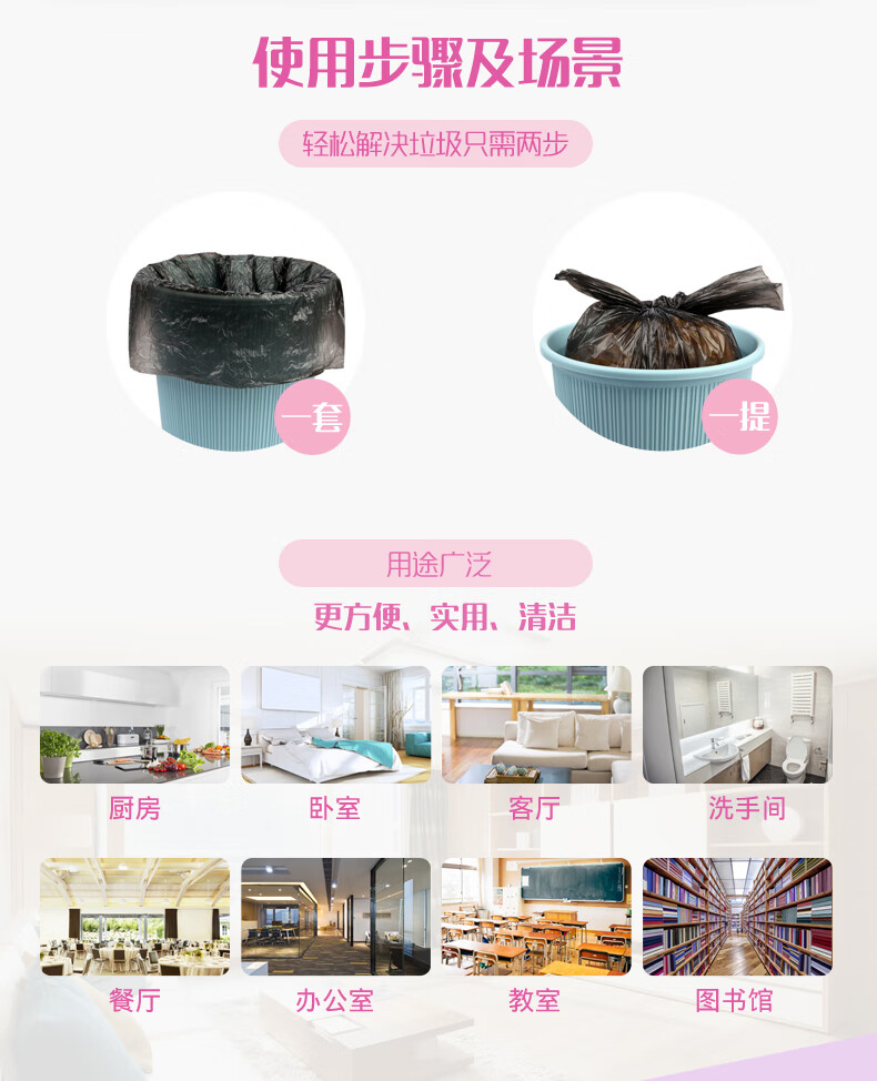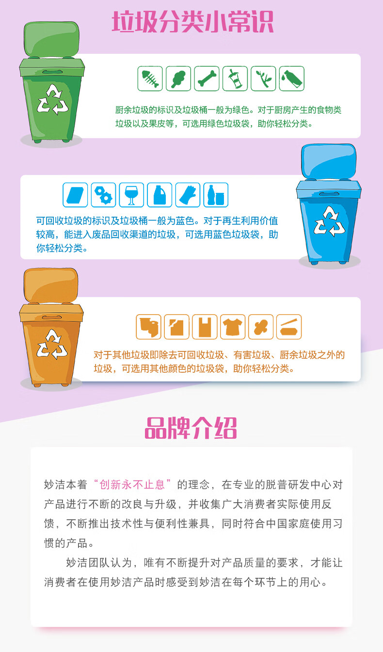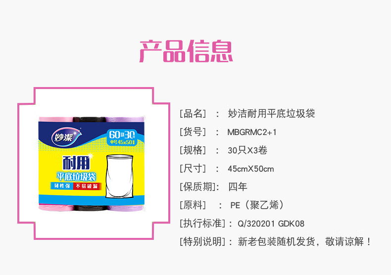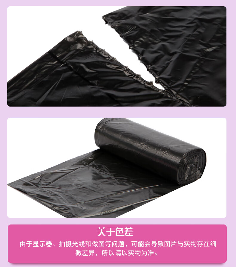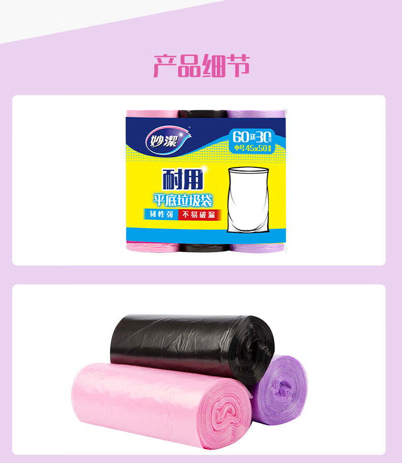 妙洁平口垃圾袋黑粉紫三色45*50cm90只单面0.8丝点断式中号