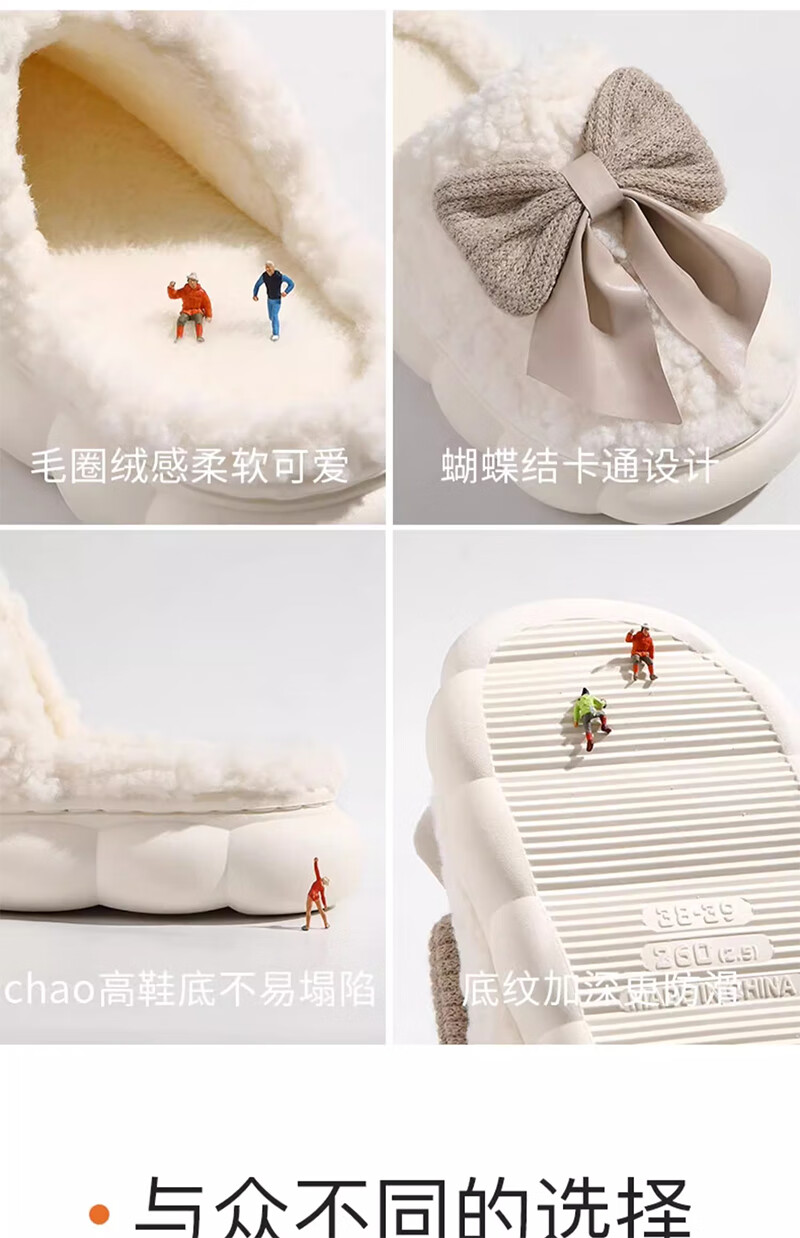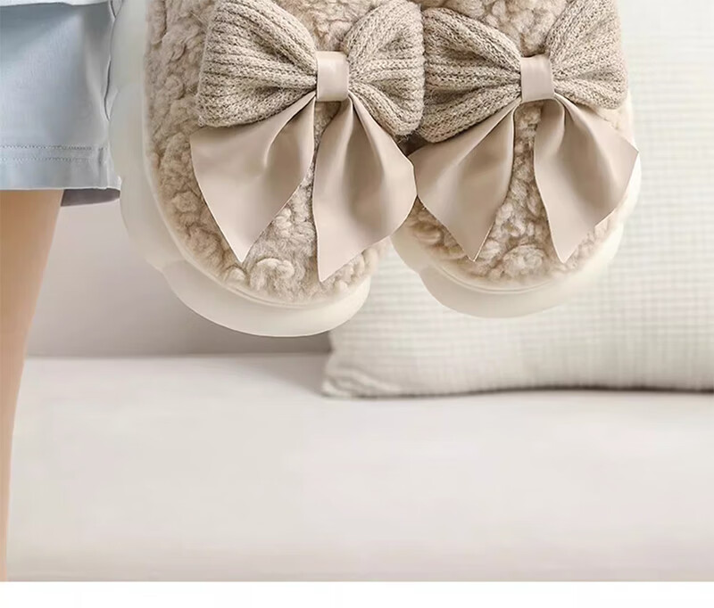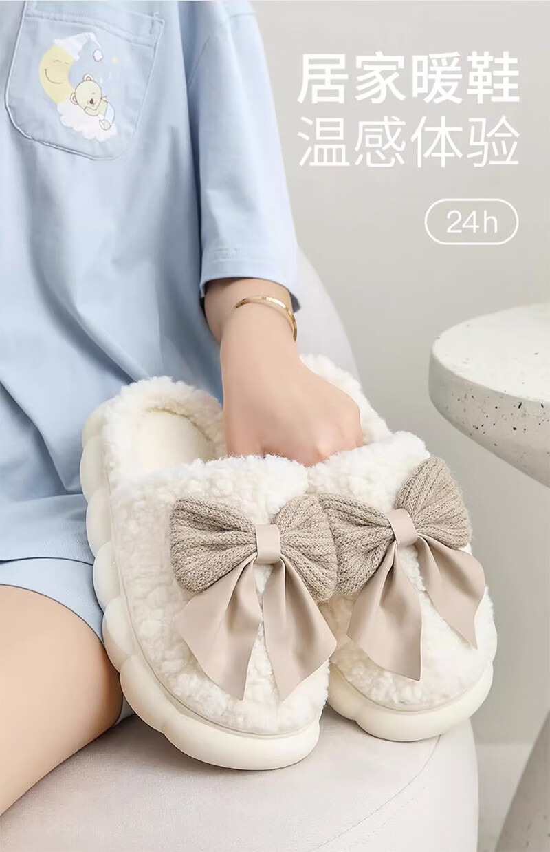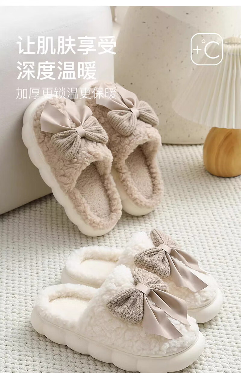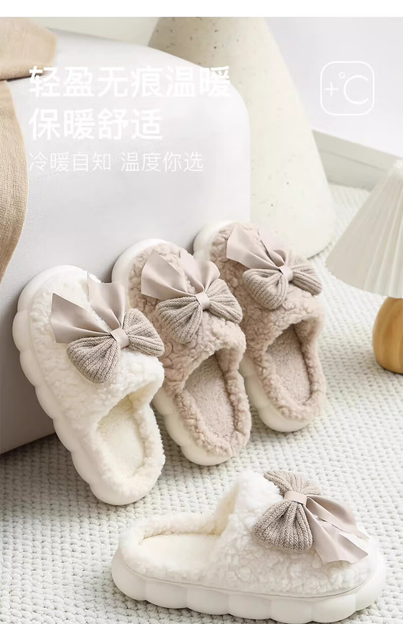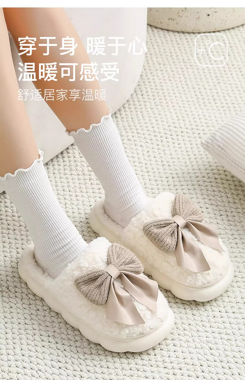 活动款--蝴蝶结拖鞋女士秋冬季冬季居家防滑室内保暖加绒厚底家用 卡其色 38-39 【建议拍大一码】
