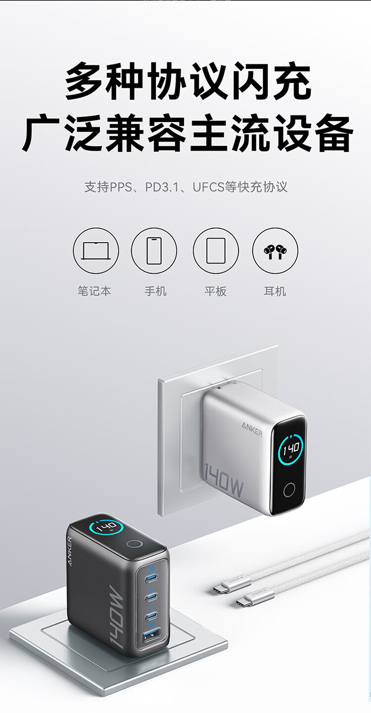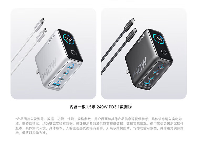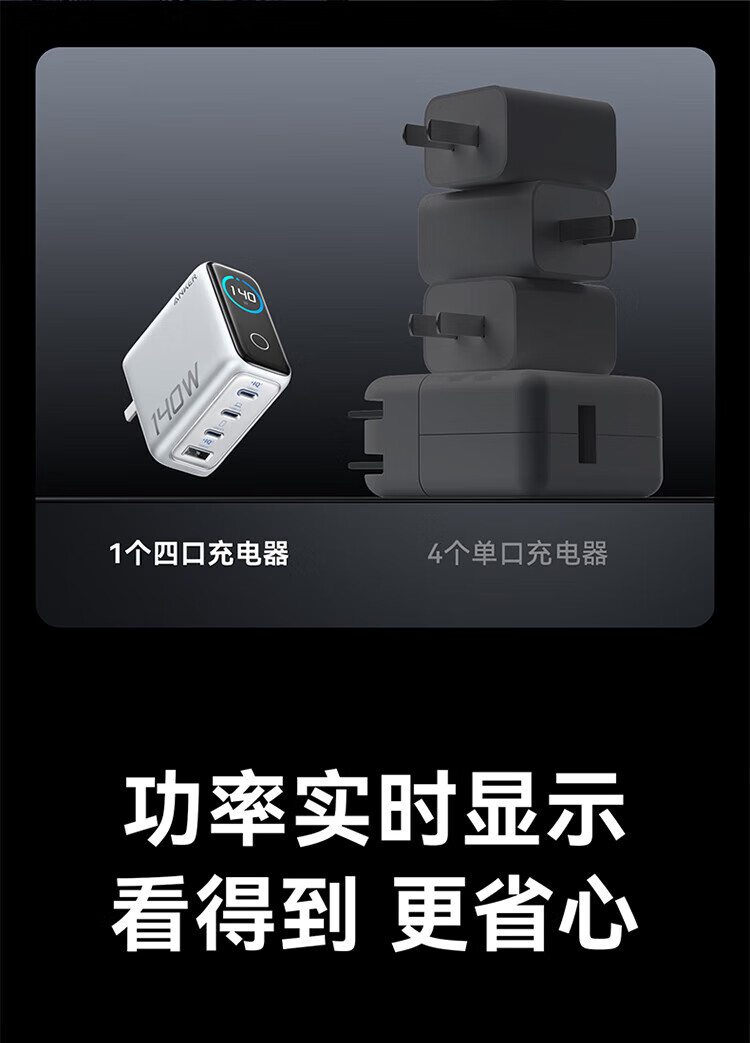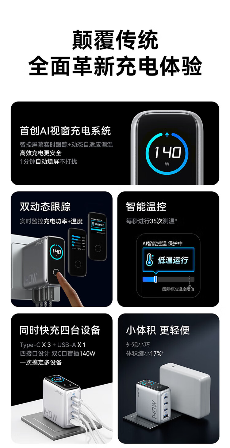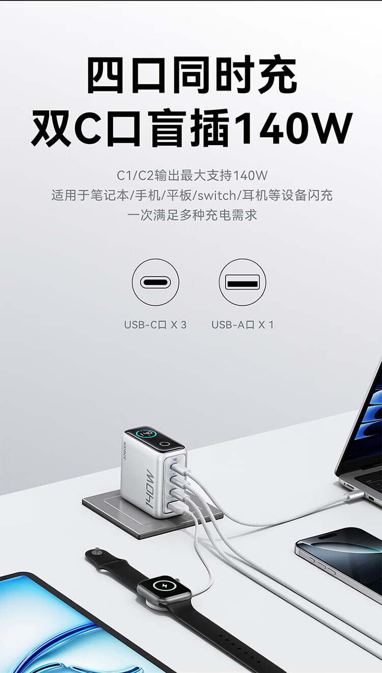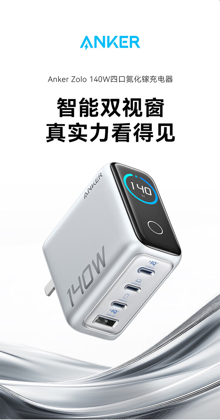 ANKER【新3C认证】安克充电器140W灵光智显氮化镓首款AI屏显type-c四口充电头配线快充iPhone17手机电脑 【深灰色】智能屏显140W四口快充+1.5米双C线