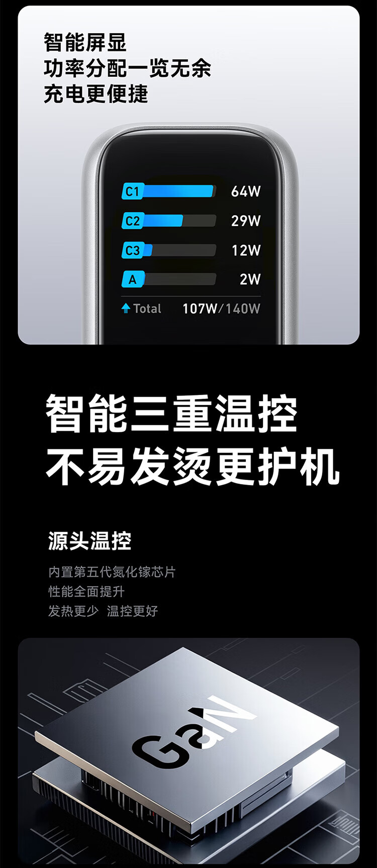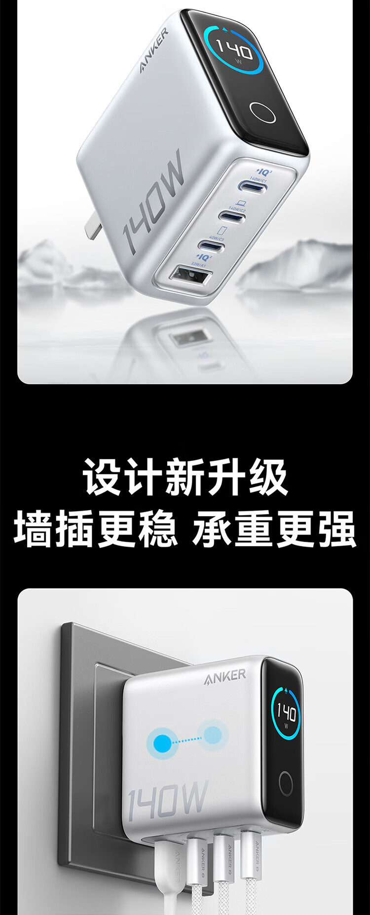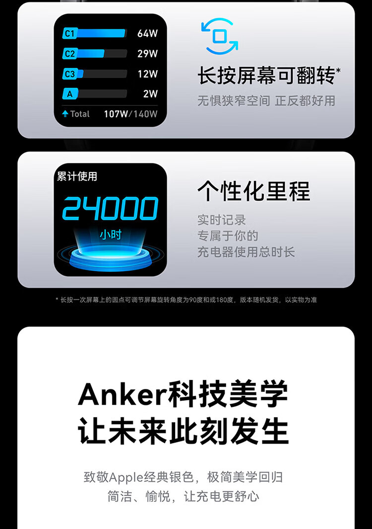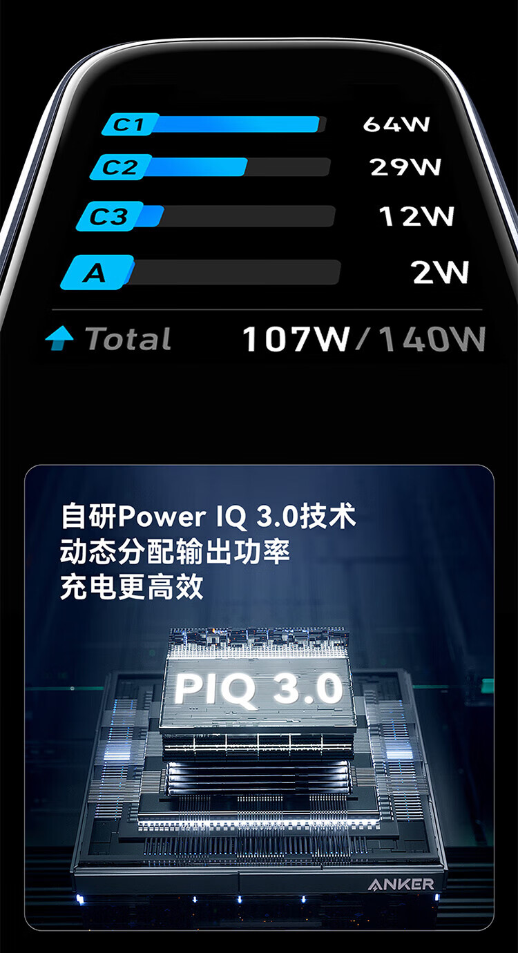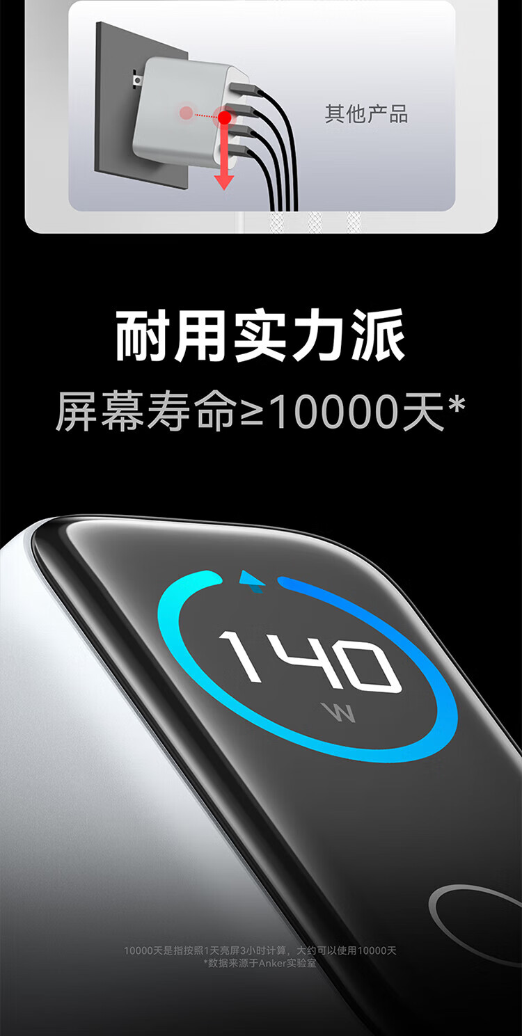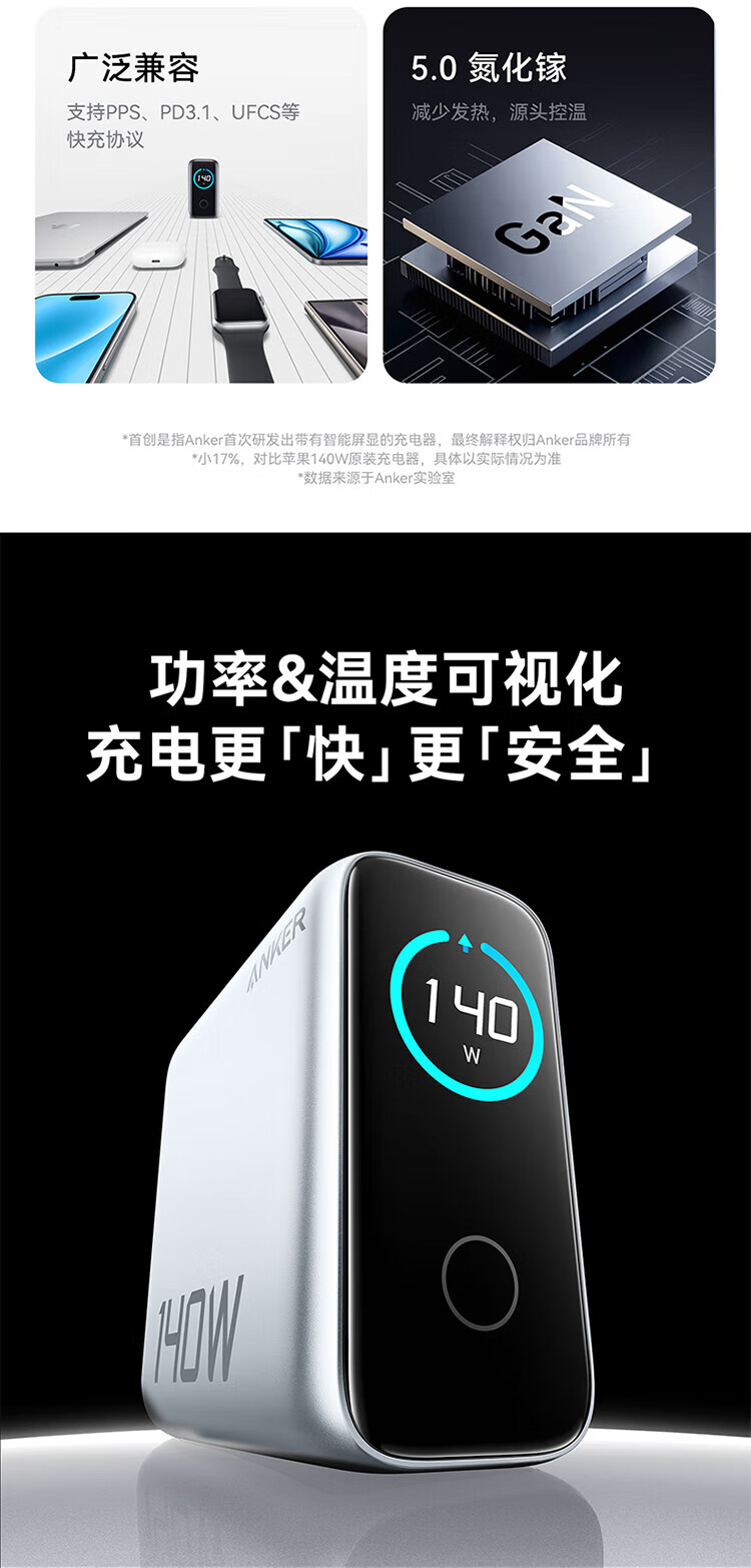 ANKER【新3C认证】安克充电器140W灵光智显氮化镓首款AI屏显type-c四口充电头配线快充iPhone17手机电脑 【深灰色】智能屏显140W四口快充+1.5米双C线