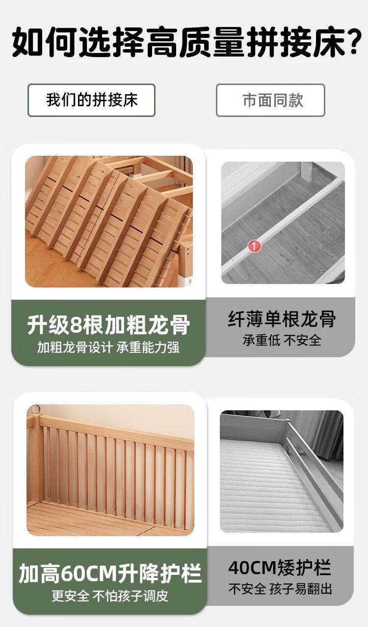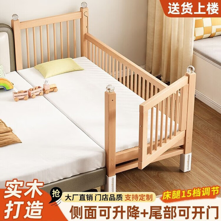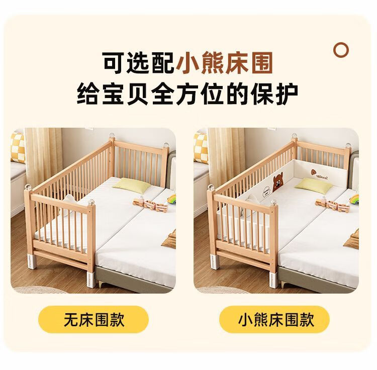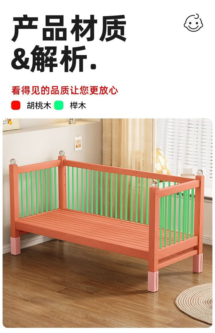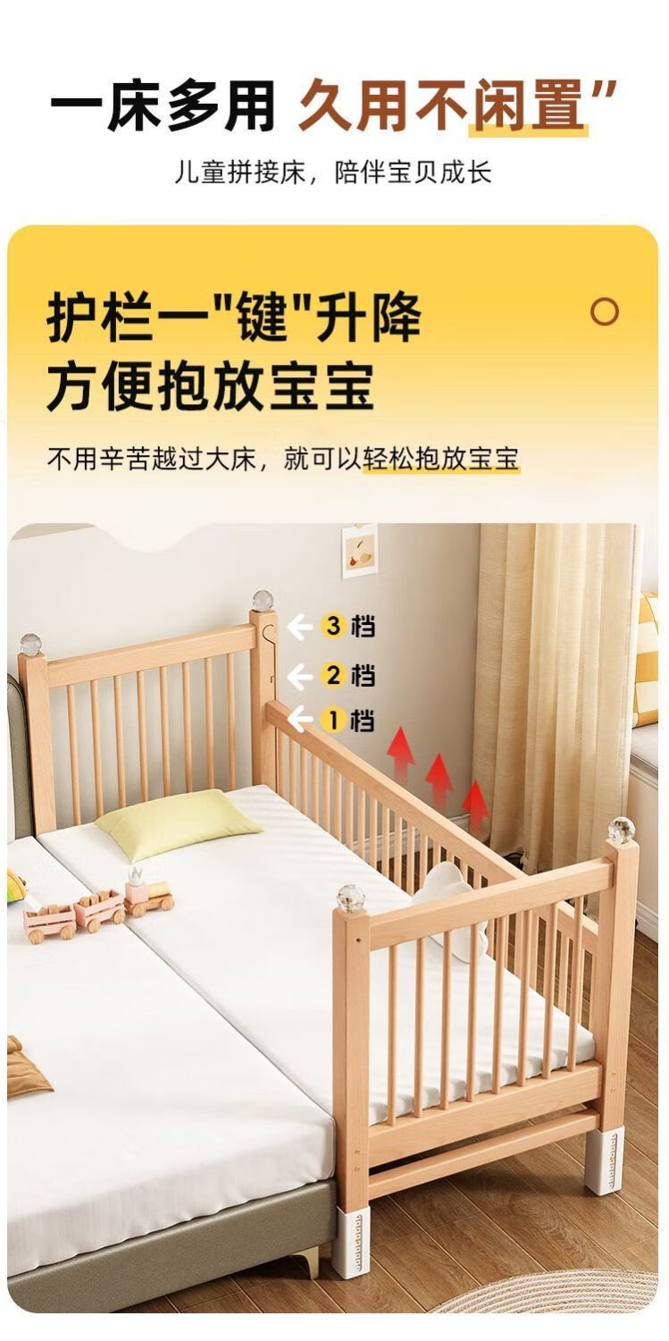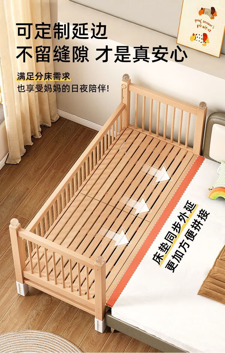 欣慕雅拼接床榉木床边加宽婴儿小床宝宝床大人可睡护栏可升降床儿童大床 带横撑平铺款 150*50-【床腿15档可调节】胡桃木