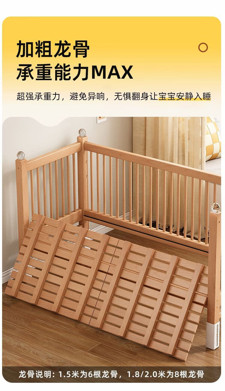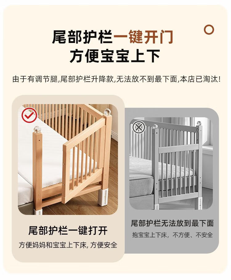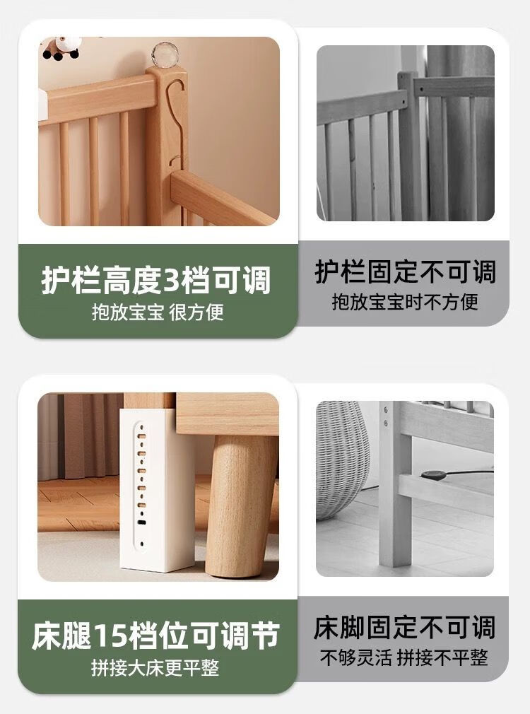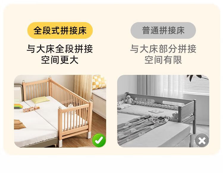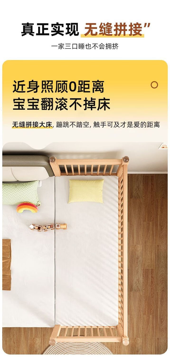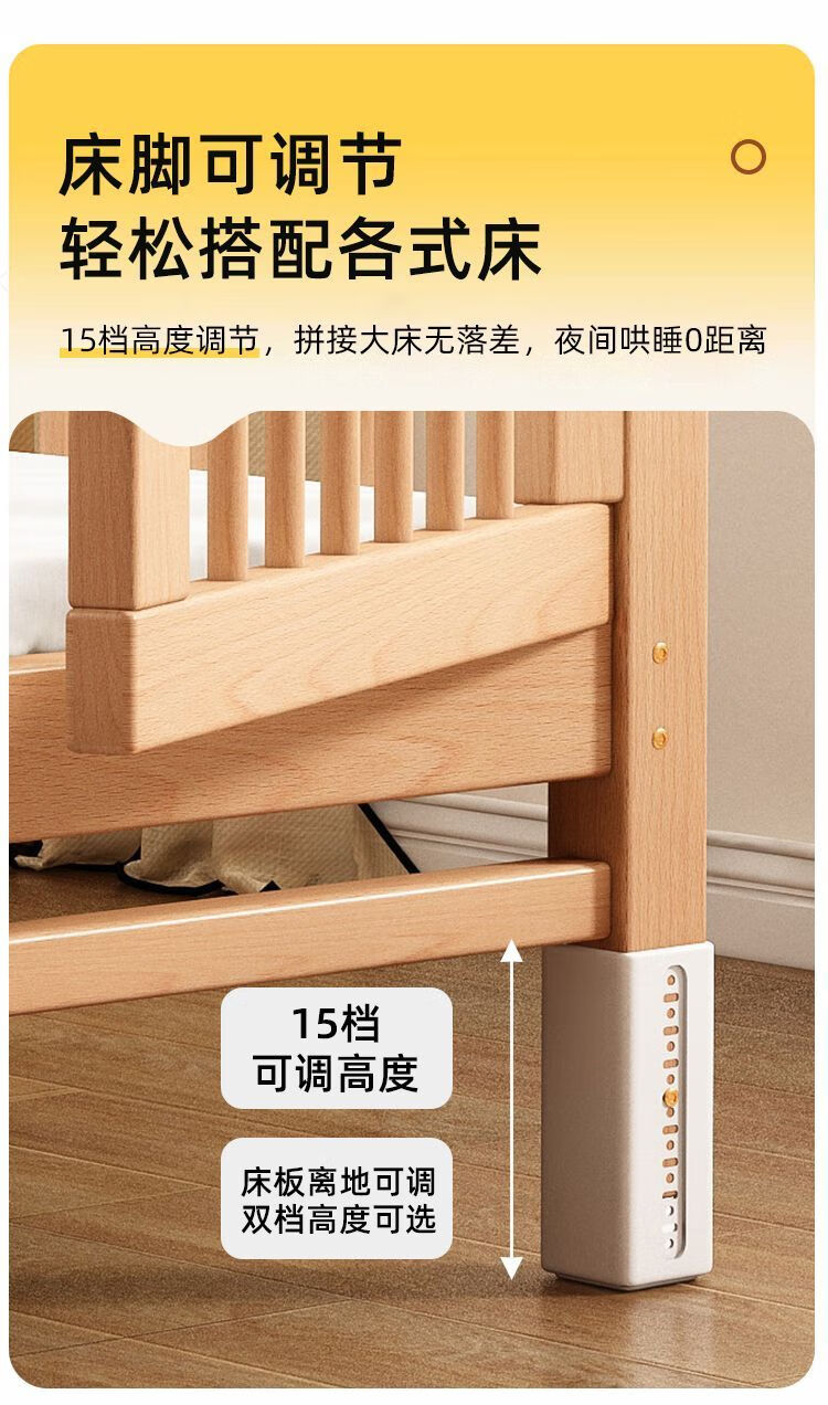 欣慕雅拼接床榉木床边加宽婴儿小床宝宝床大人可睡护栏可升降床儿童大床 带横撑平铺款 150*50-【床腿15档可调节】胡桃木