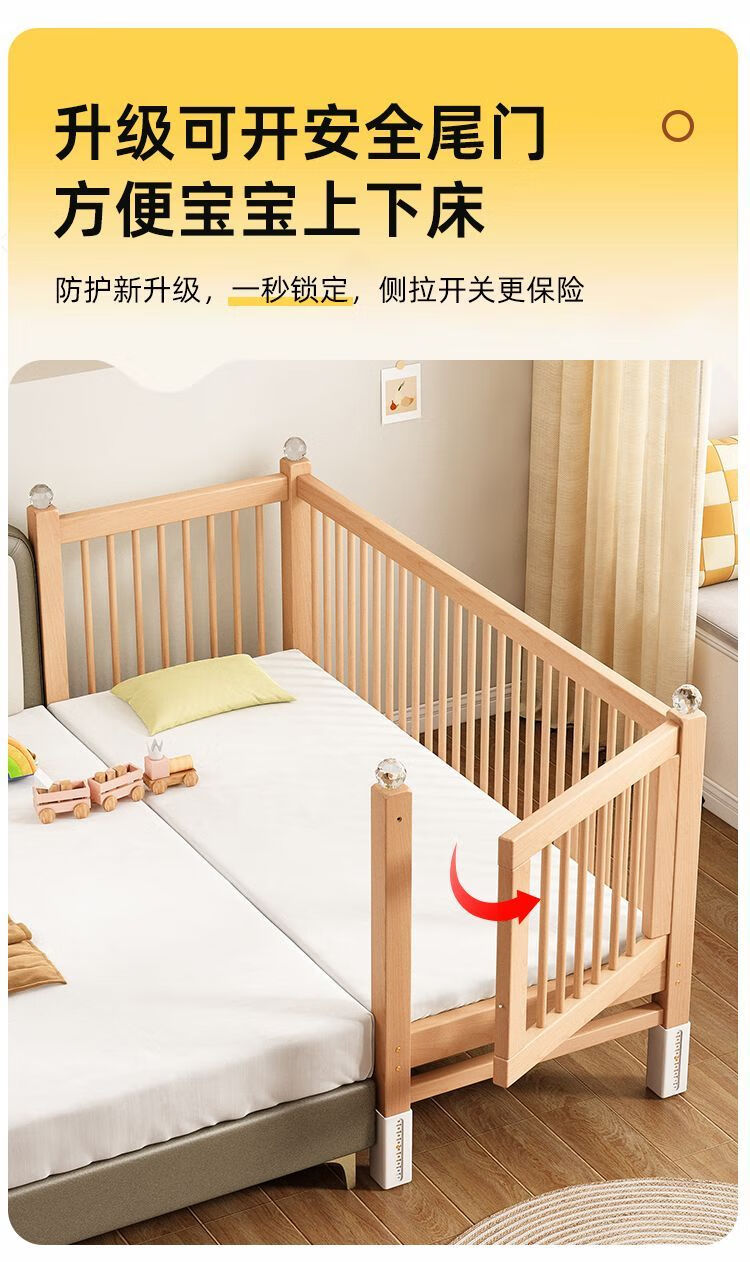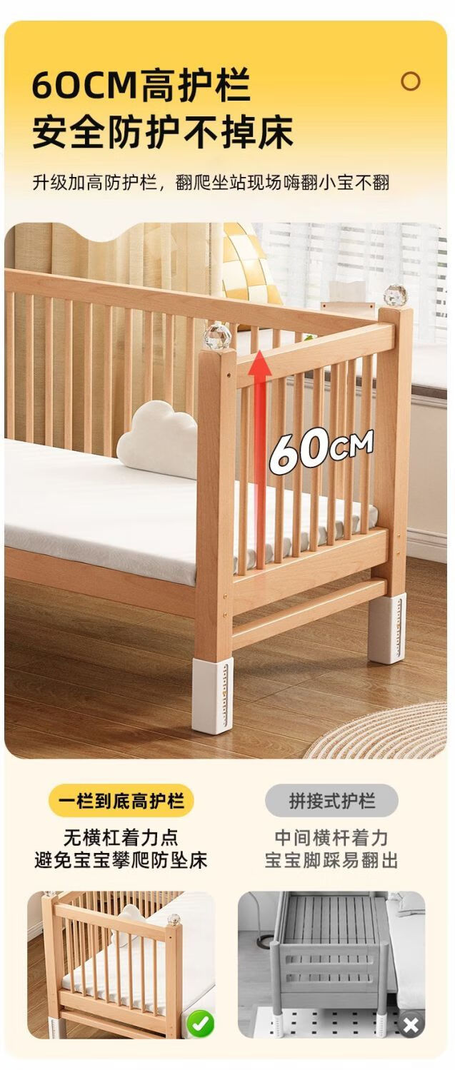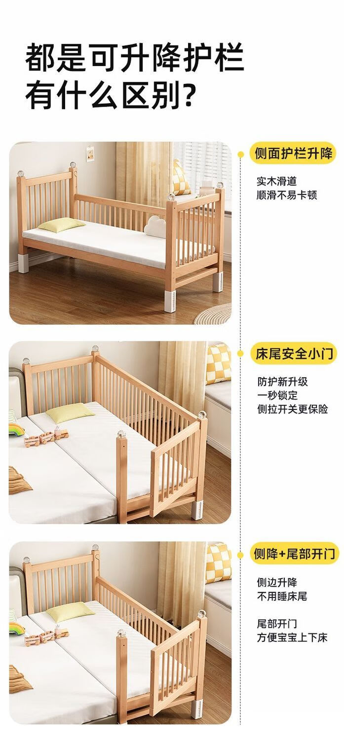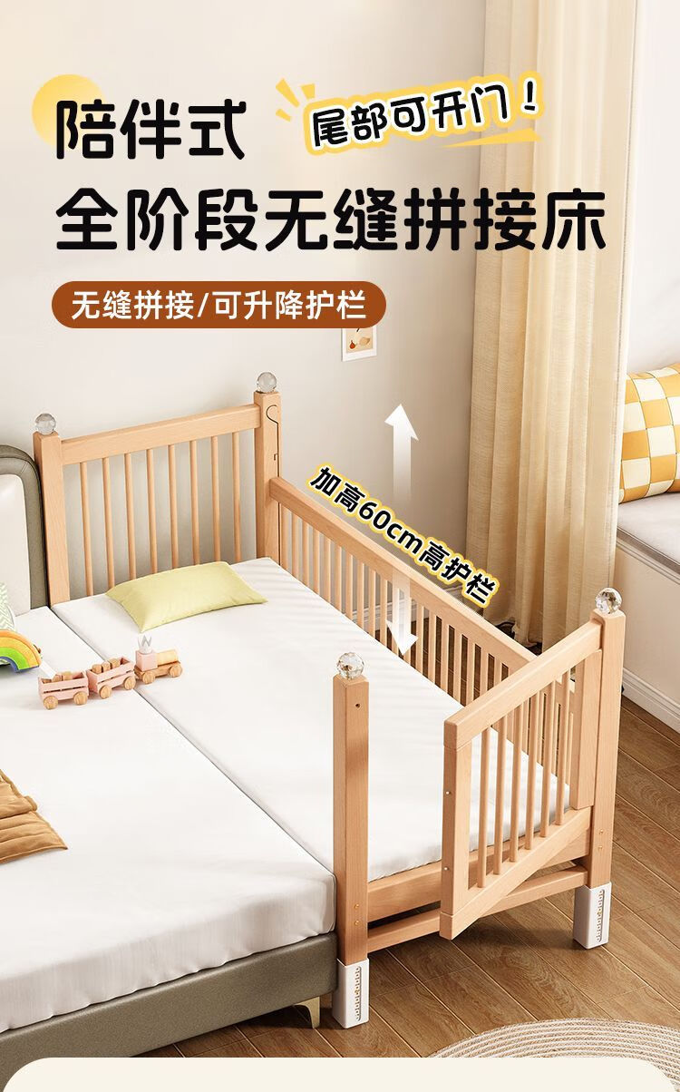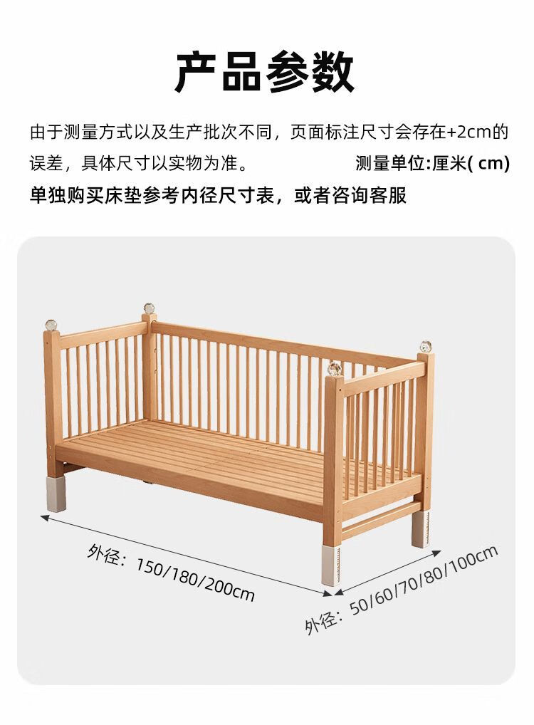 欣慕雅拼接床榉木床边加宽婴儿小床宝宝床大人可睡护栏可升降床儿童大床 带横撑平铺款 150*50-【床腿15档可调节】胡桃木