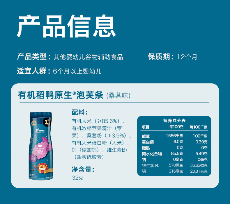 禾泱泱有机婴幼儿高钙泡芙条桑葚味32g 稻鸭原生宝宝零食低敏6月+