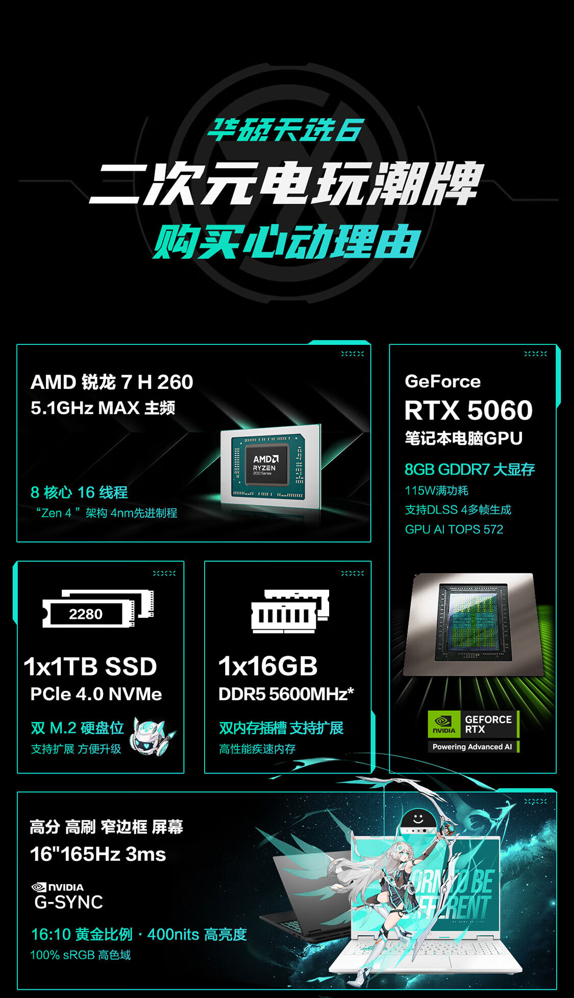 华硕天选6 锐龙版【国家补贴】16英寸高性能RTX50系电竞游戏本学生笔记本手提电脑 锐龙7 H 260 /RTX5060/日蚀灰 16G内存/1T高速固态硬盘 16英寸 165HZ电竞屏