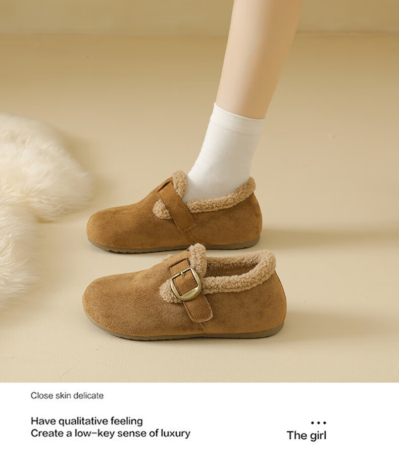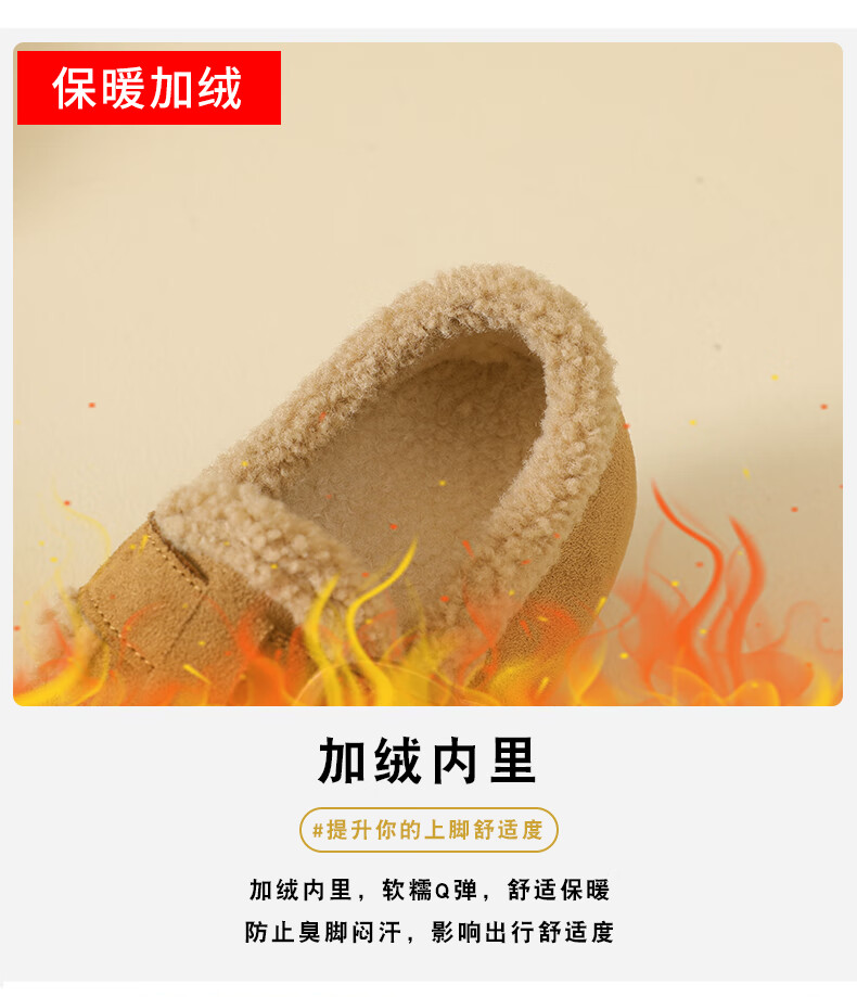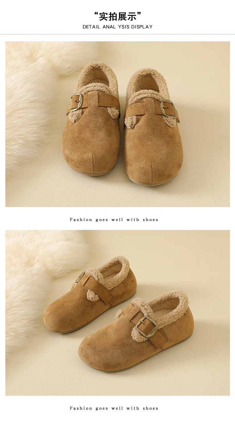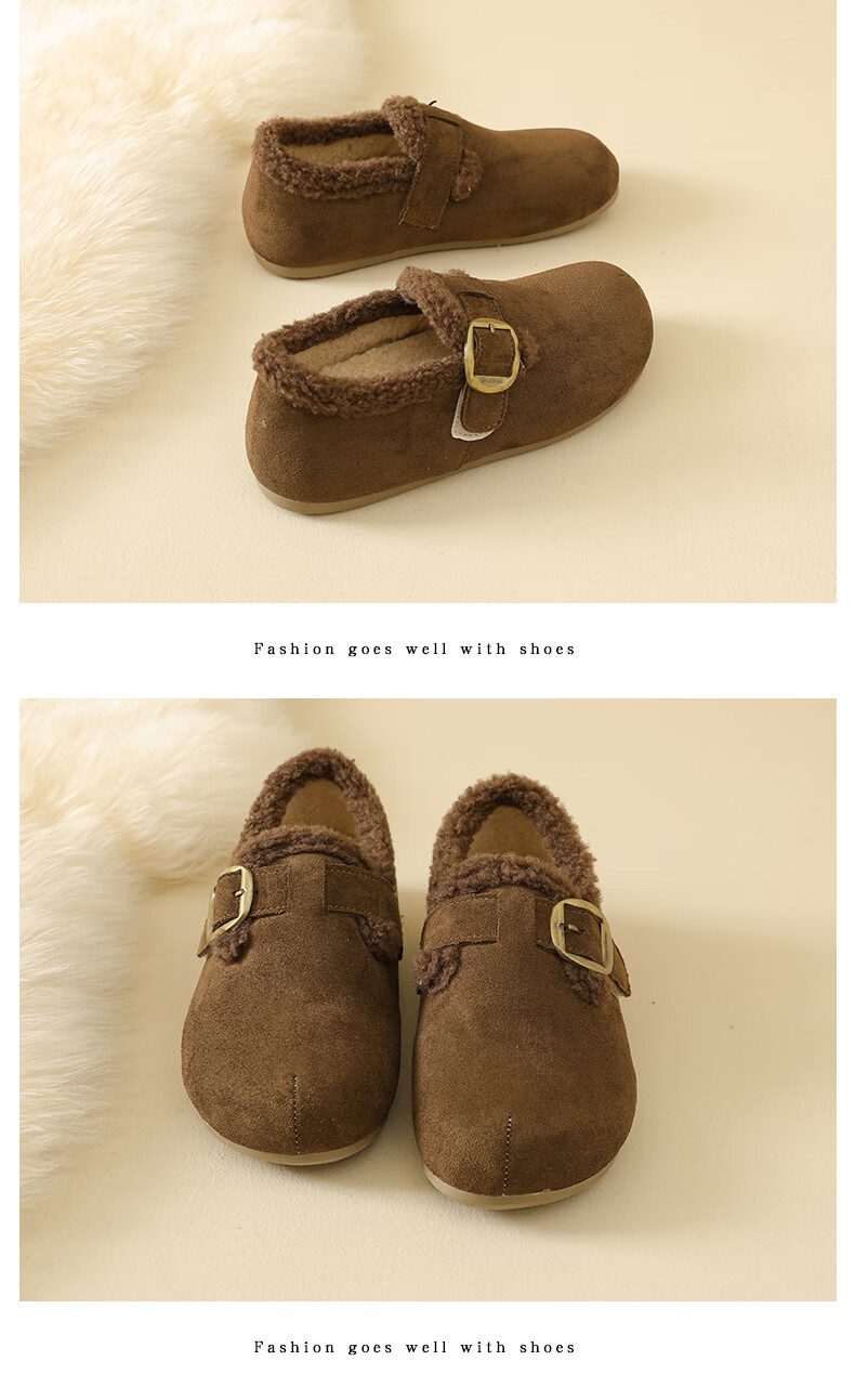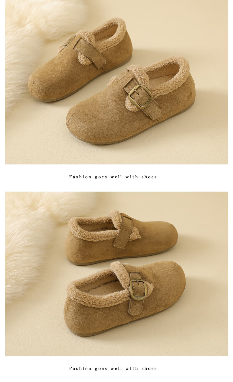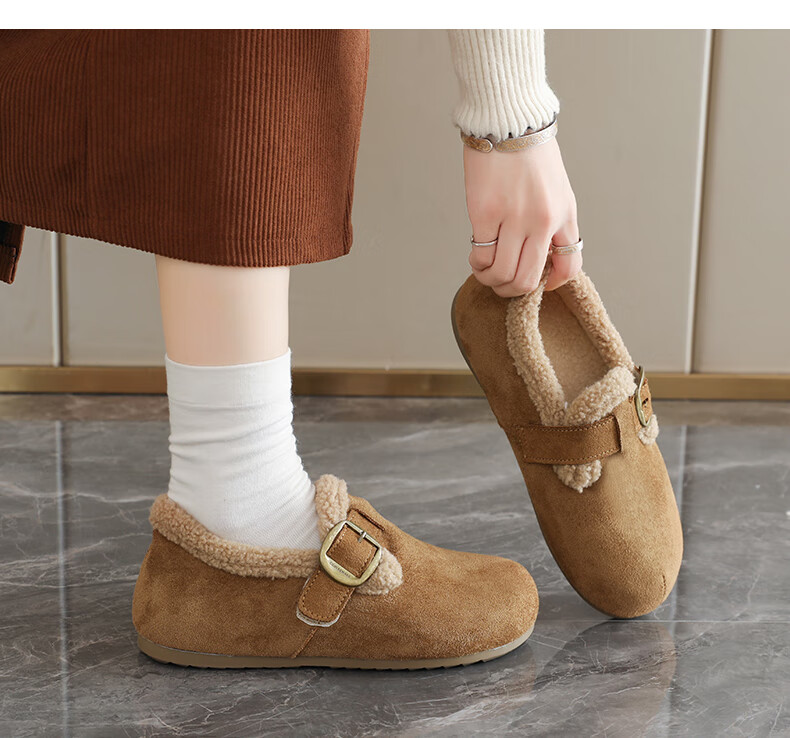 稻草人(MEXICAN)大码女鞋41到43码勃肯鞋女2026冬季加绒乐福鞋防滑软底孕妇棉鞋女 卡其色 36