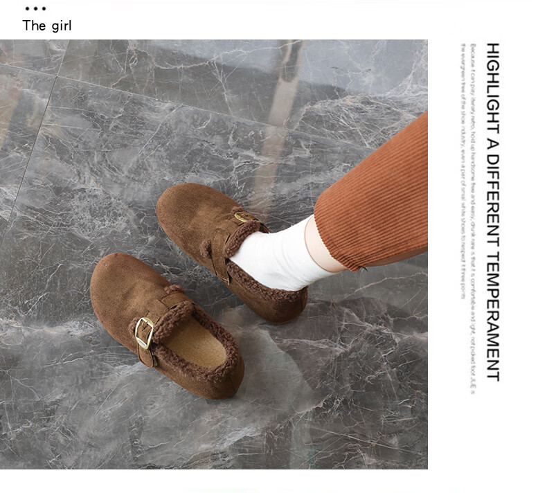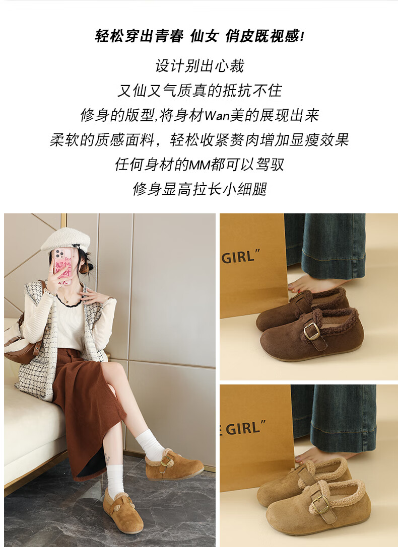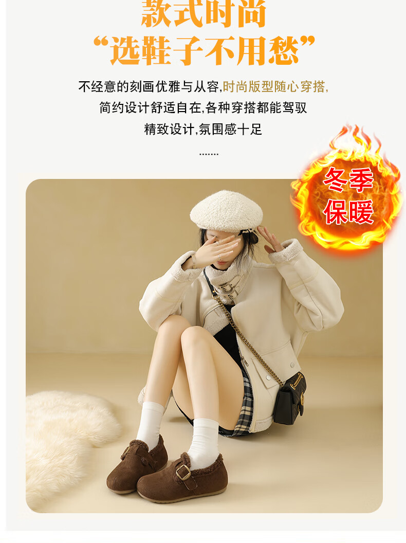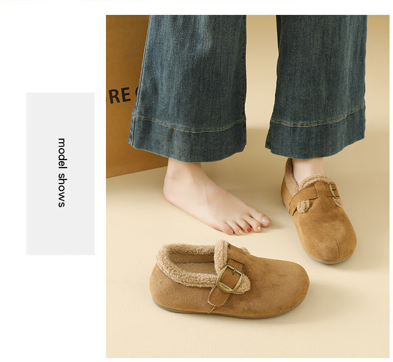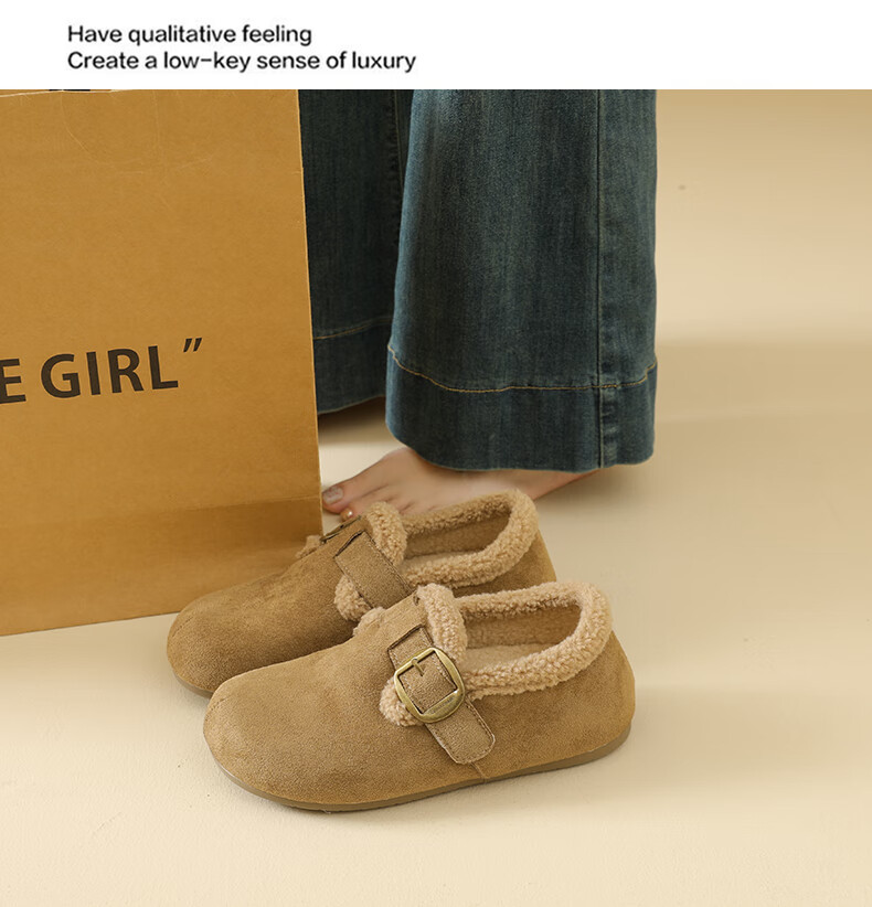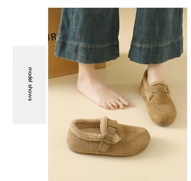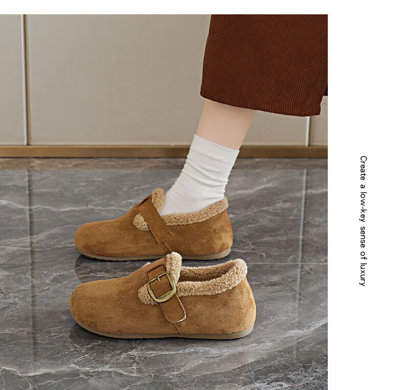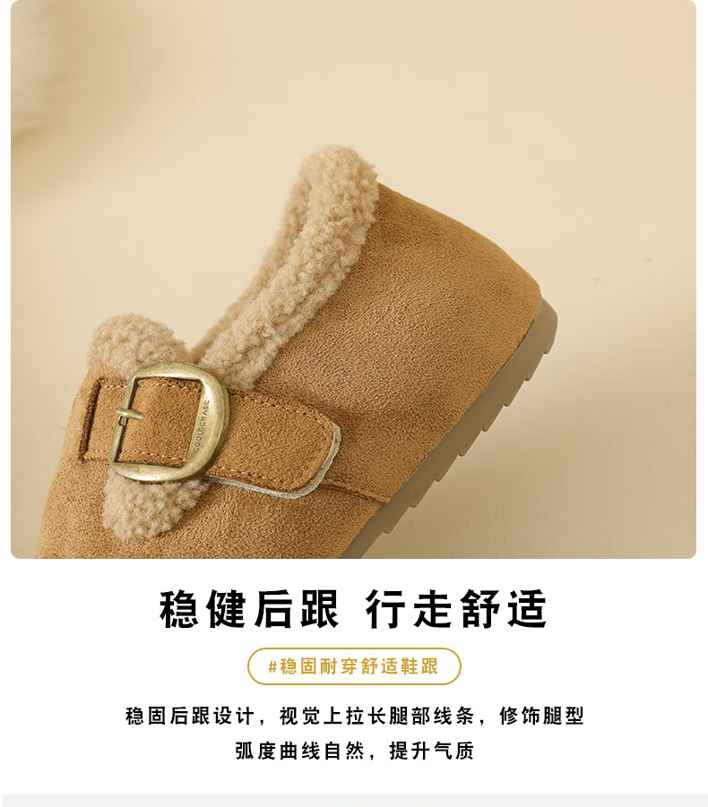 稻草人(MEXICAN)大码女鞋41到43码勃肯鞋女2026冬季加绒乐福鞋防滑软底孕妇棉鞋女 卡其色 36