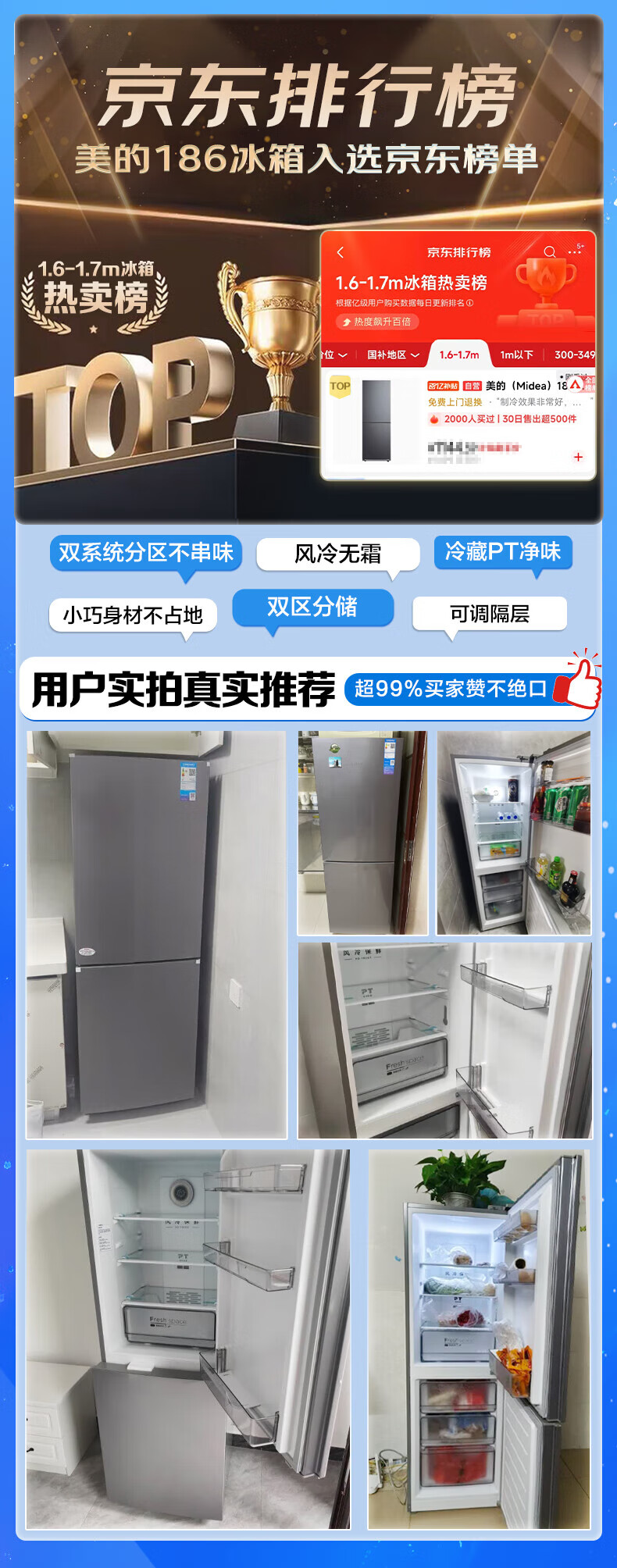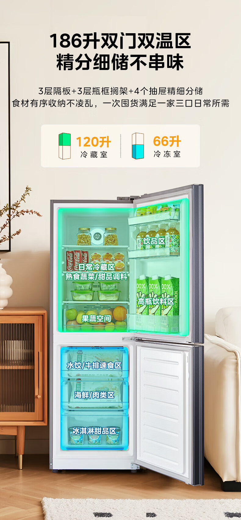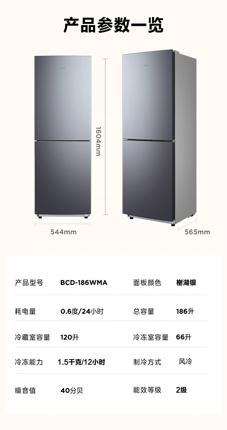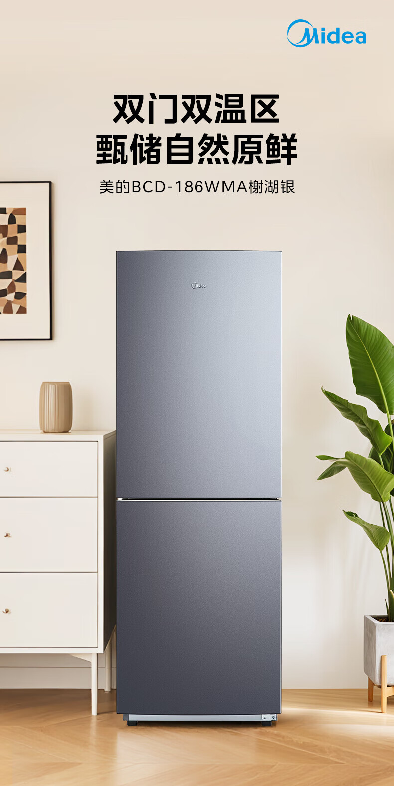 美的(Midea)186双开门两门低音小型节能省电无霜低温补偿深冷速冻租房宿舍家用小冰箱BCD-186WMA国家补贴