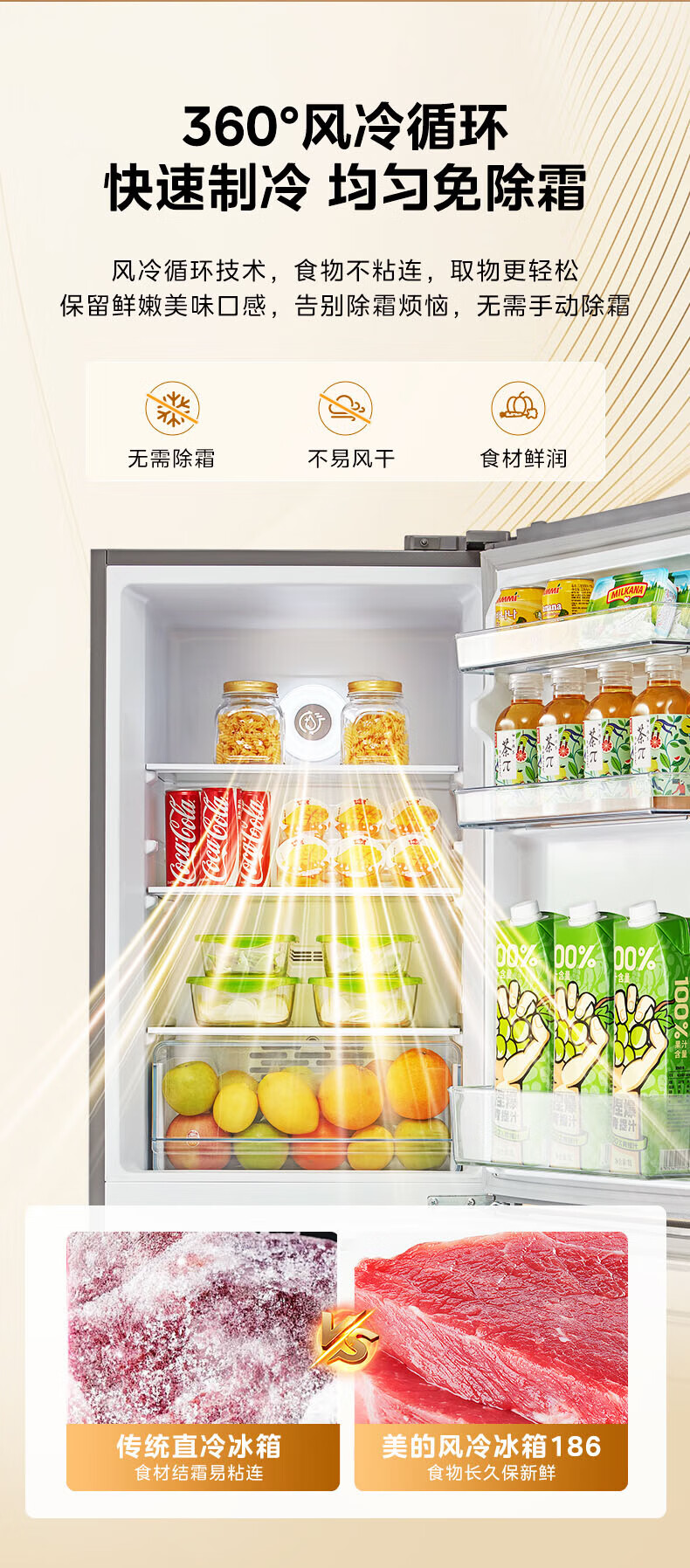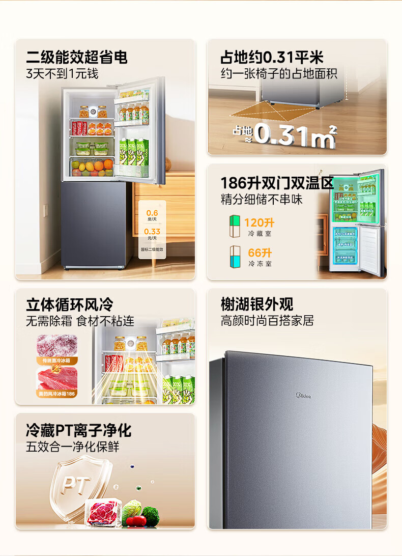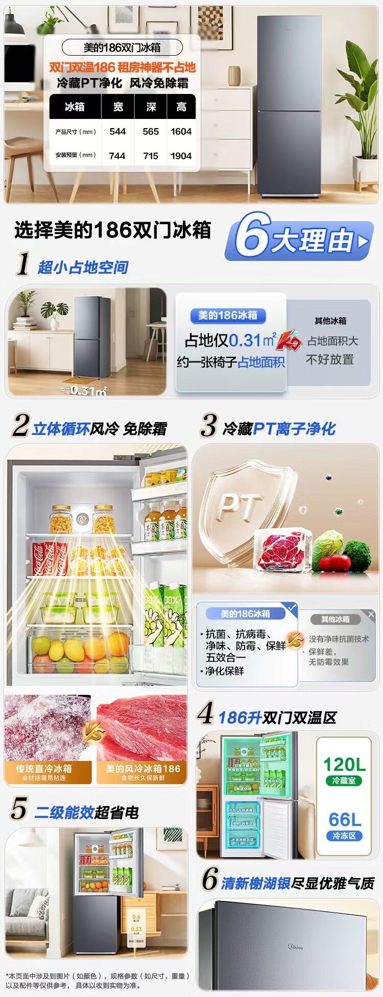 美的(Midea)186双开门两门低音小型节能省电无霜低温补偿深冷速冻租房宿舍家用小冰箱BCD-186WMA国家补贴