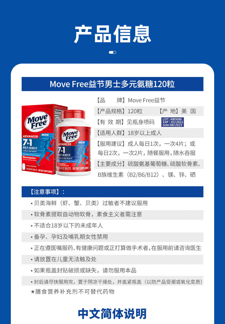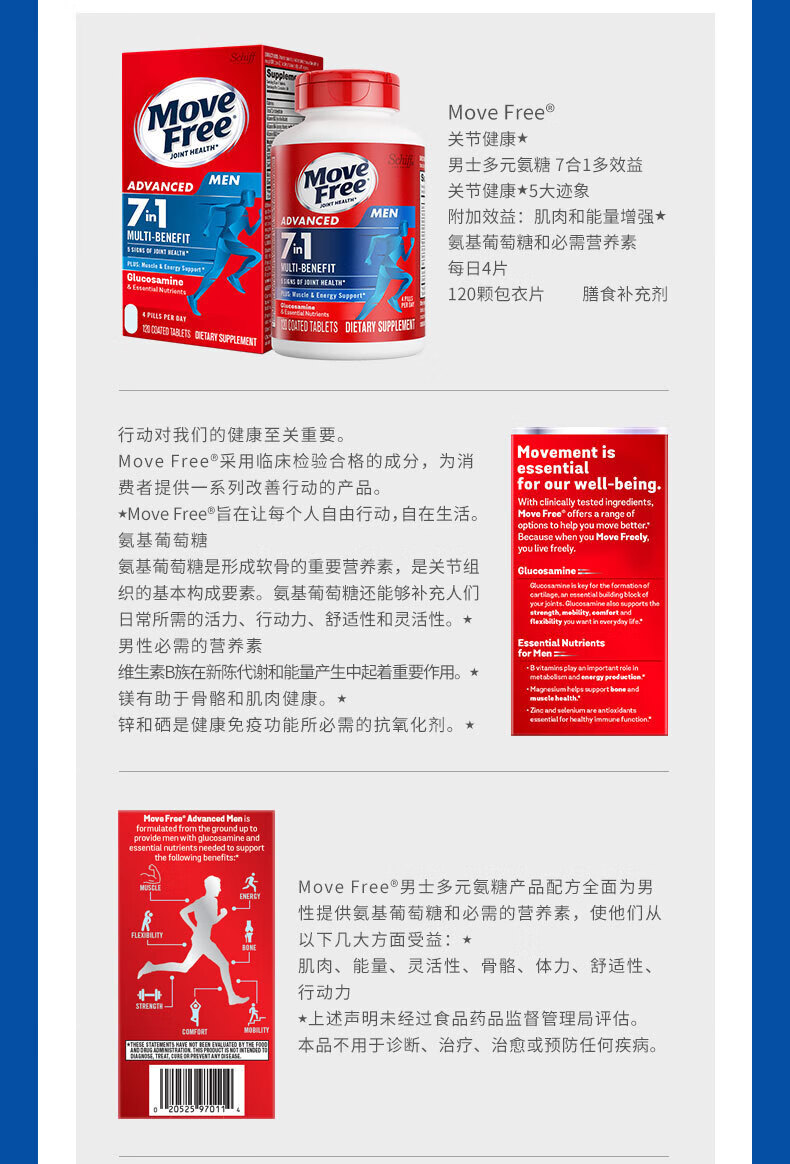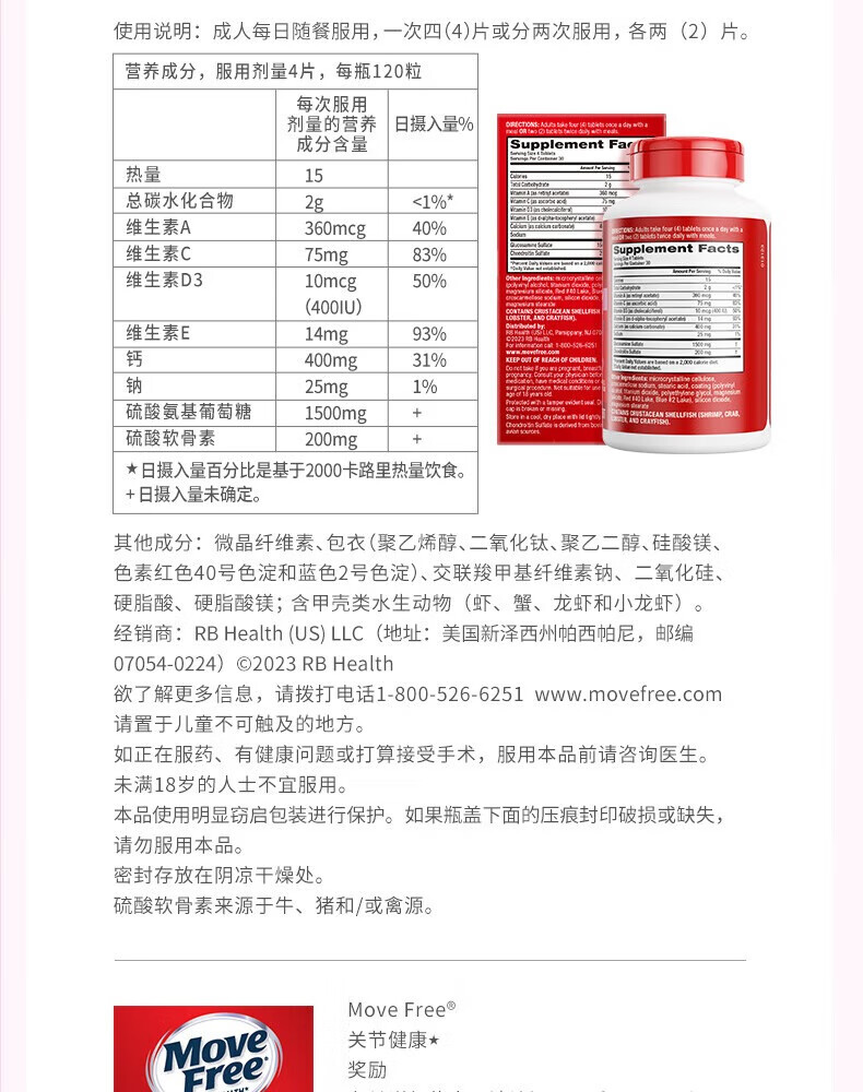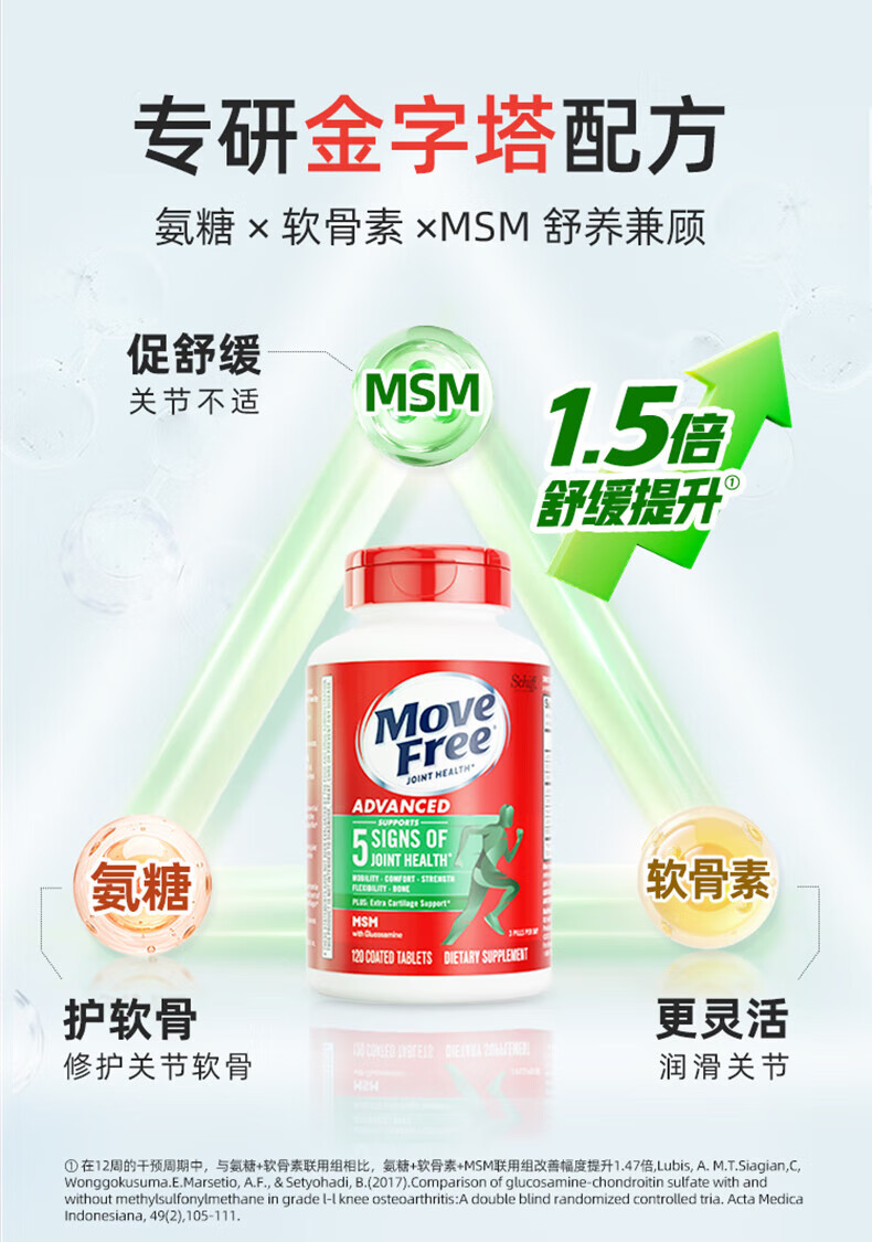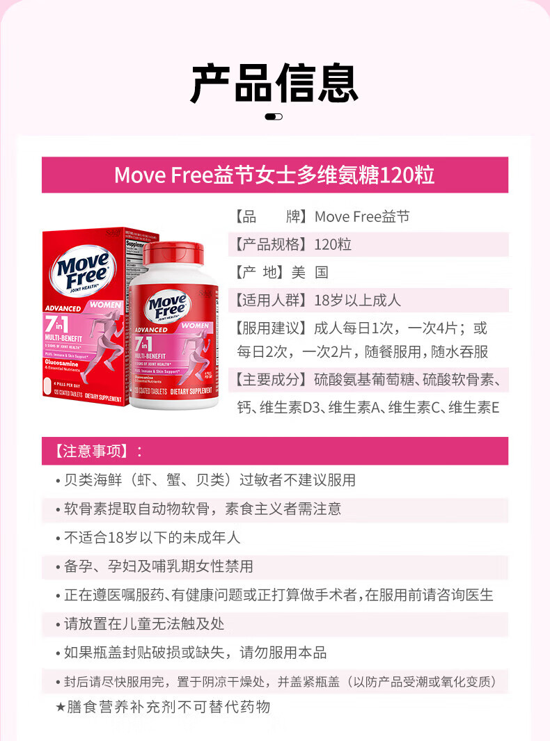 益节(Move Free)氨糖软骨素美国维骨力骨胶原钙片氨基葡萄糖 【舒缓不适】绿瓶 120粒*1瓶