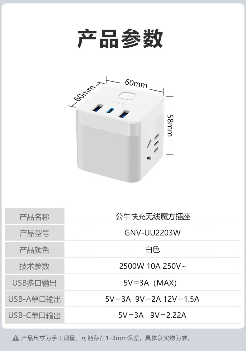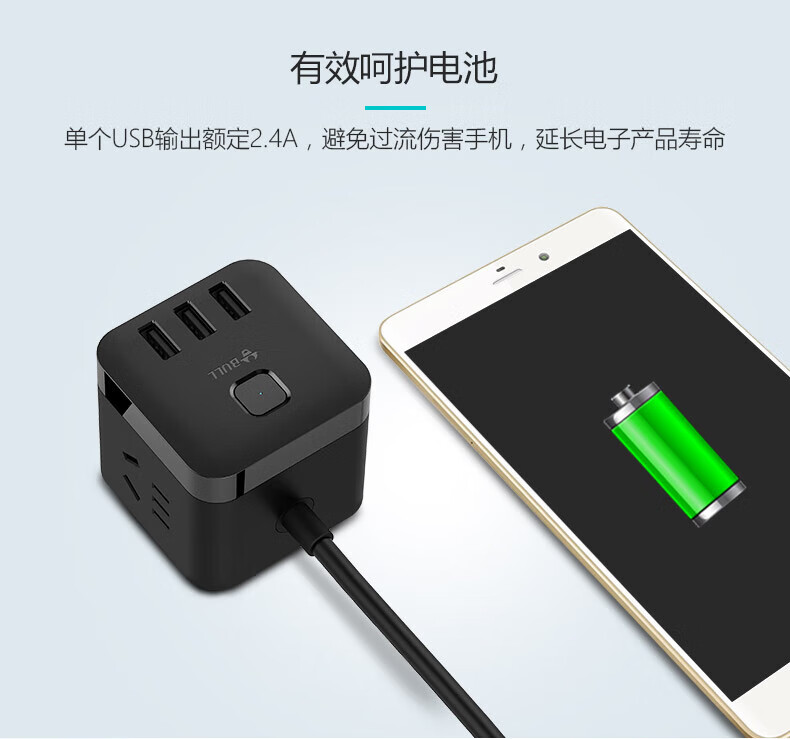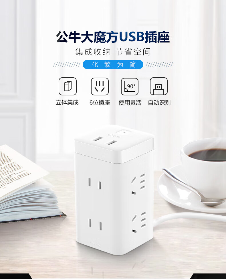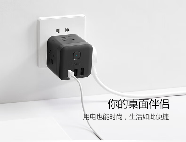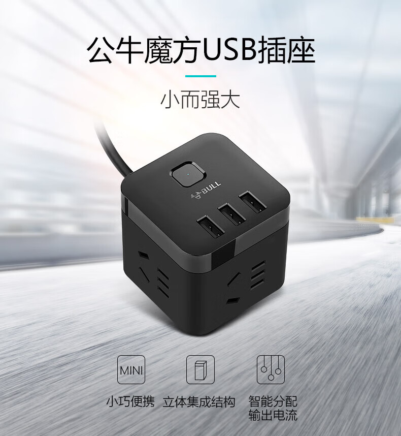公牛(BULL)魔方插座带线 一转多插排电源转换器 家用办公排插学生宿舍电源拓展器带USB插座 旅游便携式排插 1.5米【3五孔+3USB】黑色 官方pc防阻燃外壳防触电保护小巧便携