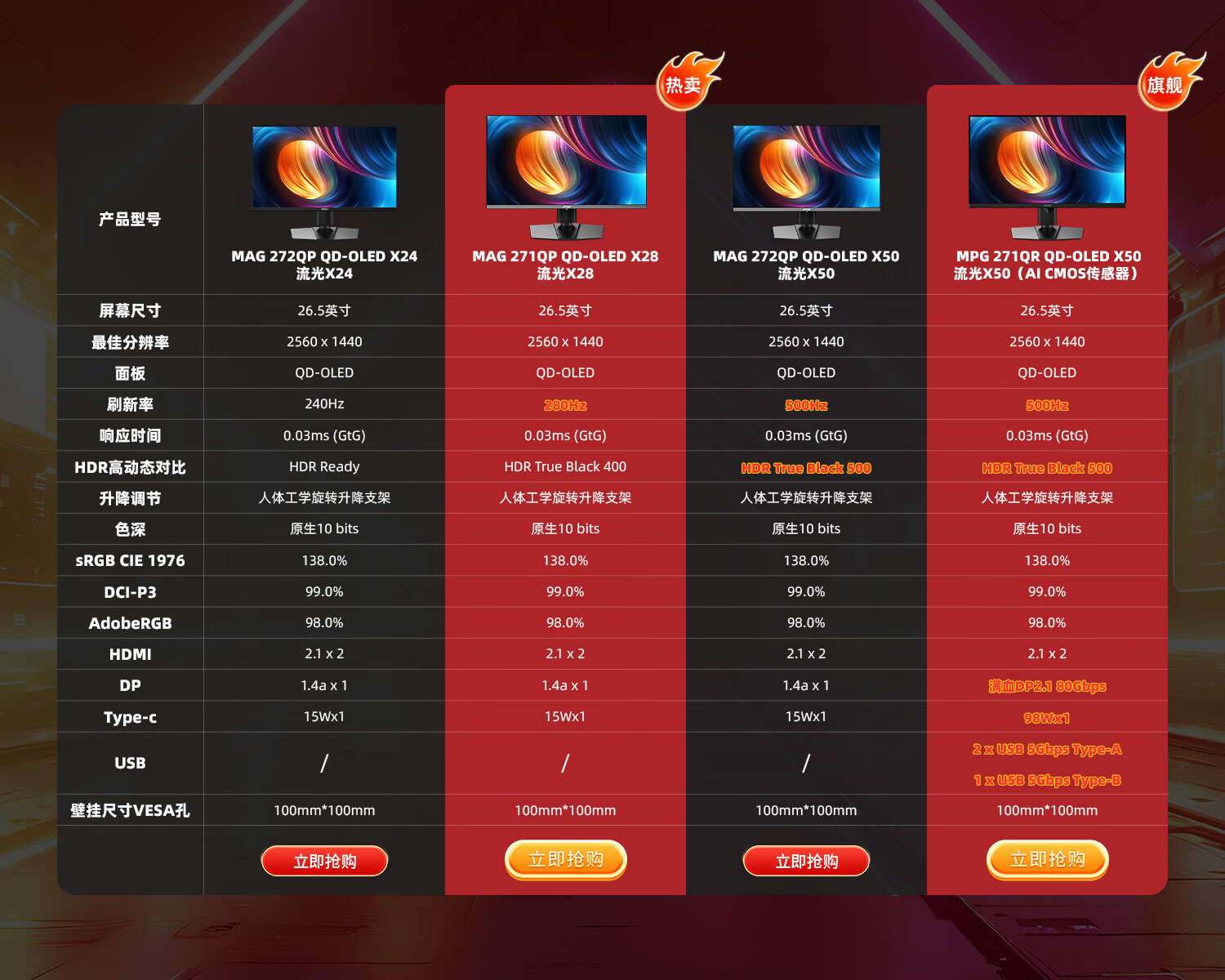 微星(MSI)27英寸2K280Hz QD-OLED显示器 0.03ms(GTG) HDR400游戏电竞显示屏MAG 271QP QD-OLED X28流光X28