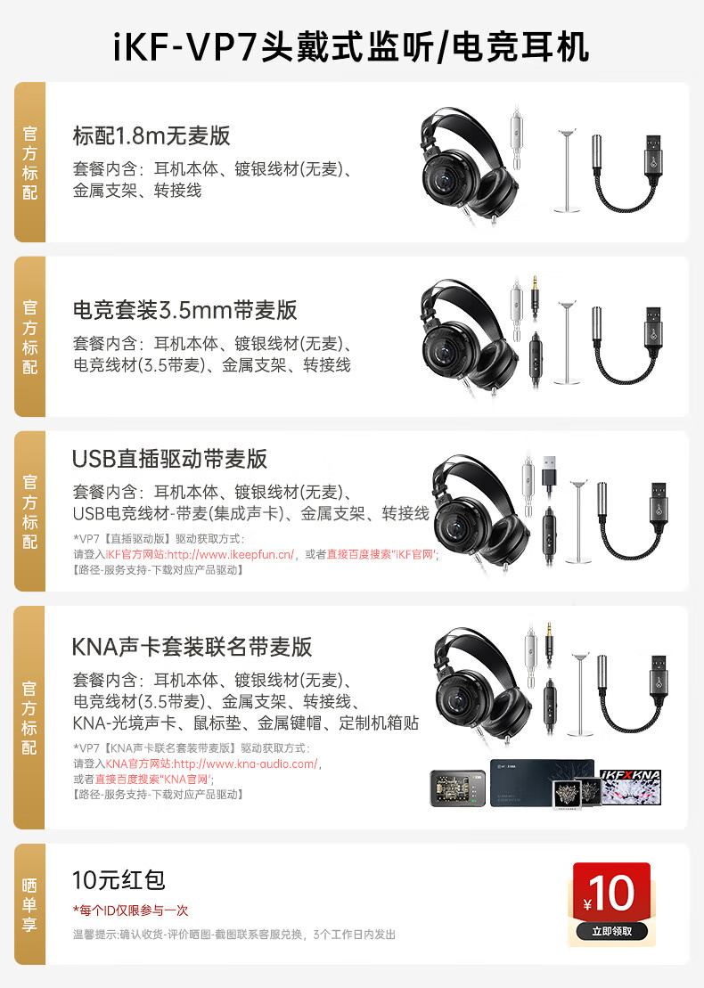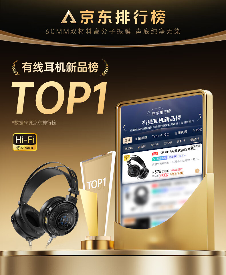 iKF VP7游戏耳机头戴式电竞耳机有线【60mmDLC双材料振膜】专业监听耳机USB口电竞声卡套件版 炭黑色