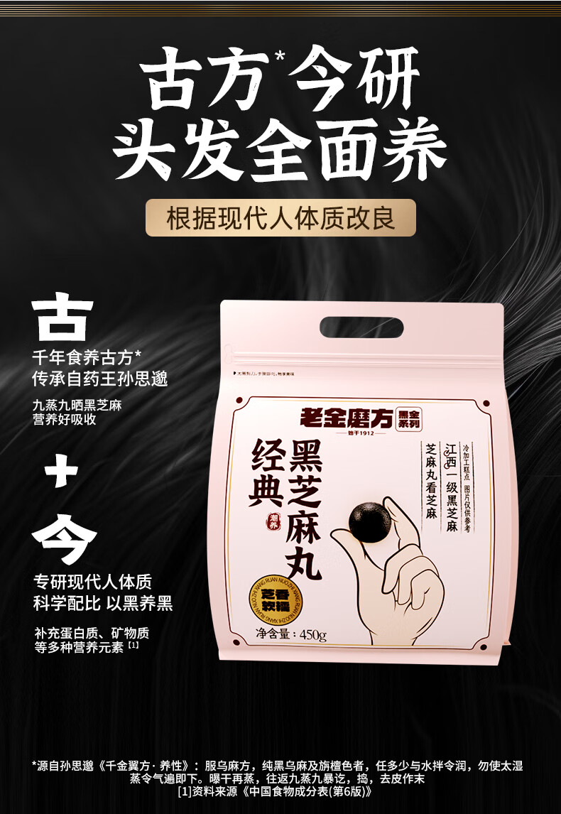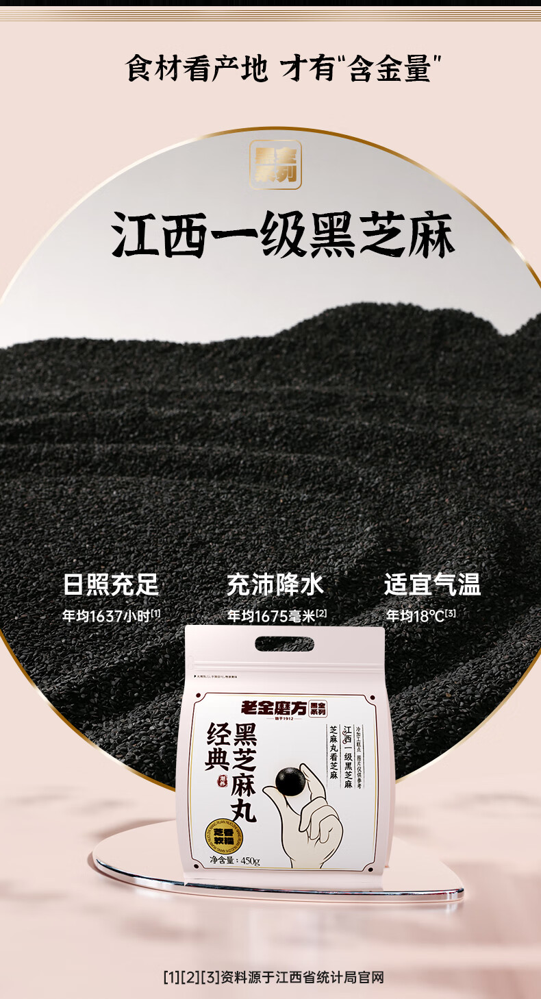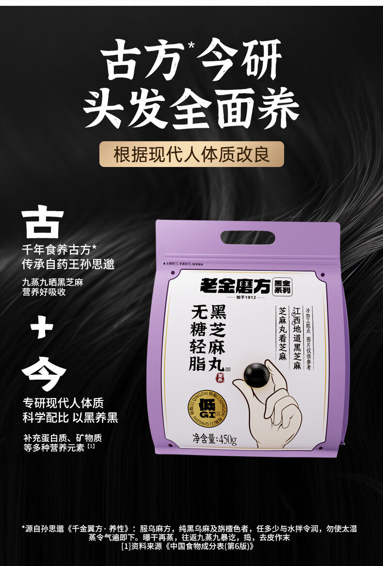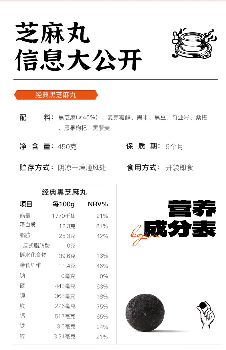 老金磨方【黑金系列】黑芝麻丸450g 九蒸九晒健康零食即食糕点 【高钙高蛋白】轻脂黑芝麻丸 450g*1袋