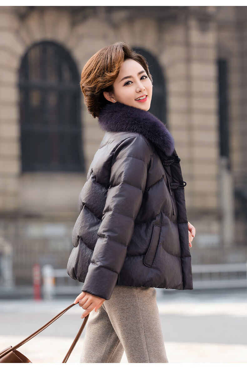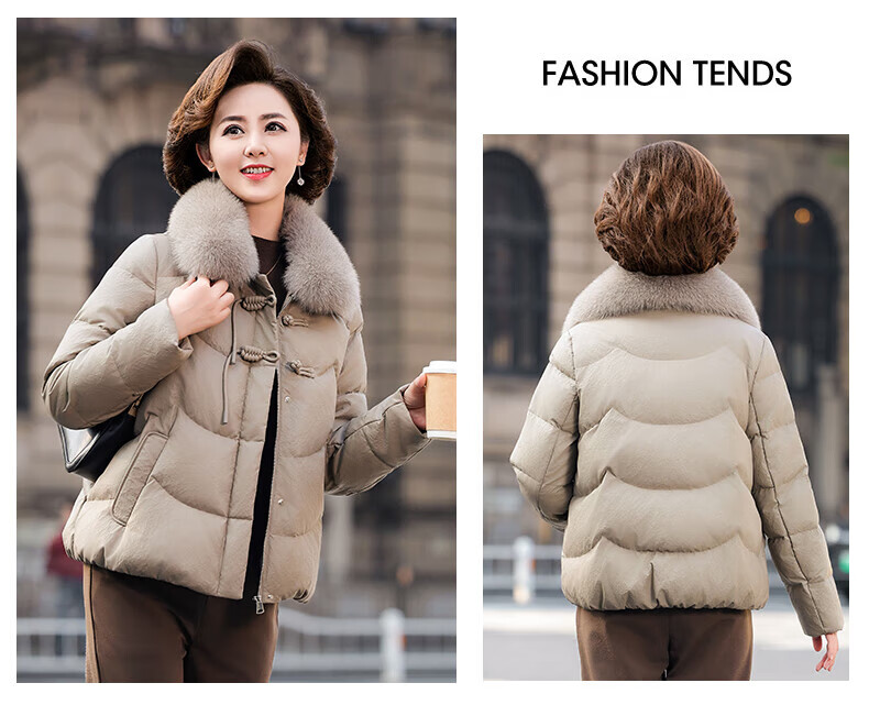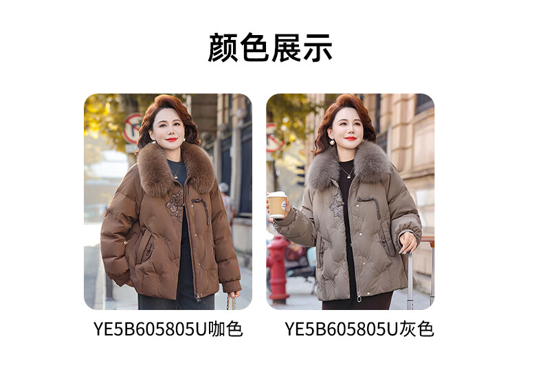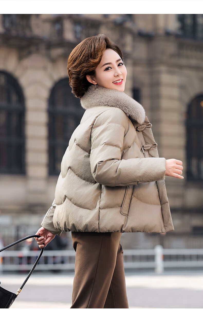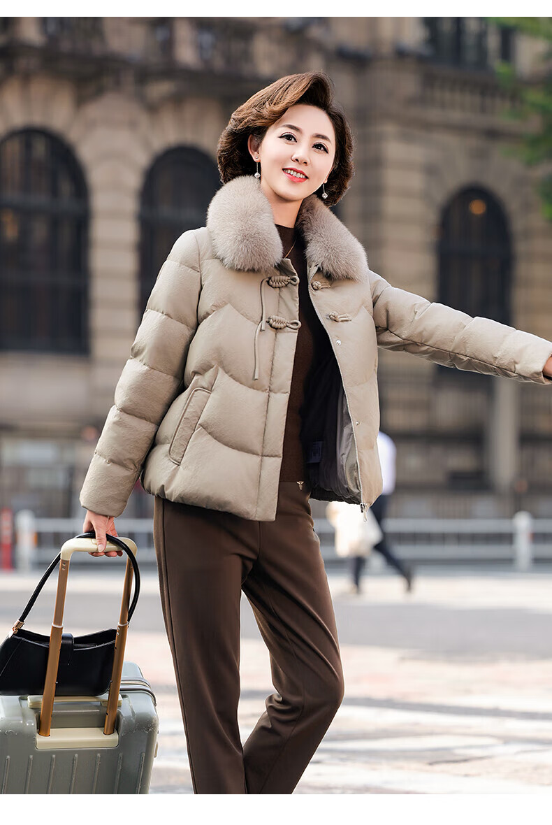 鸭鸭(YAYA)中年妈妈装羽绒服女短款狐狸毛领冬装中老年人女装加厚防寒外套 卡其灰色 2XL