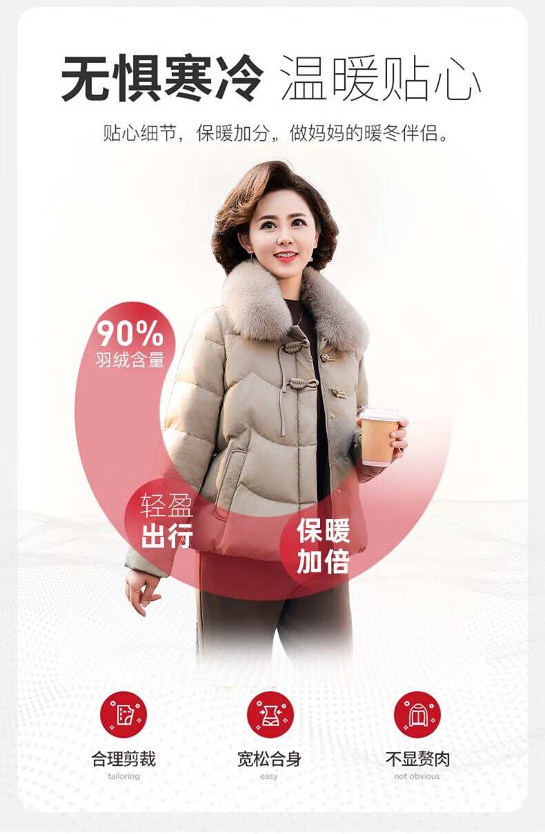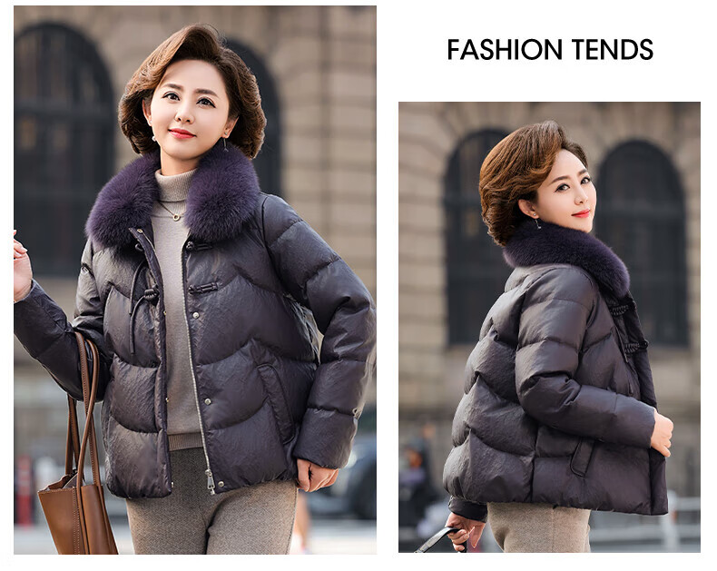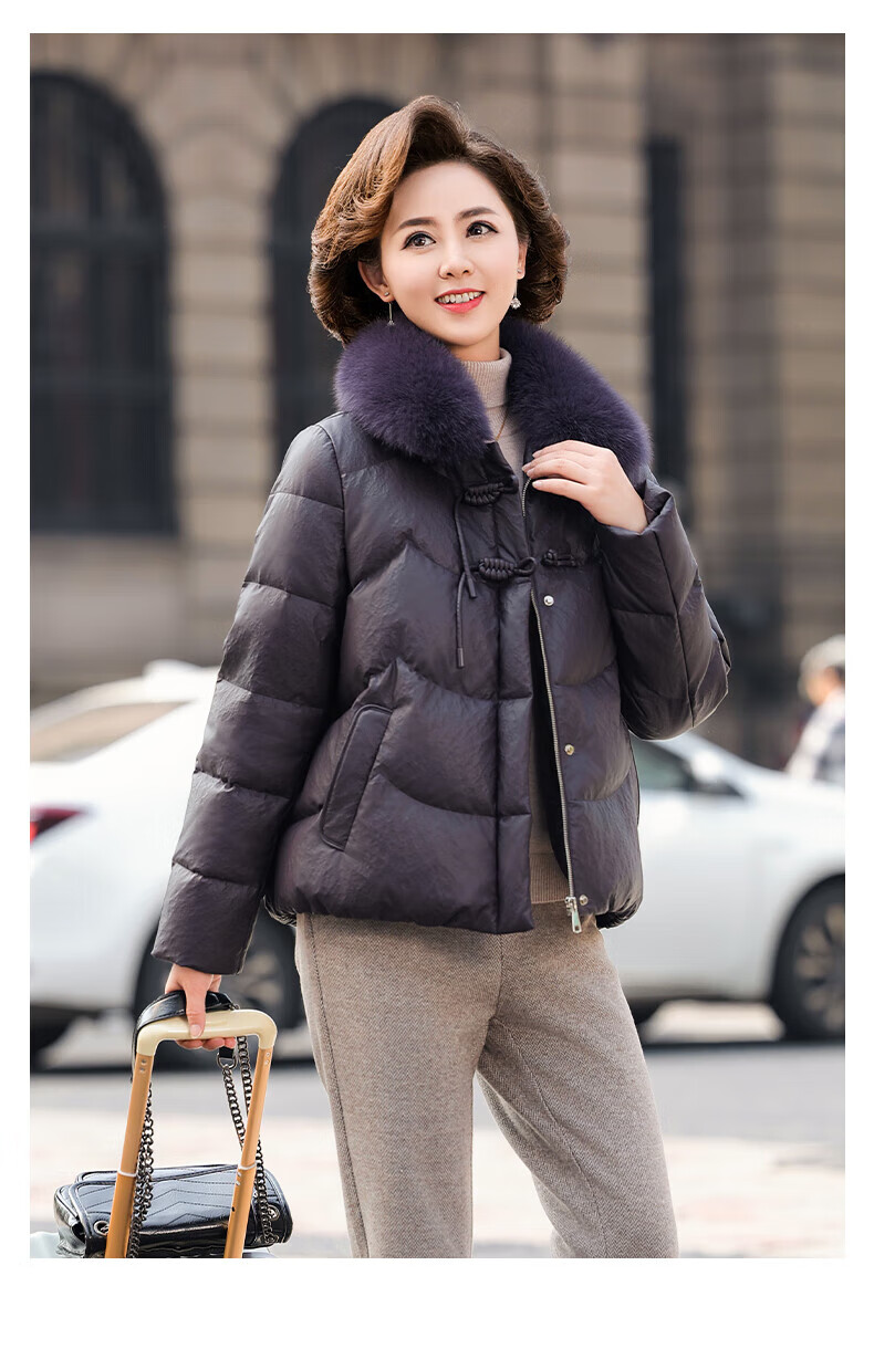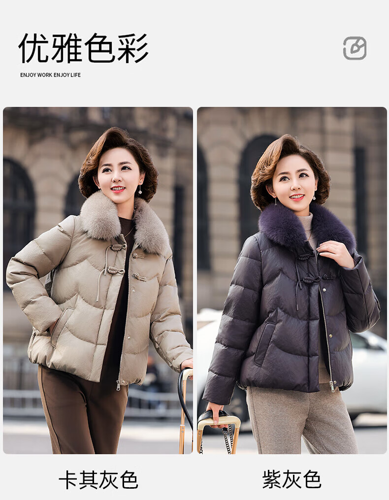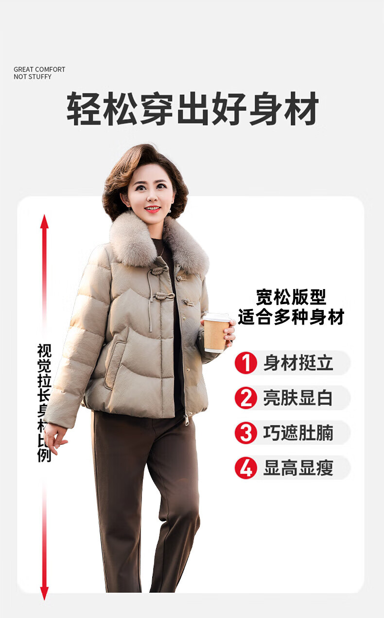 鸭鸭(YAYA)中年妈妈装羽绒服女短款狐狸毛领冬装中老年人女装加厚防寒外套 卡其灰色 2XL