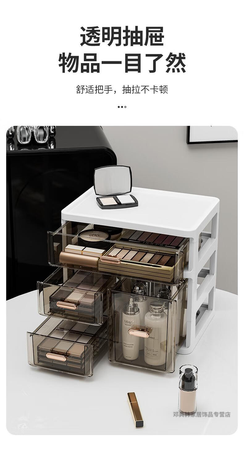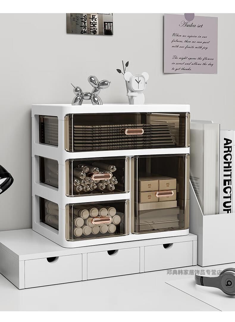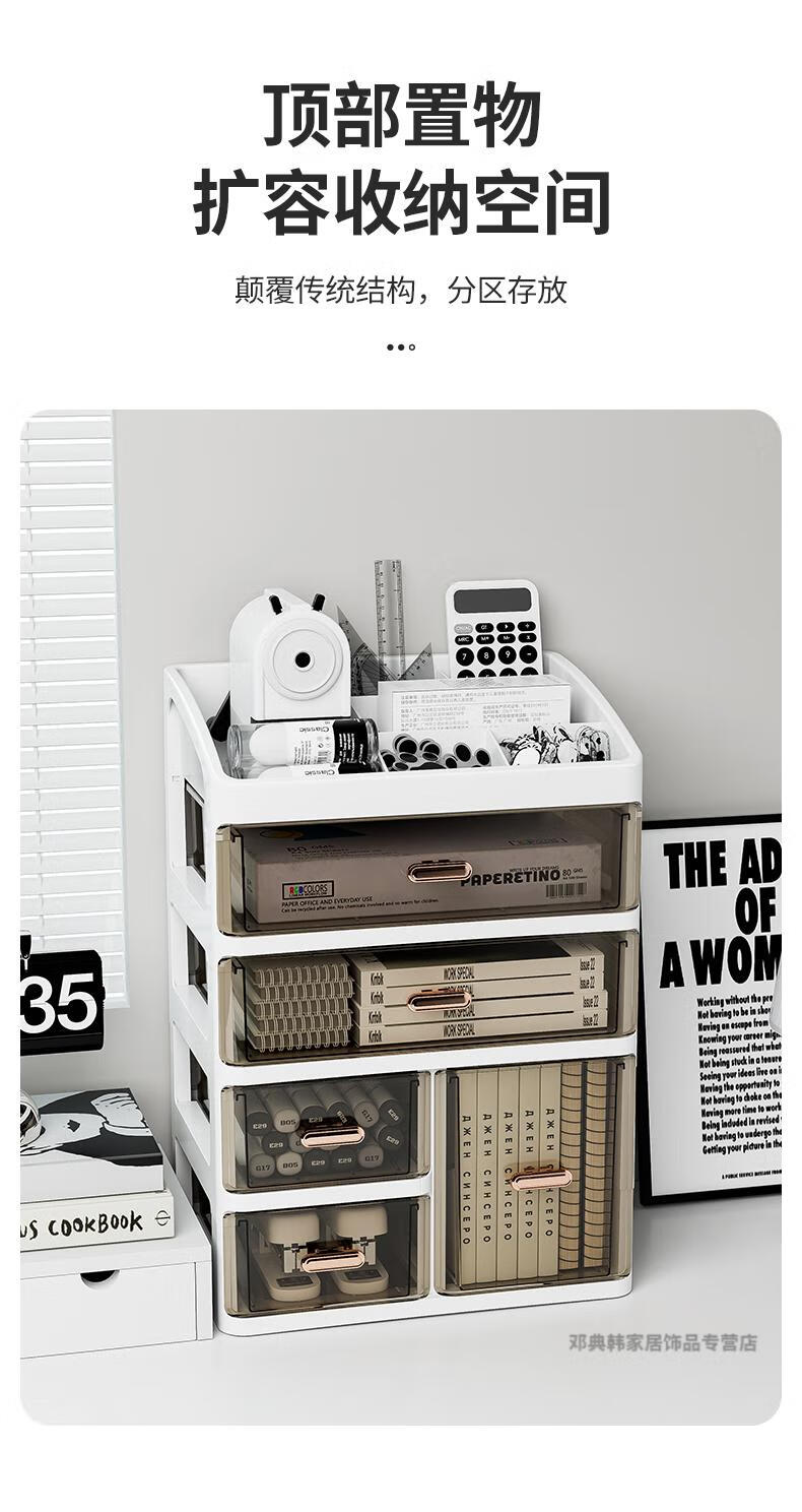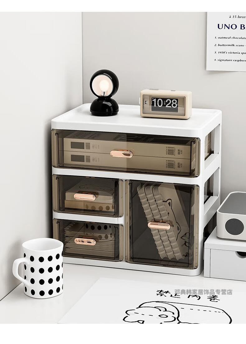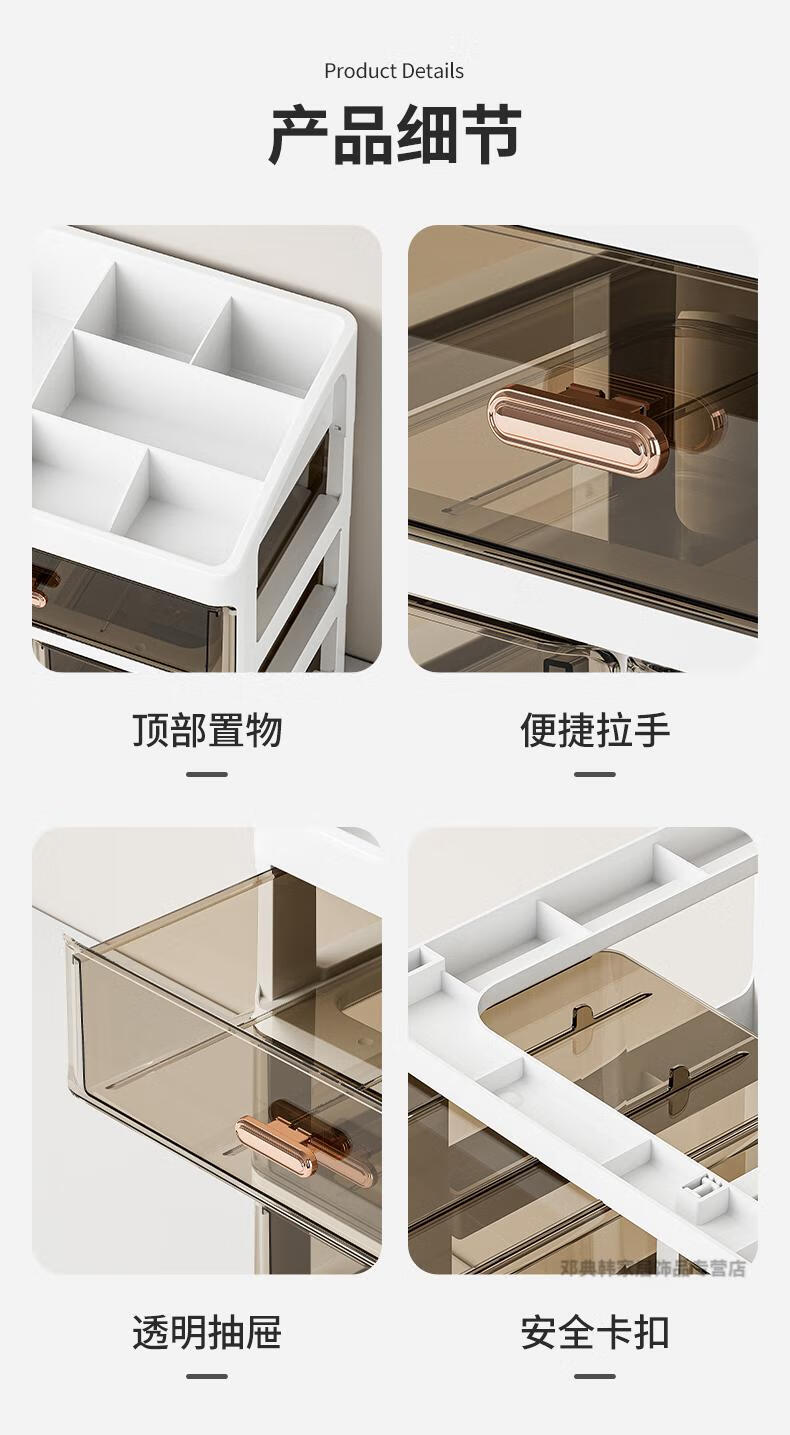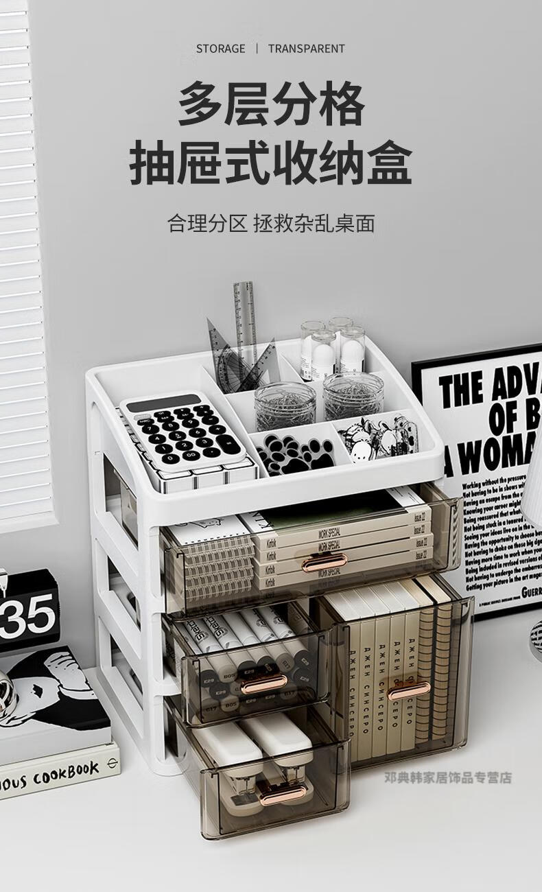DEATKN德国抽屉式桌面宿舍收纳盒书桌文具置物架多功能大容量整理神器 琥珀黑【平盖3层】甄选材质_可视抽屉
