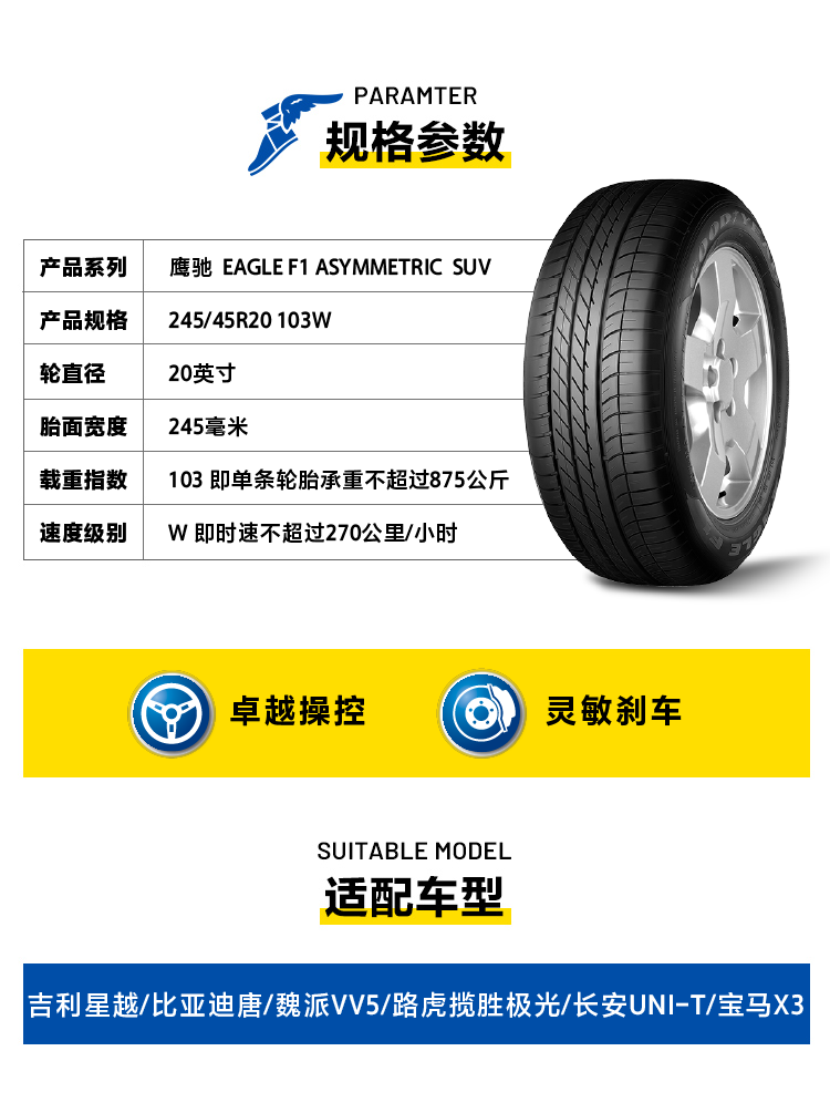 固特异(Goodyear)防爆轮胎 245/45R20 103W F1 ASY SUV 鹰驰F1 ROF原配宝马X3