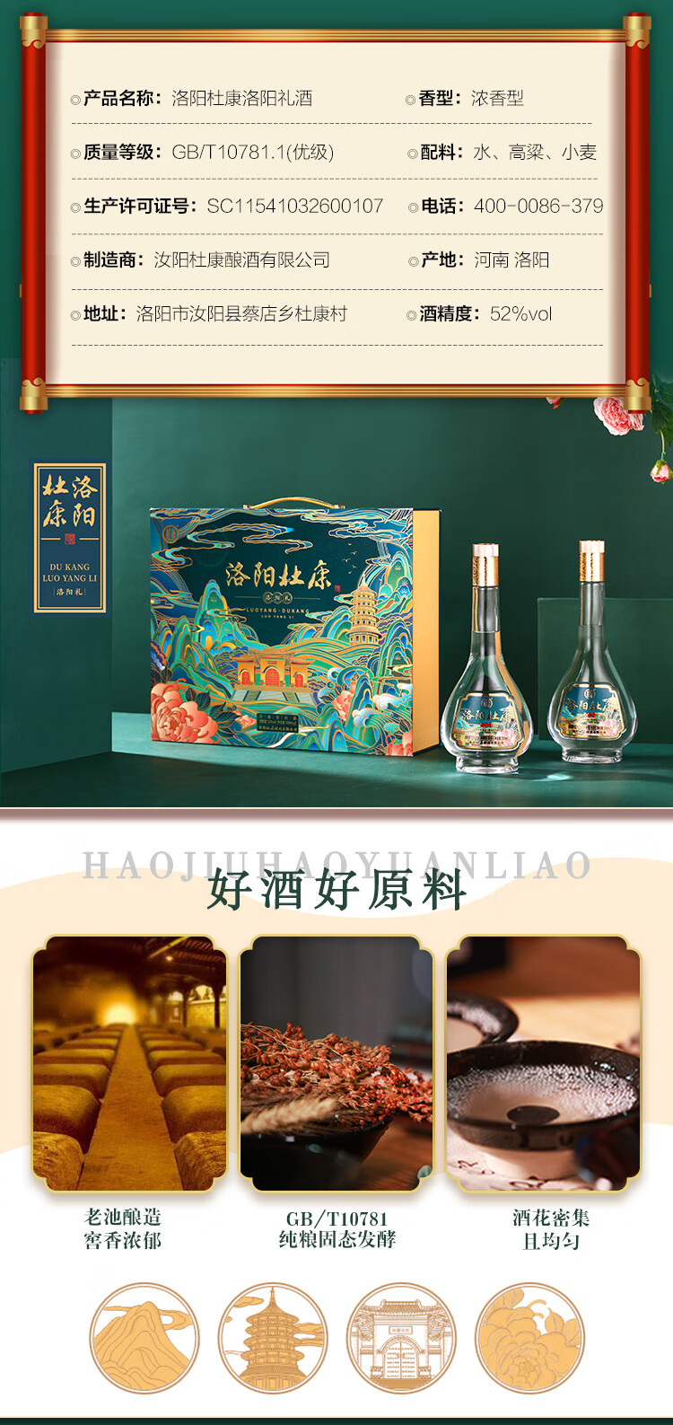 杜康洛阳礼浓香型白酒 500ml*2瓶52度双支礼盒纯粮食酒送礼 52度 500mL 2瓶 礼盒装