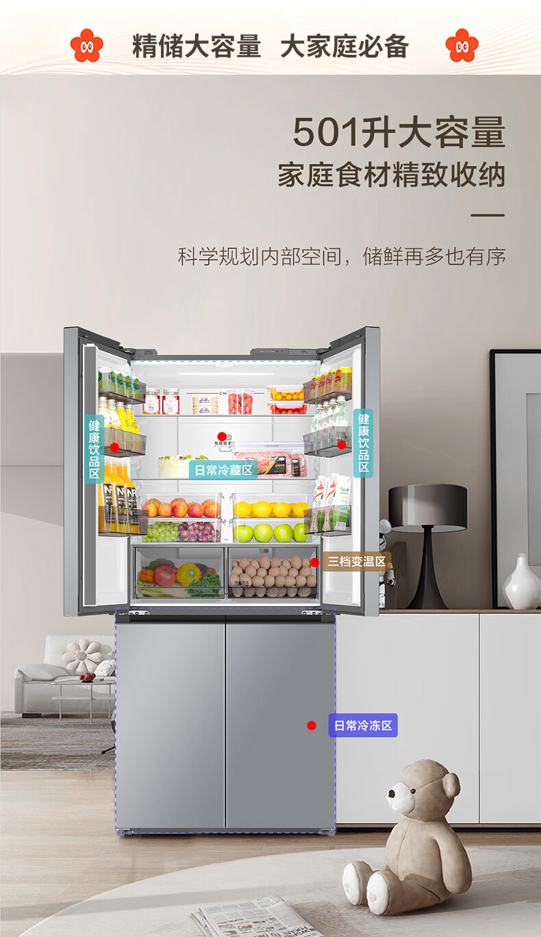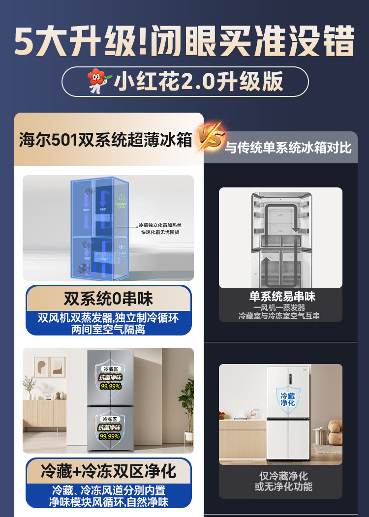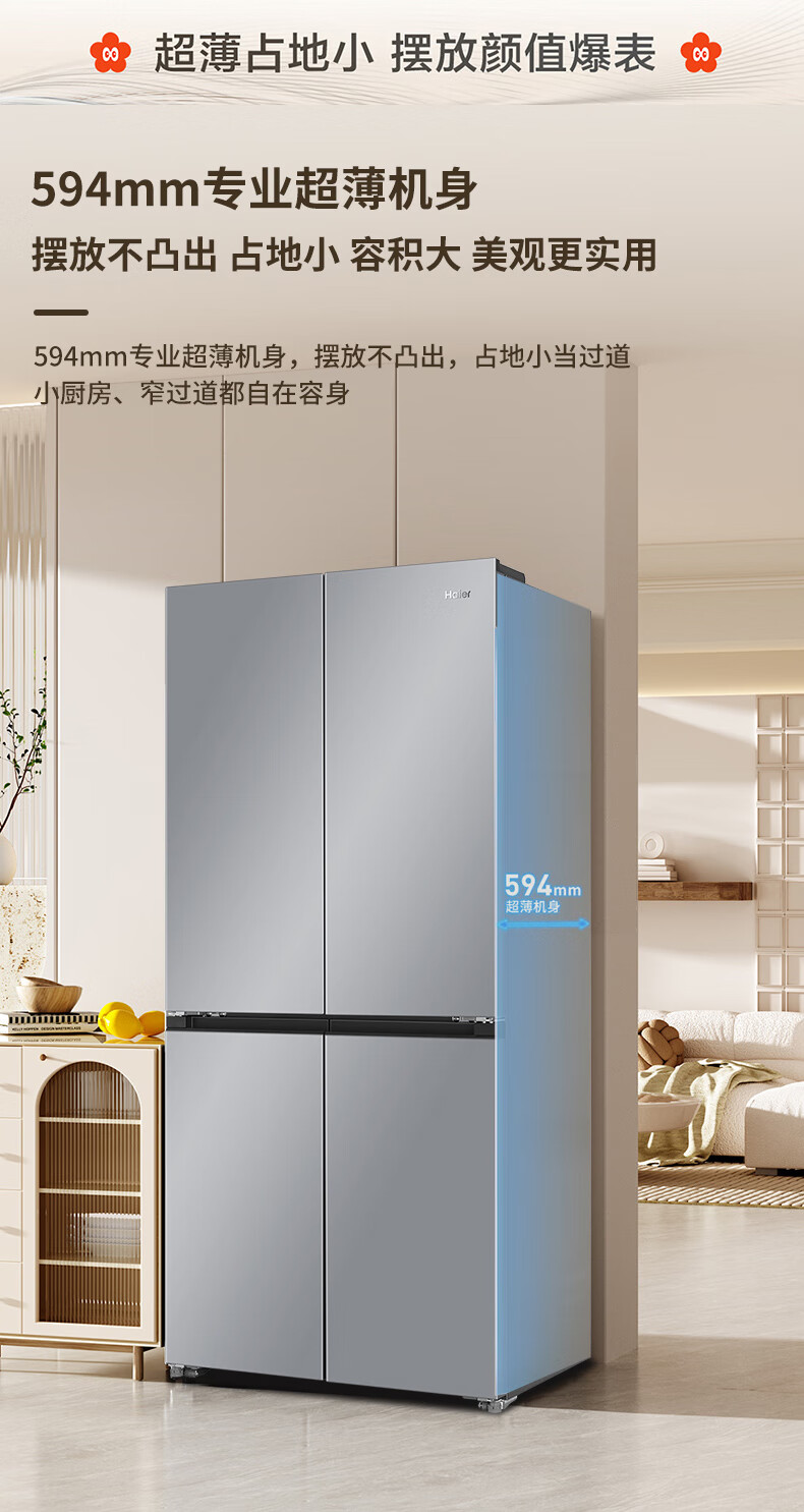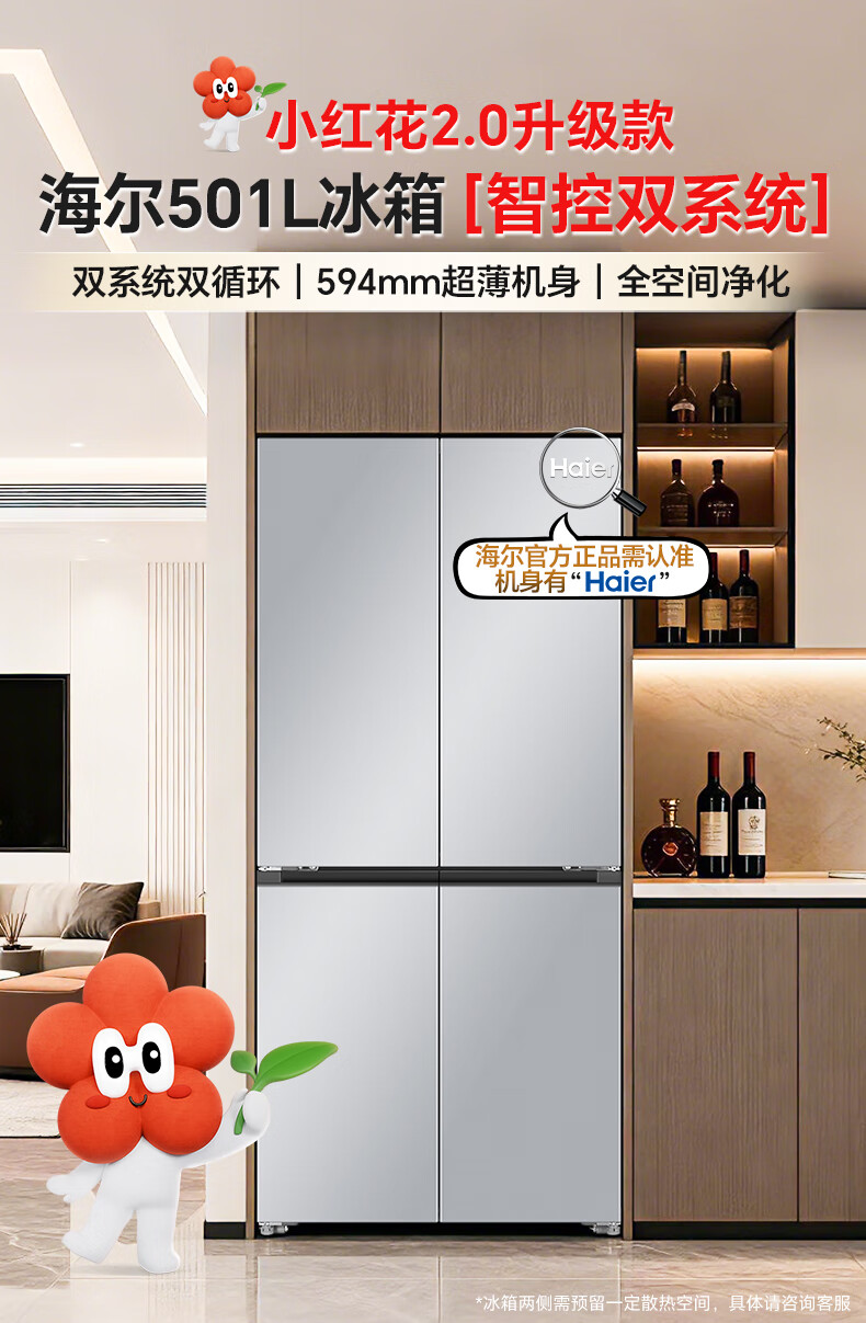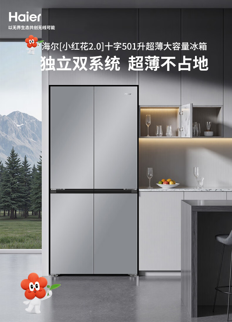 海尔(Haier)冰箱「小红花2.0升级款」501升双系统双循环超薄十字四开门一级能效国家补贴家用嵌入式冰箱山茶花 501升双系统双循环丨594mm超薄丨全空间净化