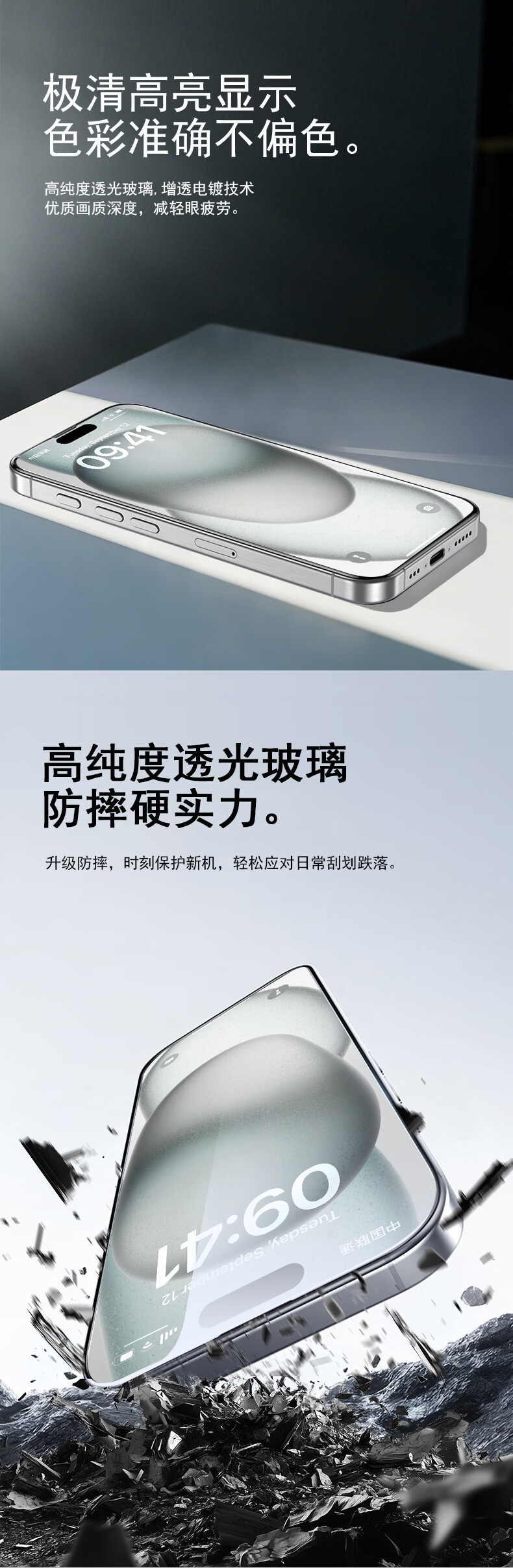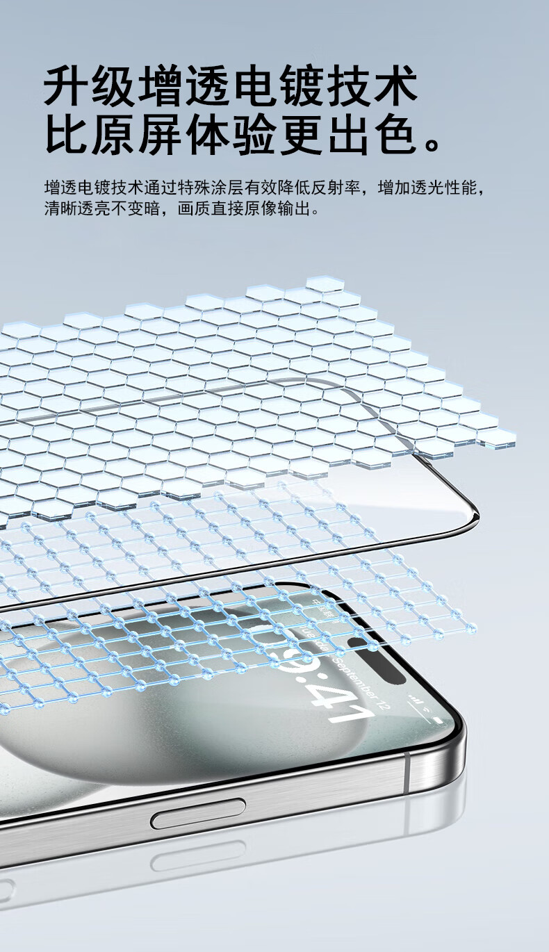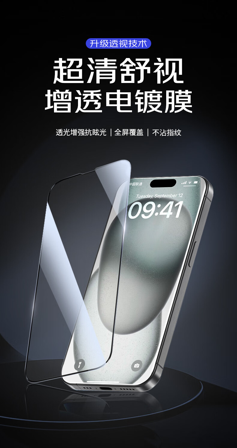 ALittleFlower【AR增透抗反光】适用iPhone15钢化膜苹果15手机膜AR增透全屏覆盖防摔防指纹高清保护贴膜2片+神器