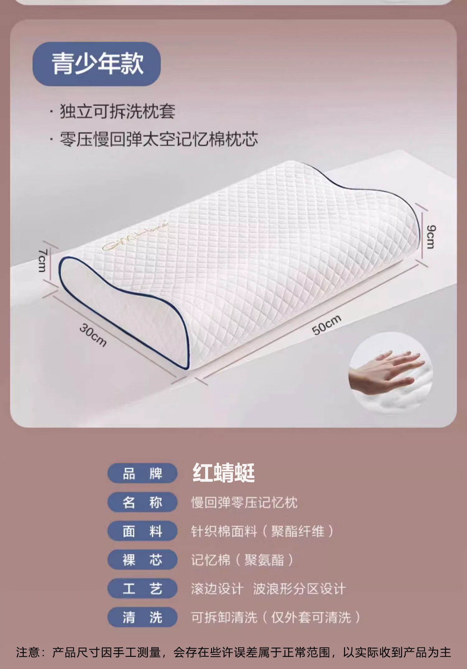 红蜻蜓可拆洗记忆枕枕头护颈枕睡眠颈椎病深度睡觉专用记忆棉枕芯一对 记忆棉-青少年款30*50 【单只装】 7cm-10cm