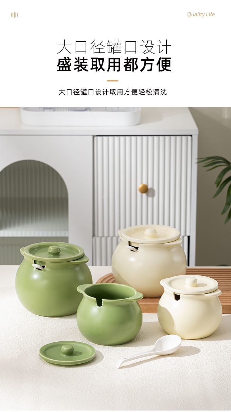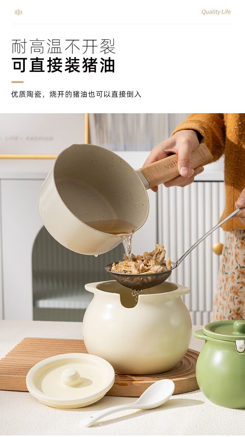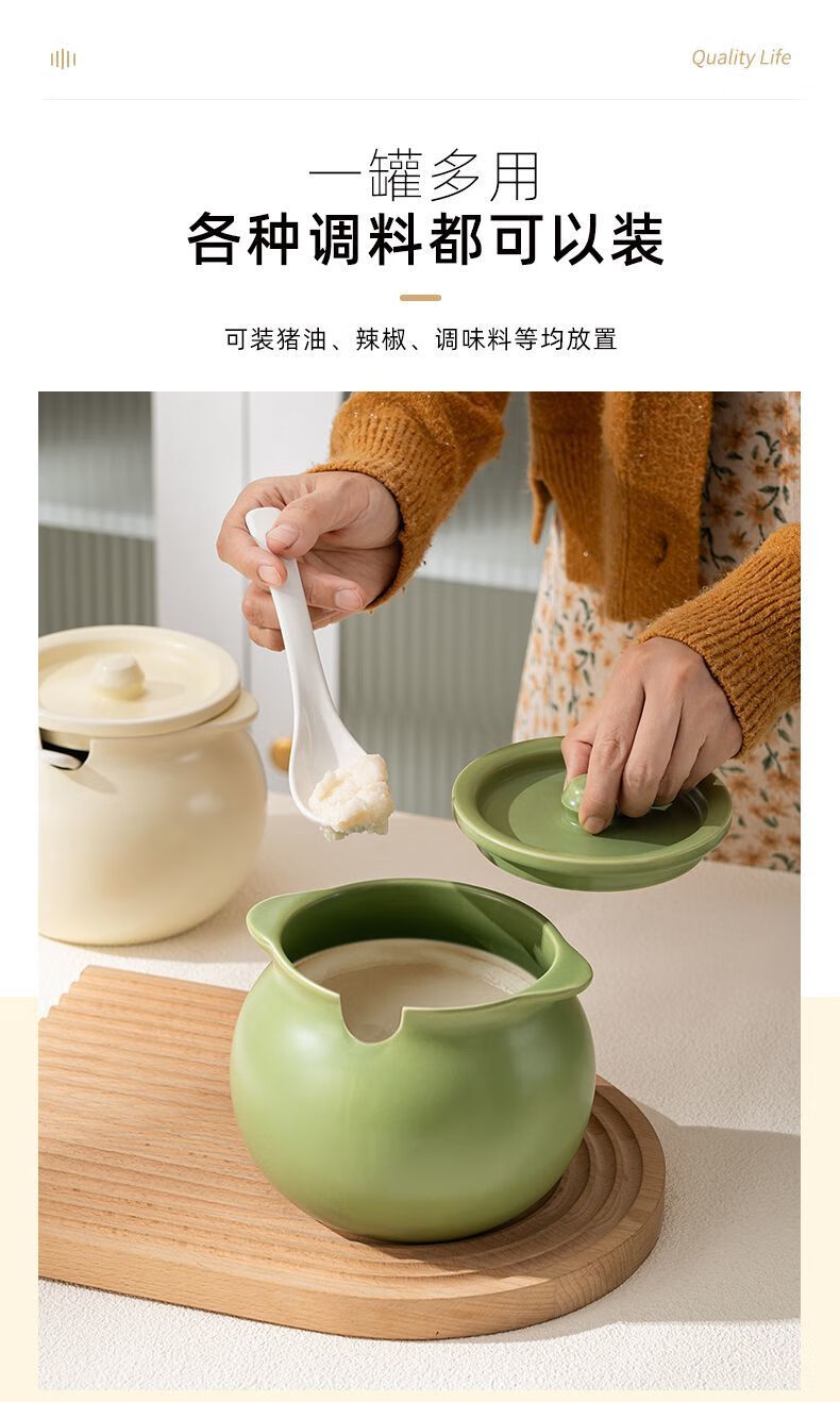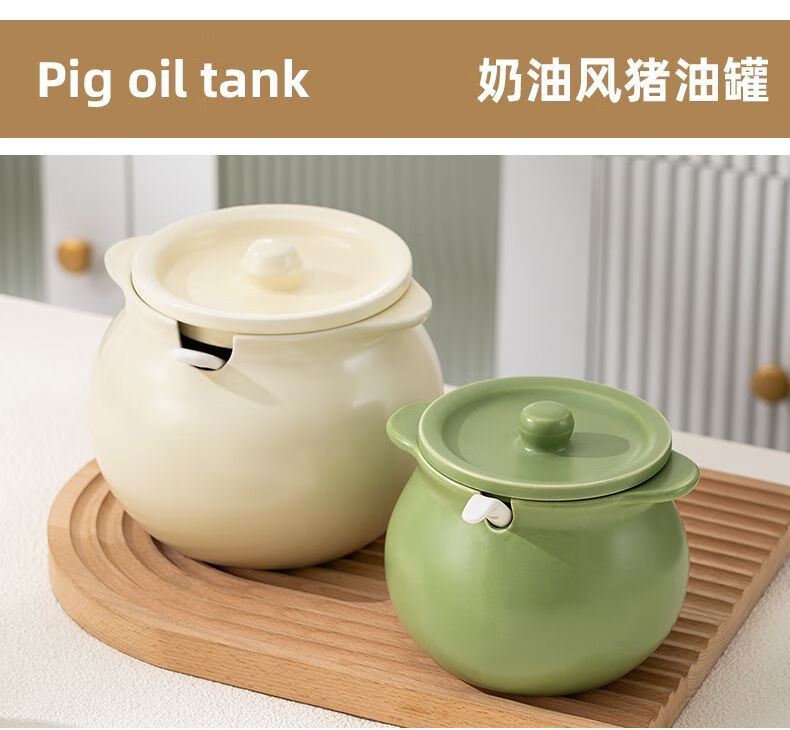咏夏陶瓷猪油罐家用耐高温带盖荤油罐盆厨房装油罐的容器辣椒罐专用罐 奶油绿-小号/750毫升(微瑕)