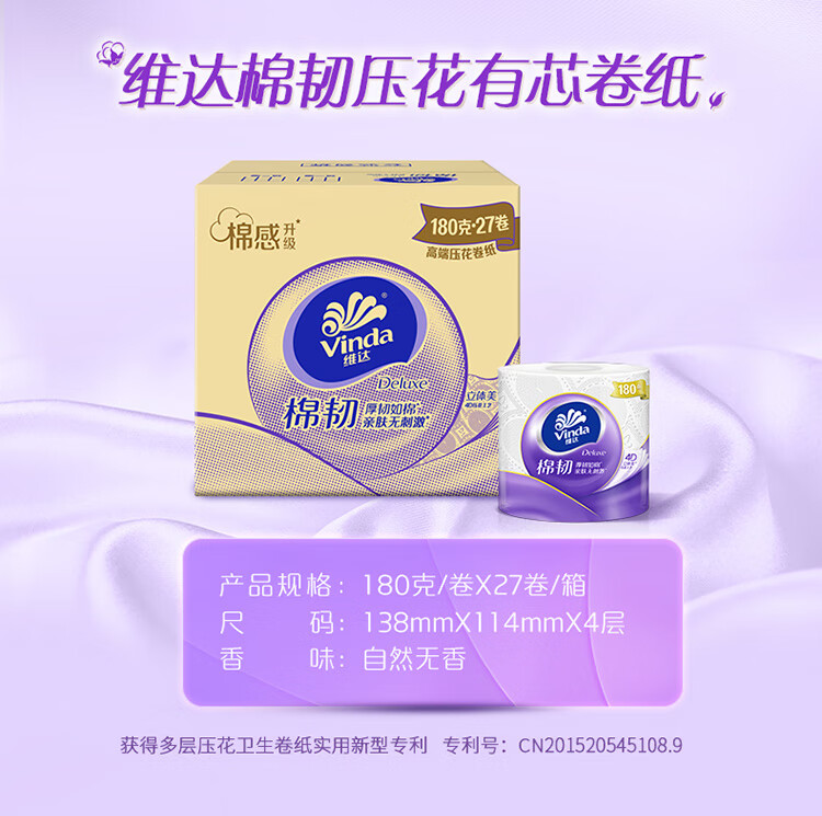 维达(Vinda)有芯卷纸 棉韧4层180克*27卷 卫生纸 大分量卷筒纸 整箱