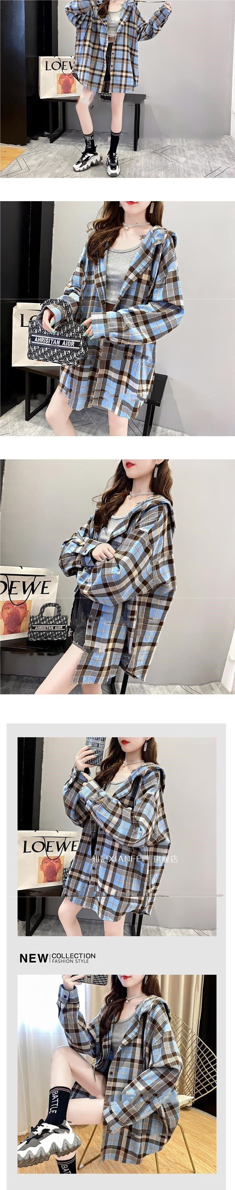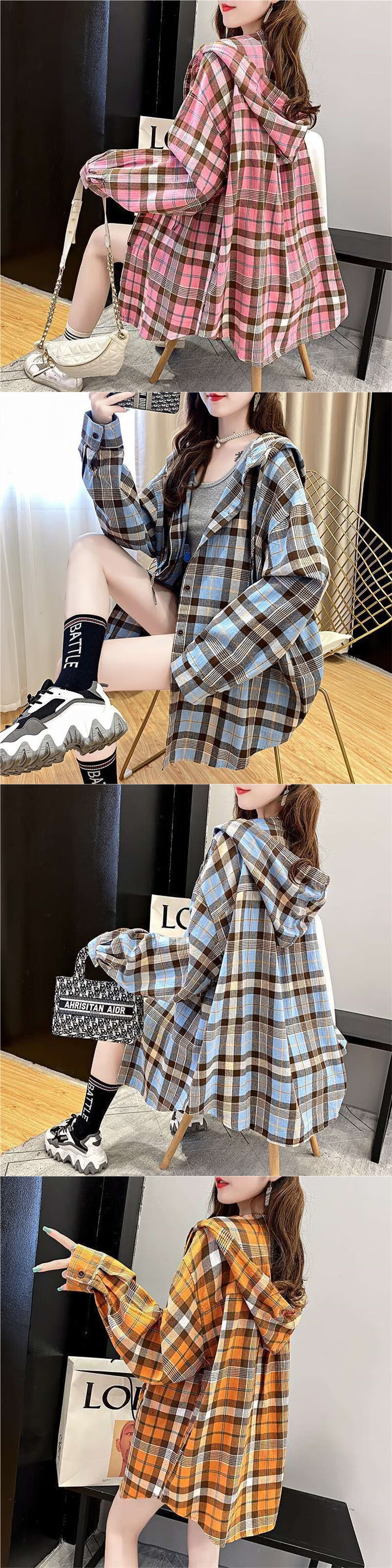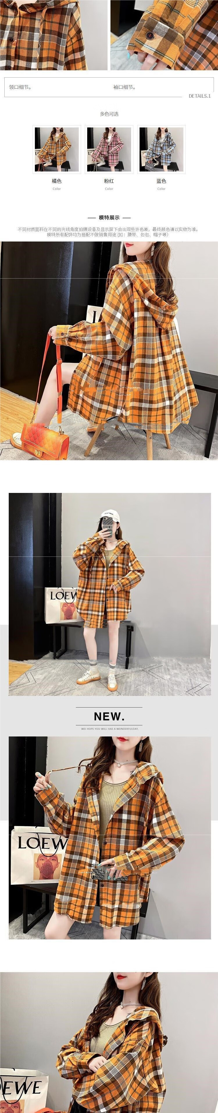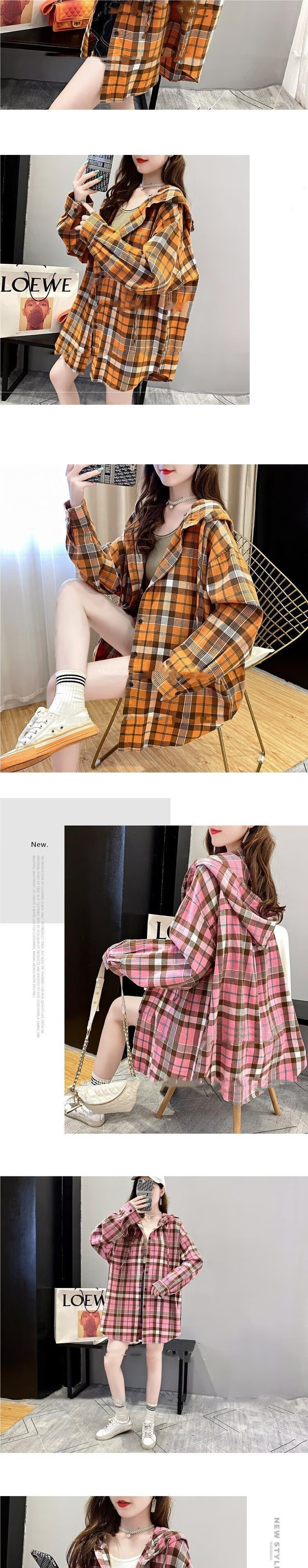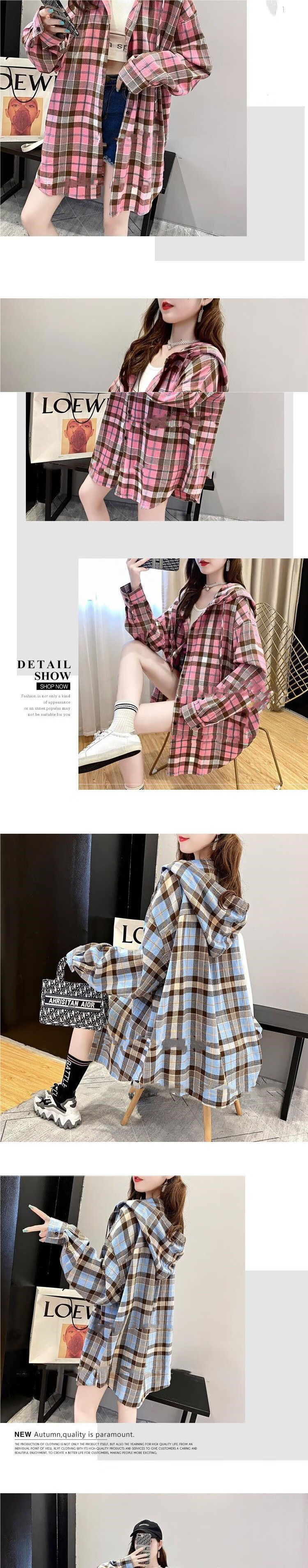 连帽春秋2024年新款复古港味撞色格子磨毛宽松衬衫女潮外套韩版 粉红色 薄款 XL 【建议130-145斤左右】